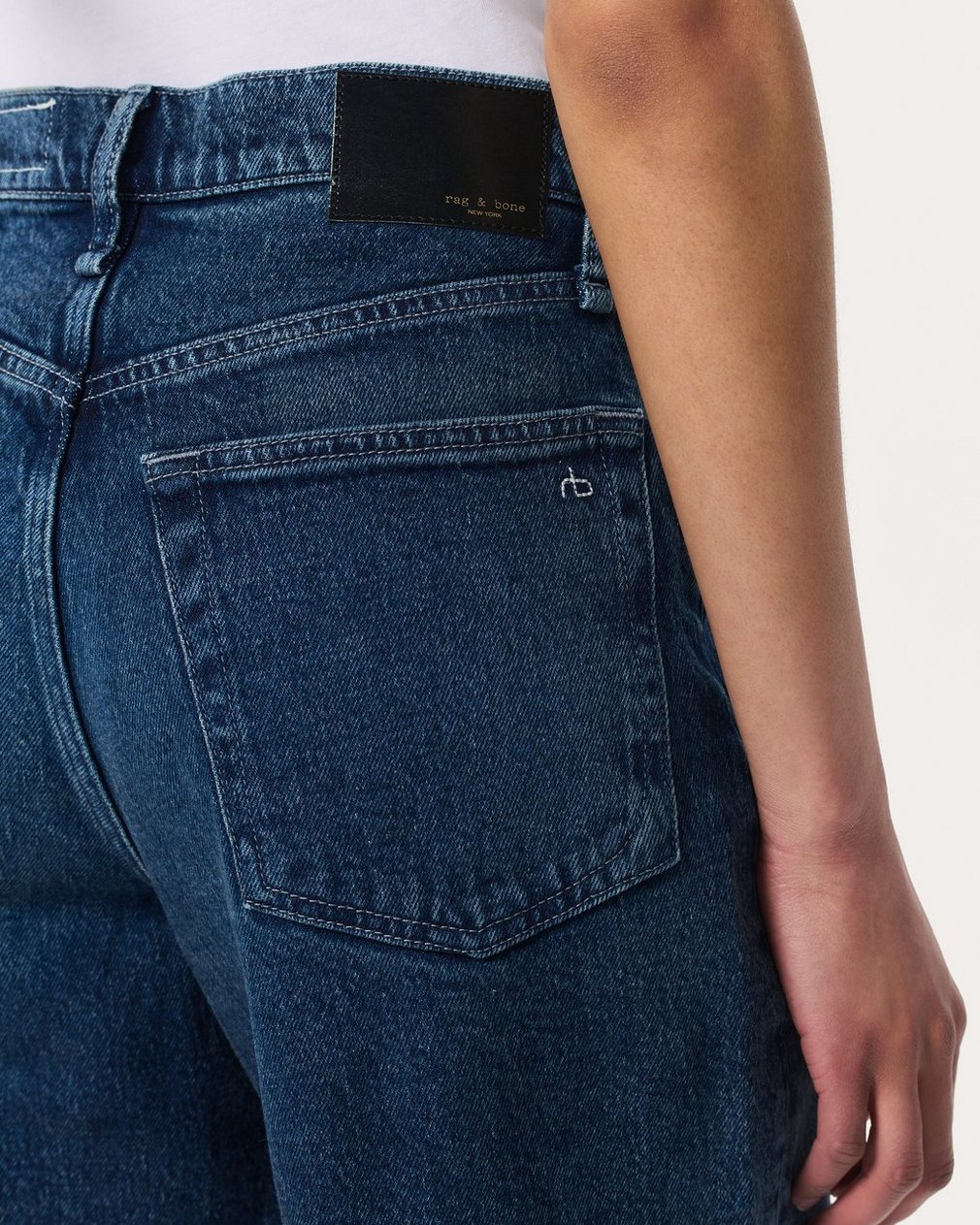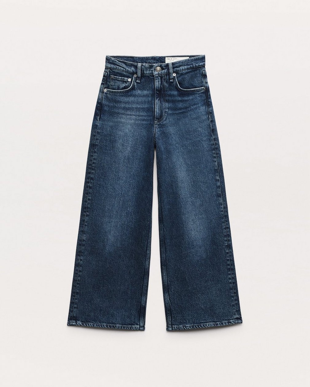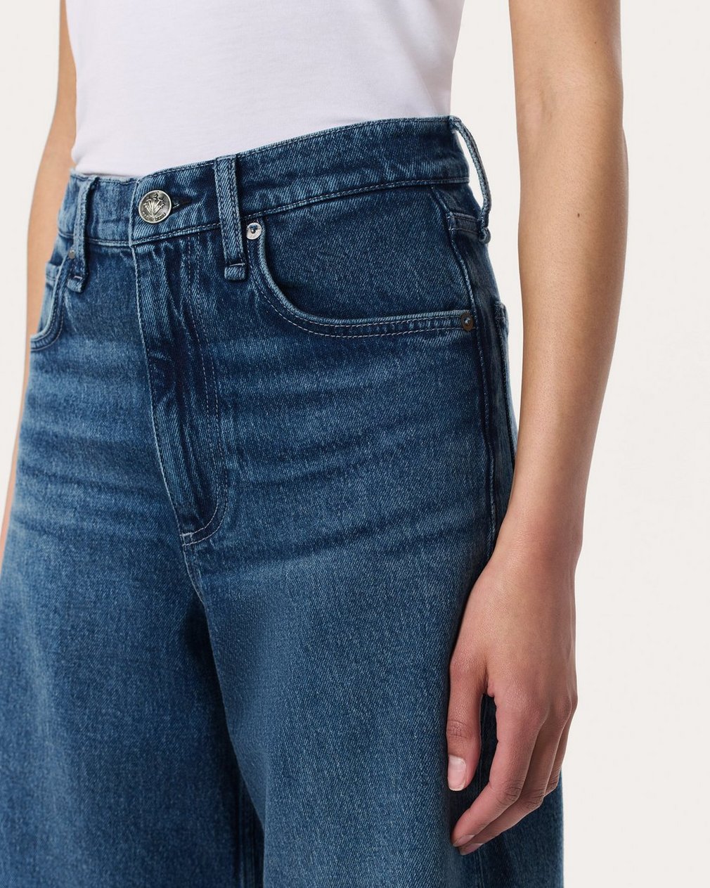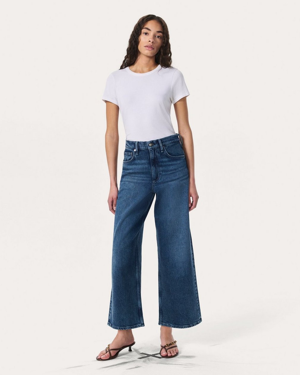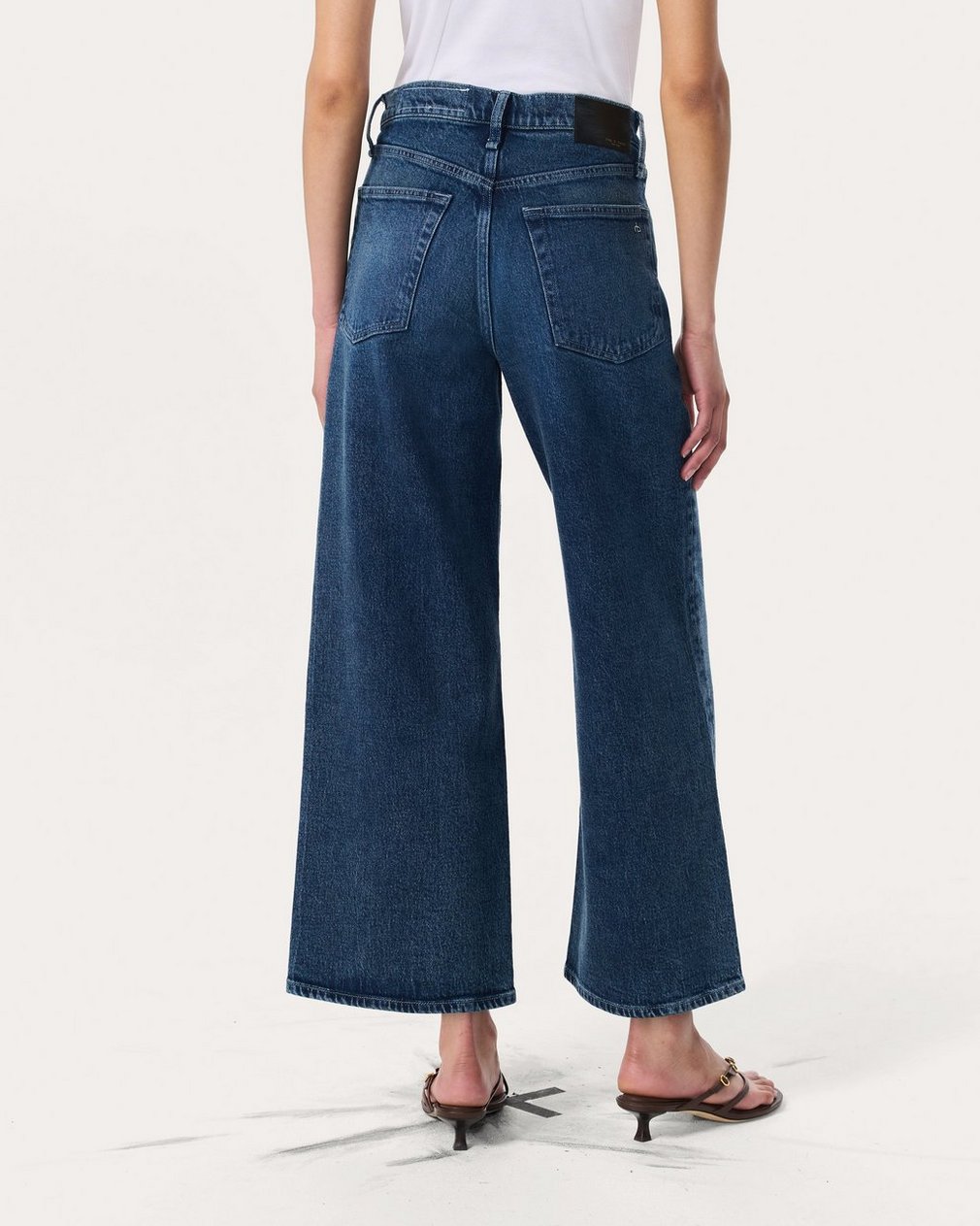The Andi. High-waisted jeans that are fitted through the thighs with wide, cropped legs. Crafted from our Vintage Stretch denim for a broken-in look & feel with a comfortable touch of stretch. In Adeline, a medium indigo wash with the perfect whiskering.