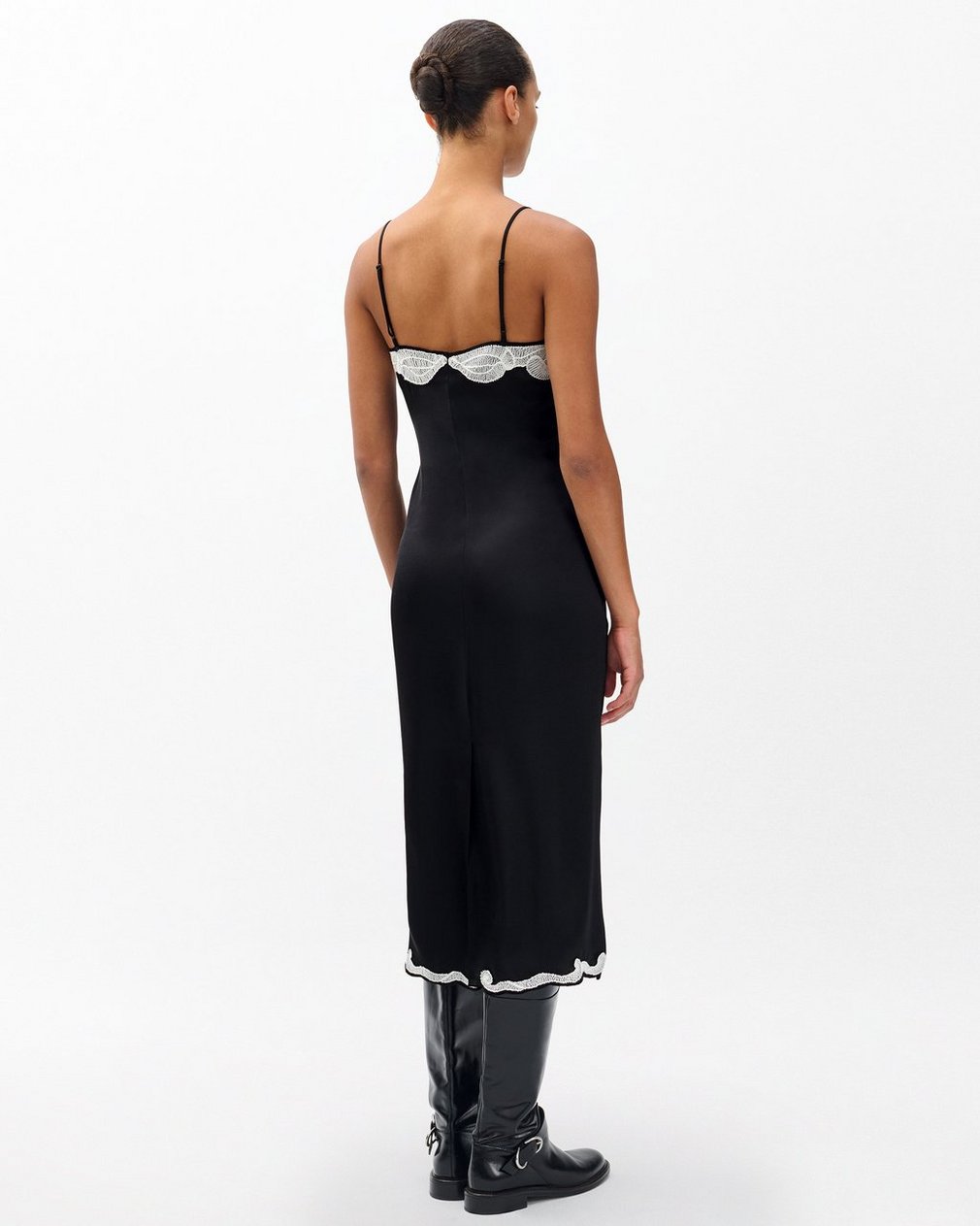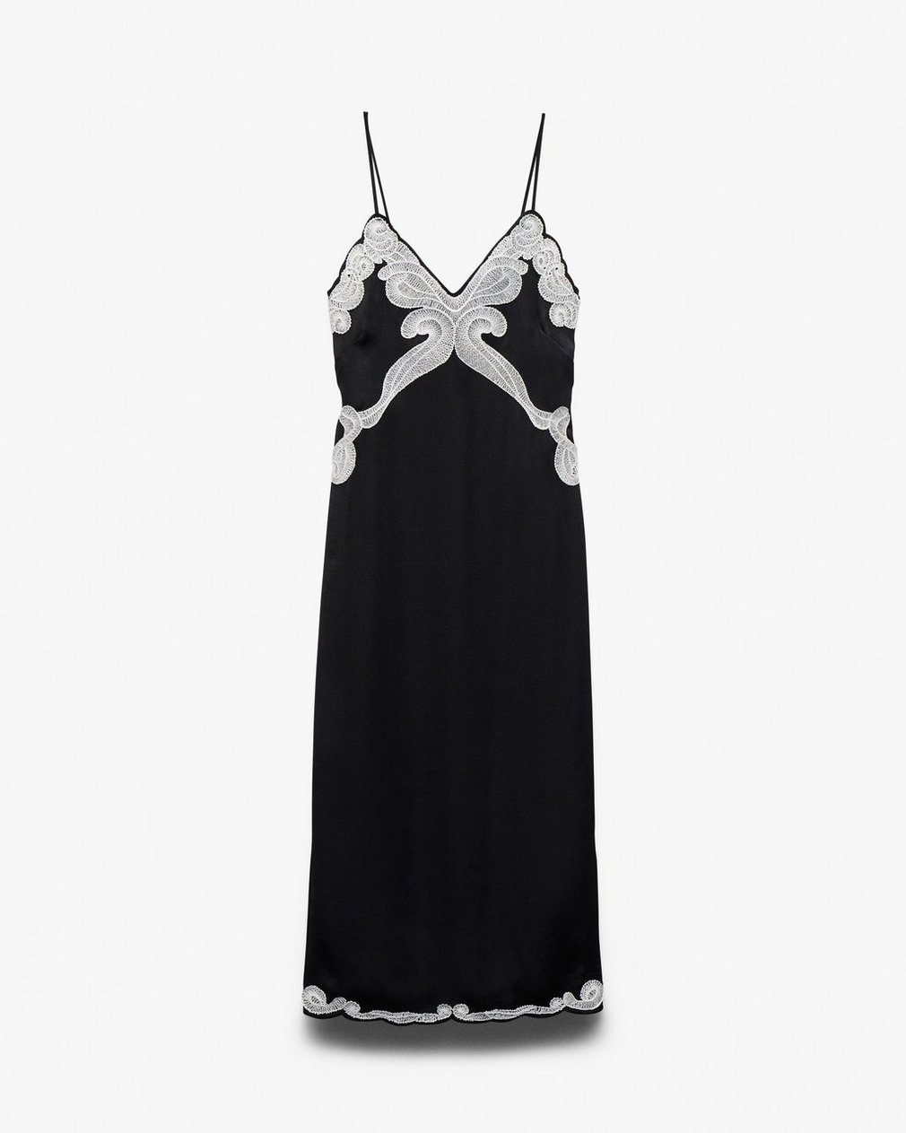 A slip with some attitude. This twist on the classic silhouette is cut from lightweight satin that moves like liquid and is trimmed with custom lace embroidery at the bodice and hem. The midi length hits just right to wear with heeled sandals or high boots.