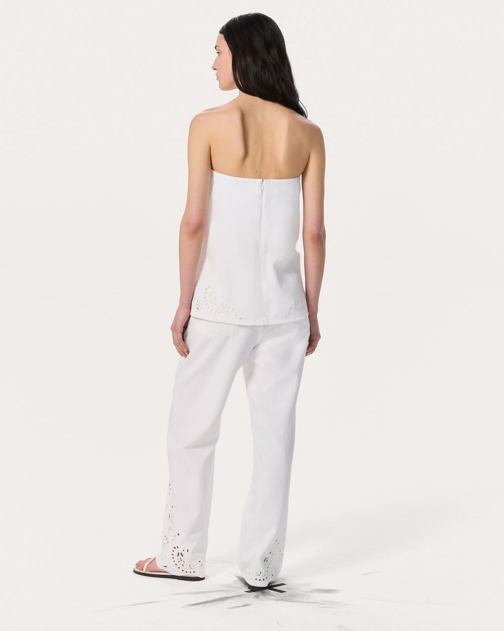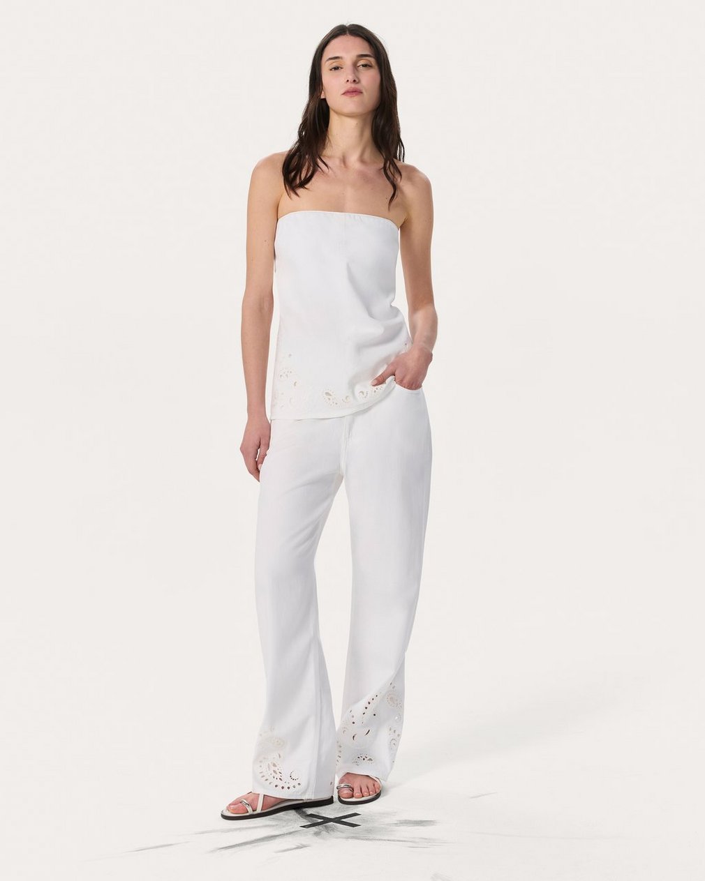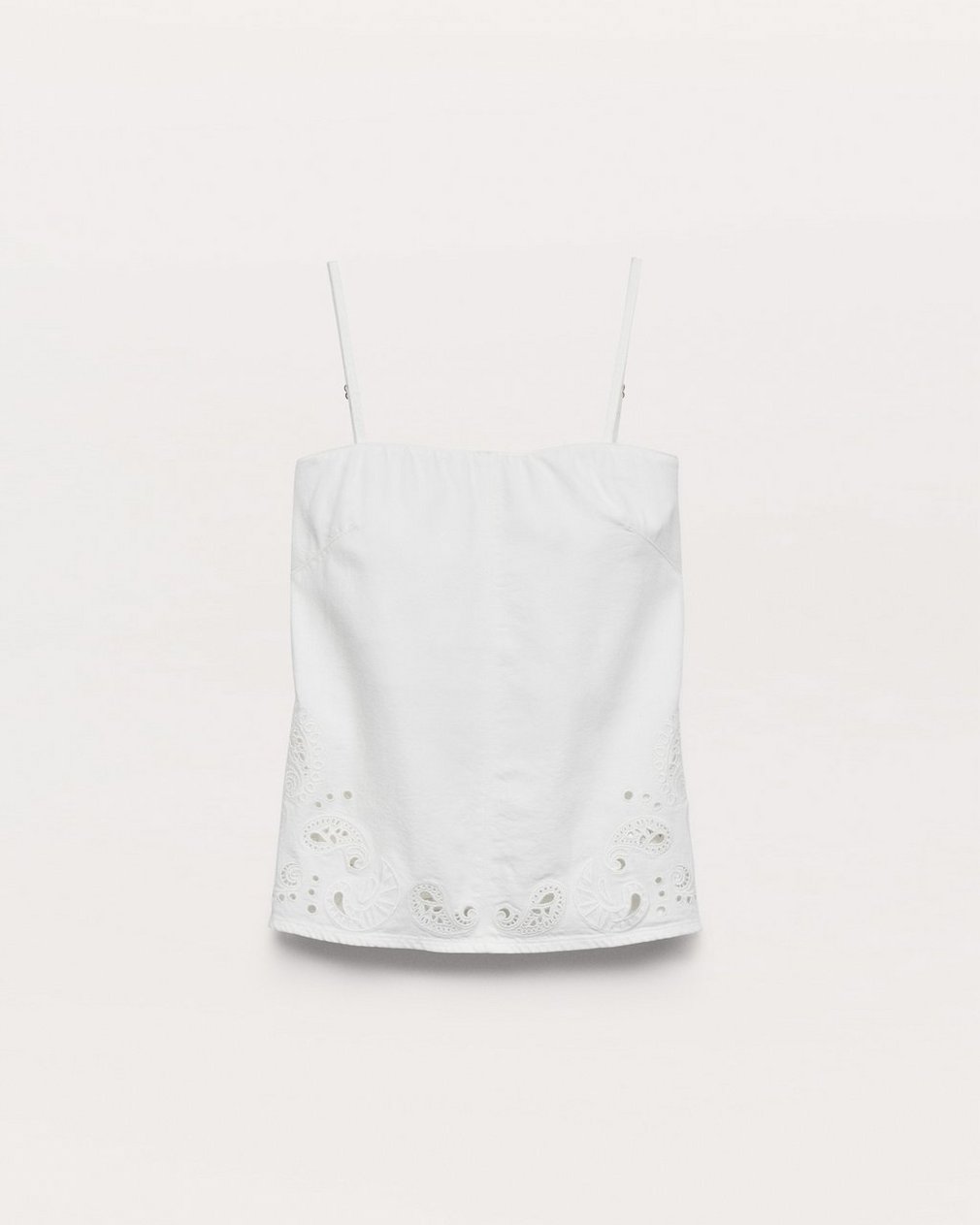 The perfect blend of casual and chic. An effortless jean top that combines a relaxed A-line silhouette with adjustable, removable straps and an internal shelf bra for added comfort. Updated for the season in Ultra Featherweight, the lightest version of our supremely soft and airy denim with an effortless drape. In White Eyelet, a clean white wash featuring cutout paisley patterns embroidered at the sides and hem.