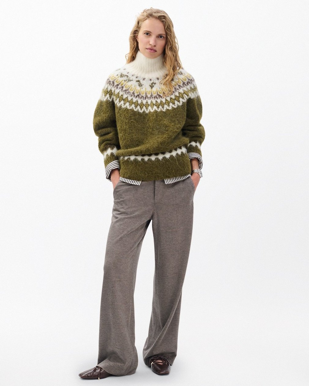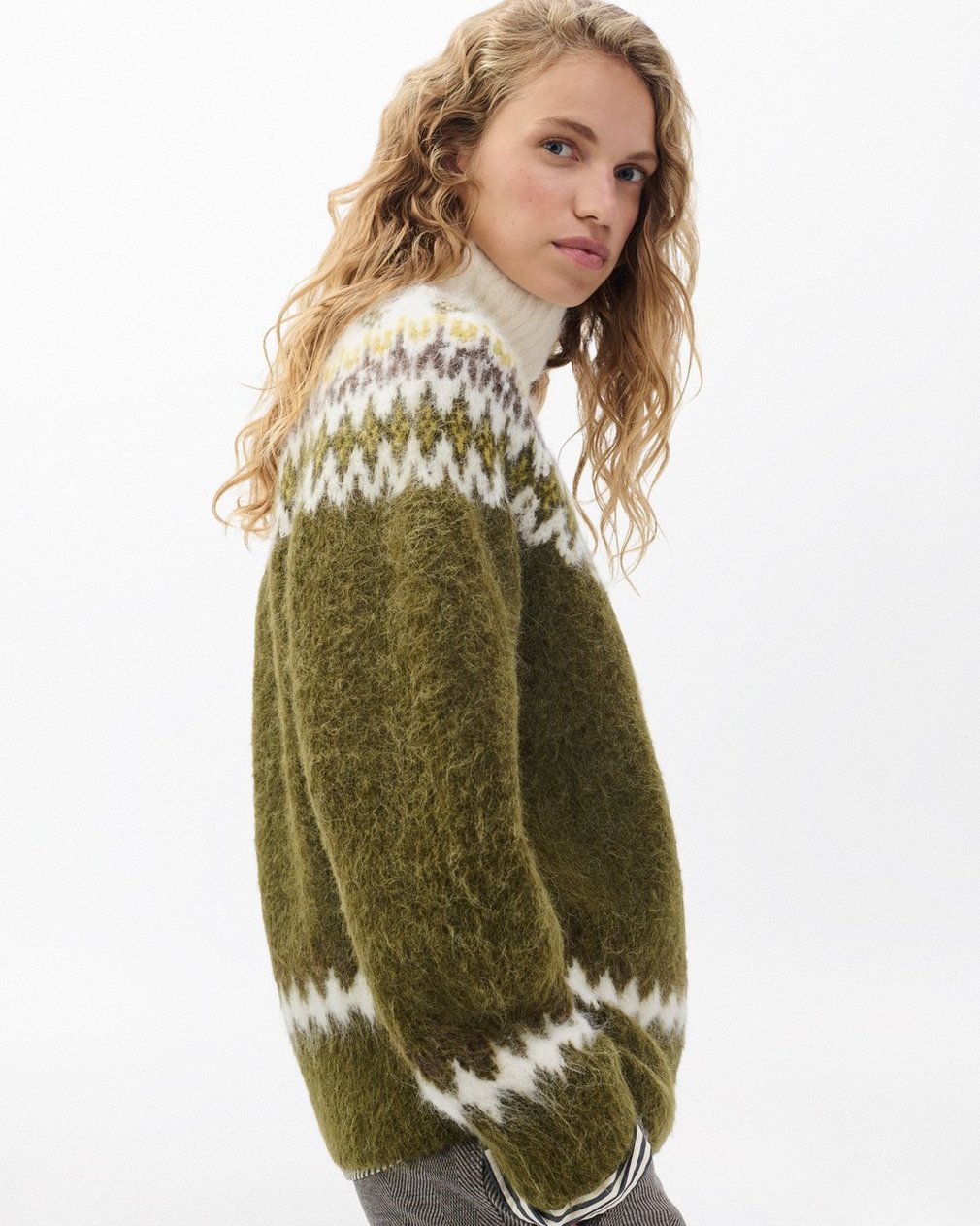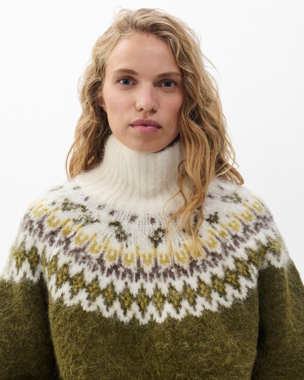 Wholesome style. This Fair Isle turtleneck is knit for a roomy, oversized fit, with cinched wrists and a high neck. Its ultra-soft alpaca blend features a beautiful brushed texture and is effortlessly insulating. Consider letting this sweater breathe between wears, as its yarns are delicate.