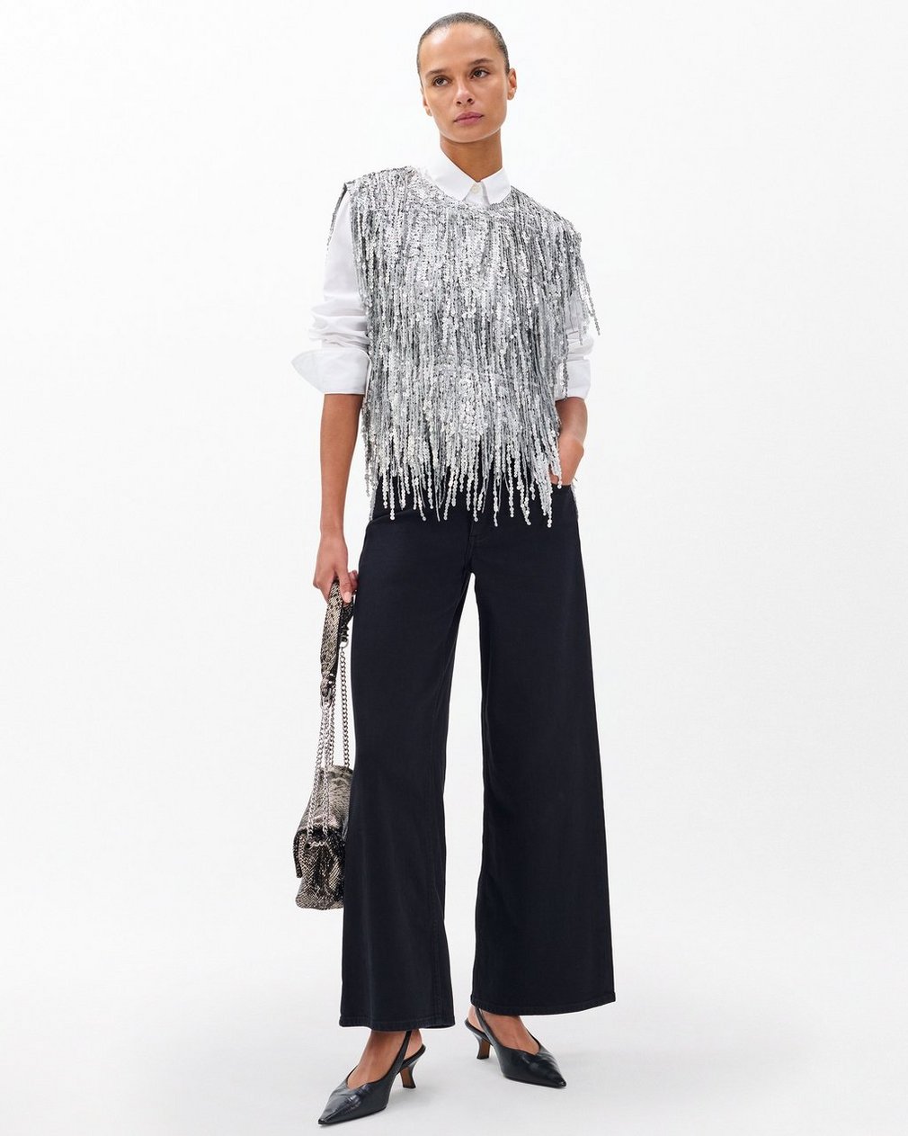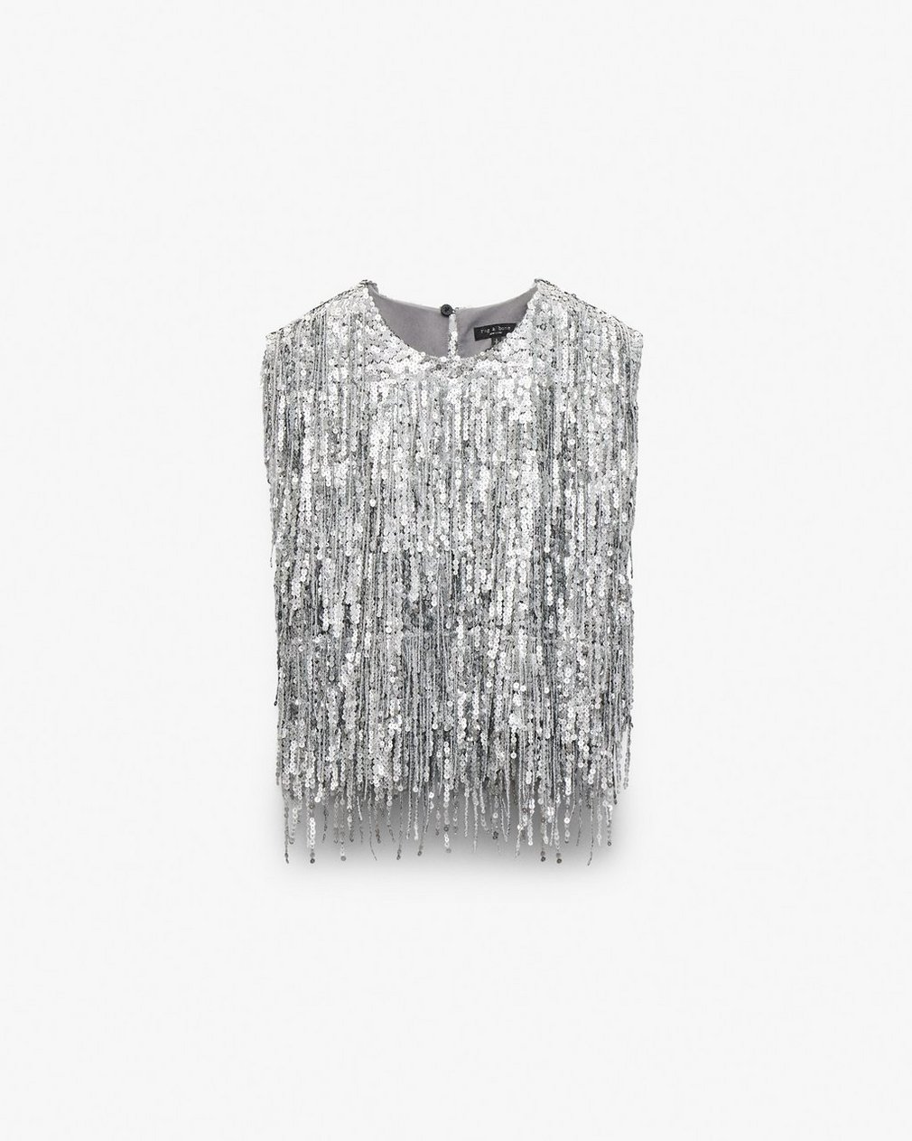 Dynamic sparkle. This classic shell top has capped sleeves and falls around the hips with a tassled, dazzling effect. Dress it down with denim, or up with the matching Billie Sequined Tassel Midi Skirt.