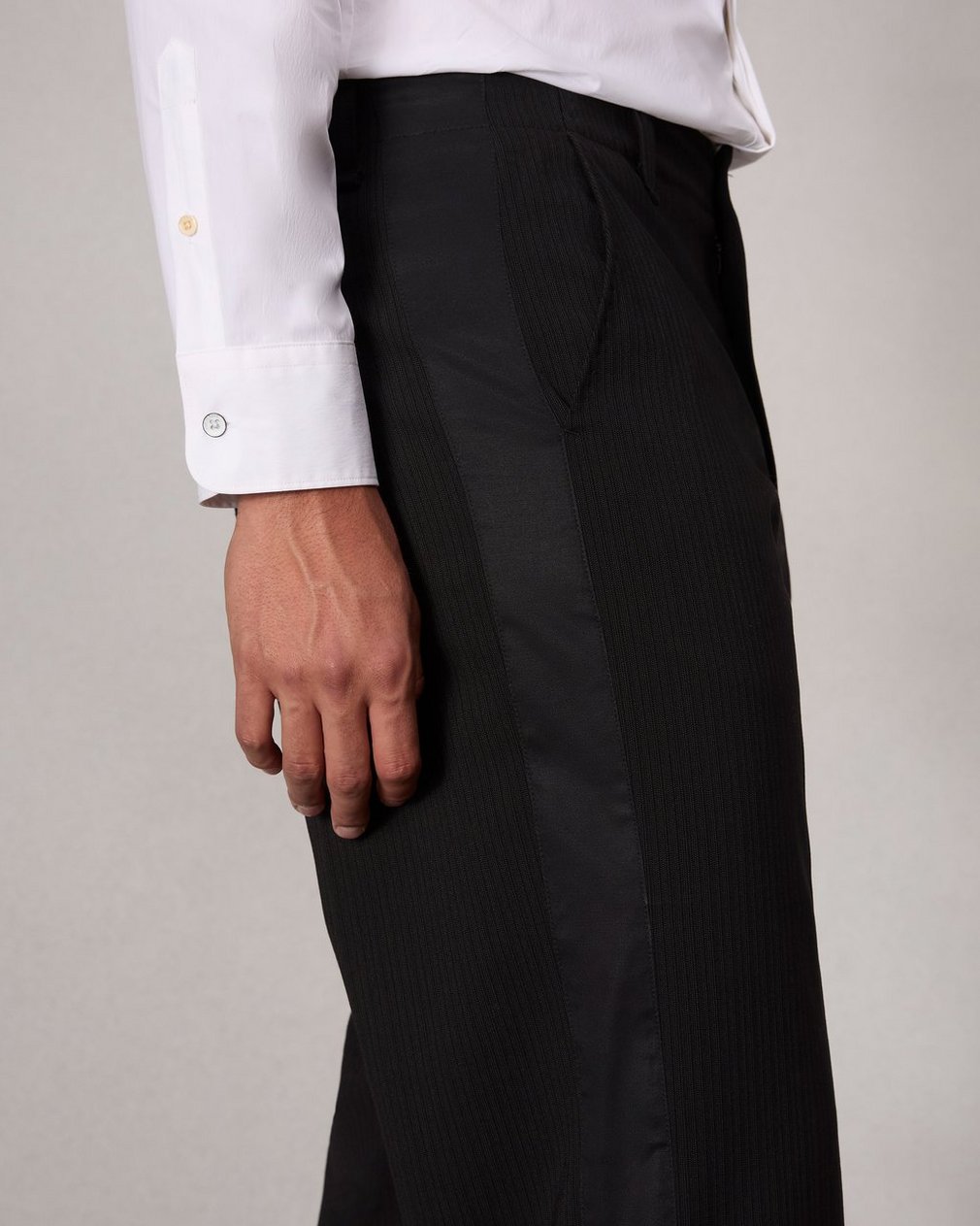 66% Wool 22% Polyester 9.5% Viscose 2.5% SpandexDry clean only, no bleach, no tumble dry, cool iron if neededFront keeper button, hook and bar, piping at hip pocket opening, zipper fly, stripe at side seamSide seam pockets and back pocketsImported