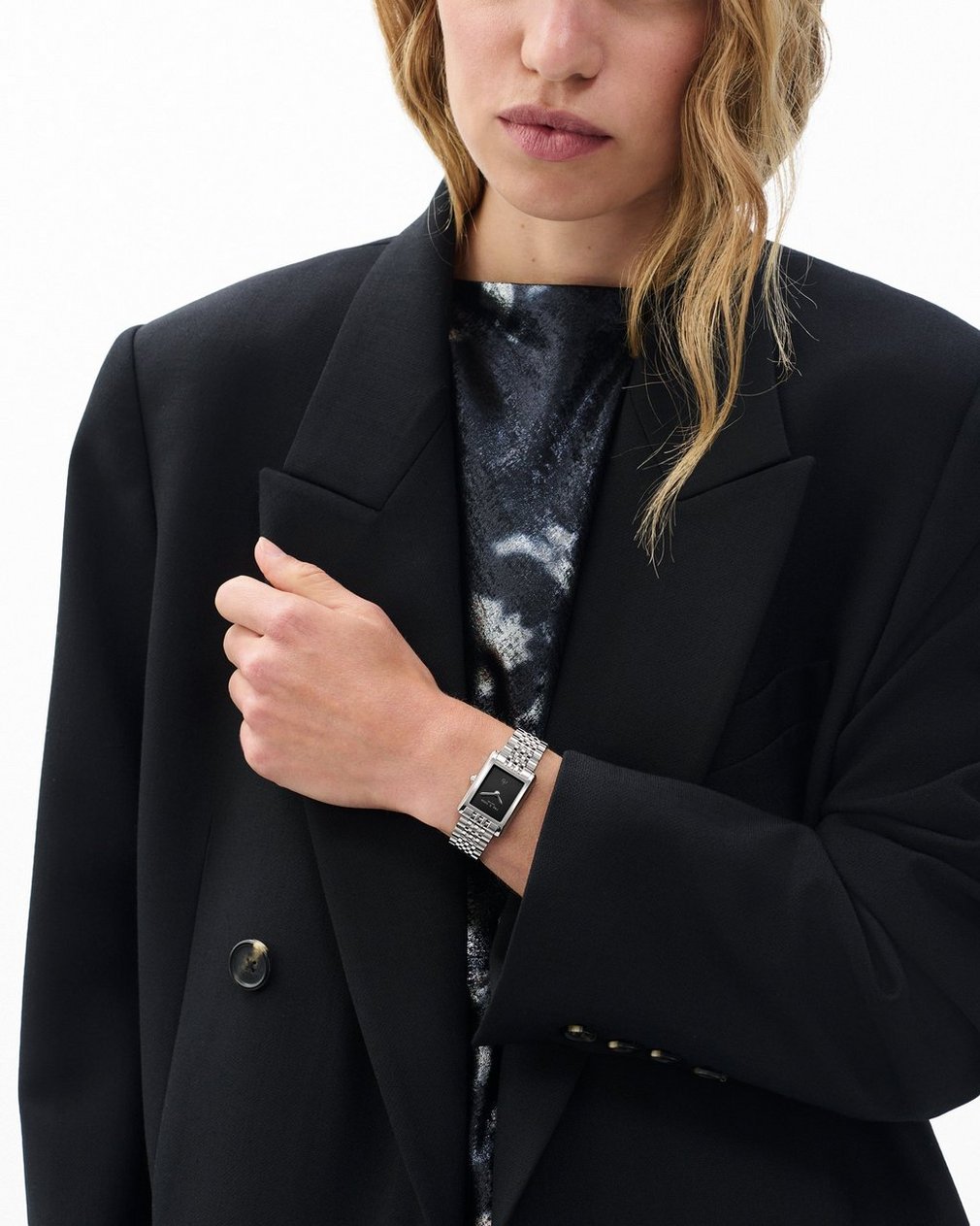 Small in scale. Big on character. The Brynn reimagines a classic square silhouette in recycled steel. Under a flat sapphire crystal, a glossy black dial is offset only by minimal silver hands and logos. The brushed-and-polished bracelet, finished with a butterfly clasp, with a butterfly clasp, adds a vintage touch that feels decidedly modern. Crafted to pair with everything.