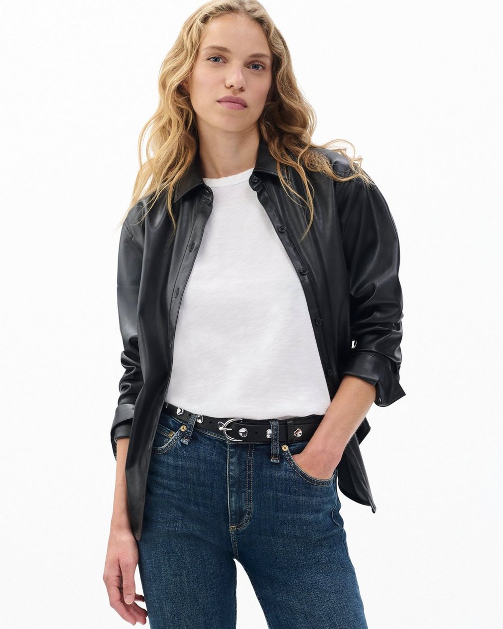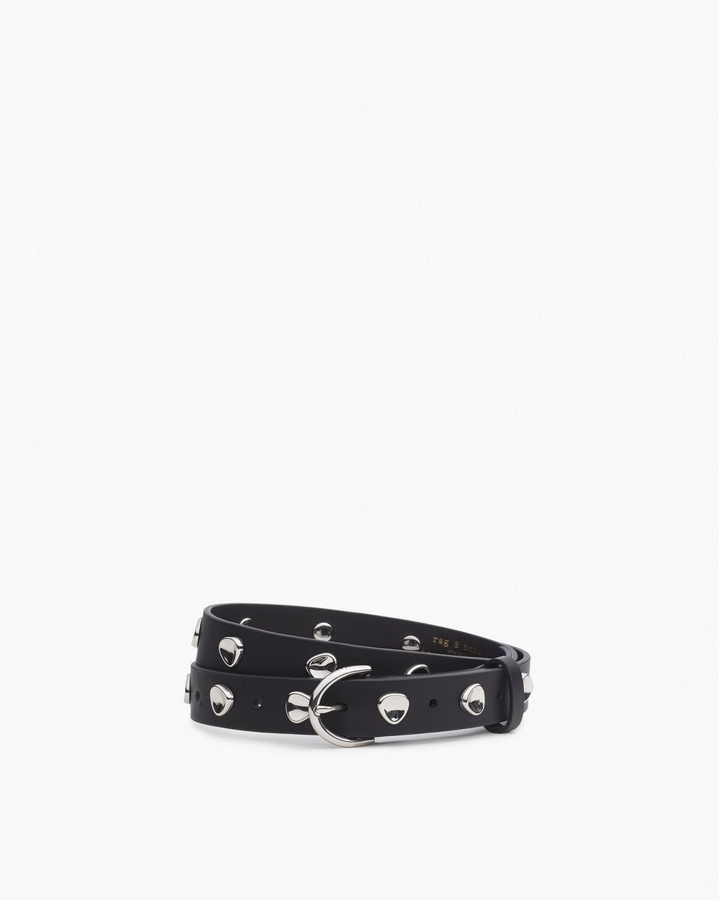 Classic edge. Crafted in Italian-milled leather, this streamlined belt features oblong pebble-shaped studs inspired by forms from fine jewelry. It fastens with a simple curved metal buckle.