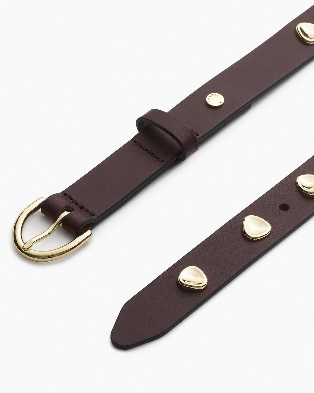 Classic edge. Crafted in Italian-milled leather, this streamlined belt features oblong pebble-shaped studs inspired by forms from fine jewelry. It fastens with a simple curved metal buckle.