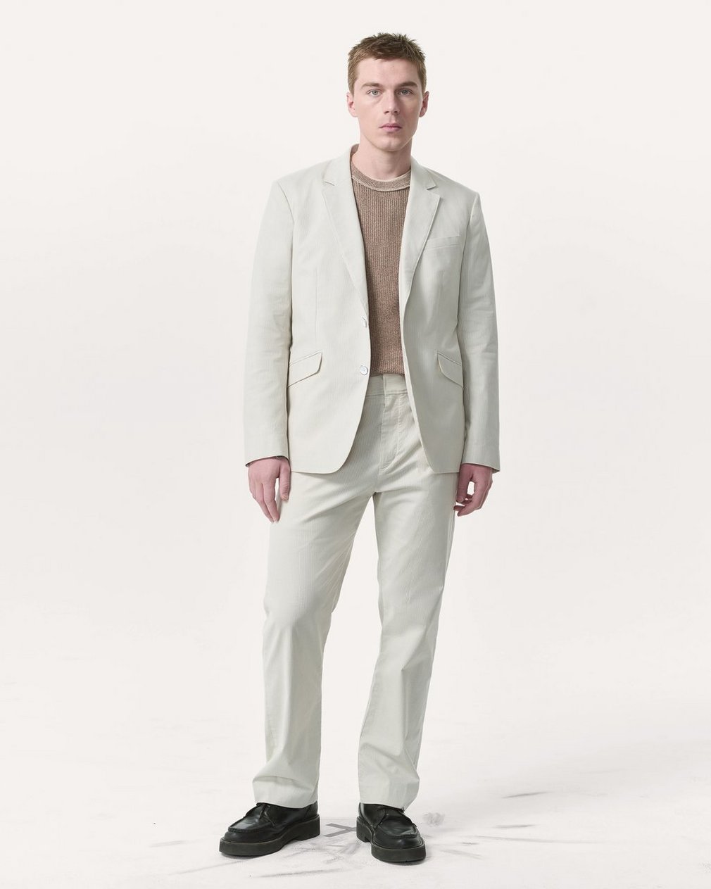 96% Cotton, 4% ElastaneDry clean onlyButtons at center front and cuffsLeather button backs and shoulder padsTwo waist flap pockets and one chest pocketImported