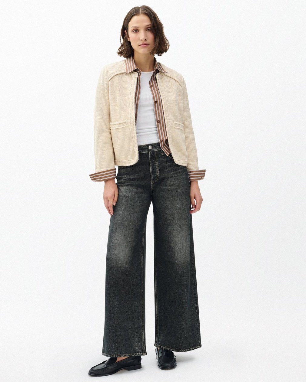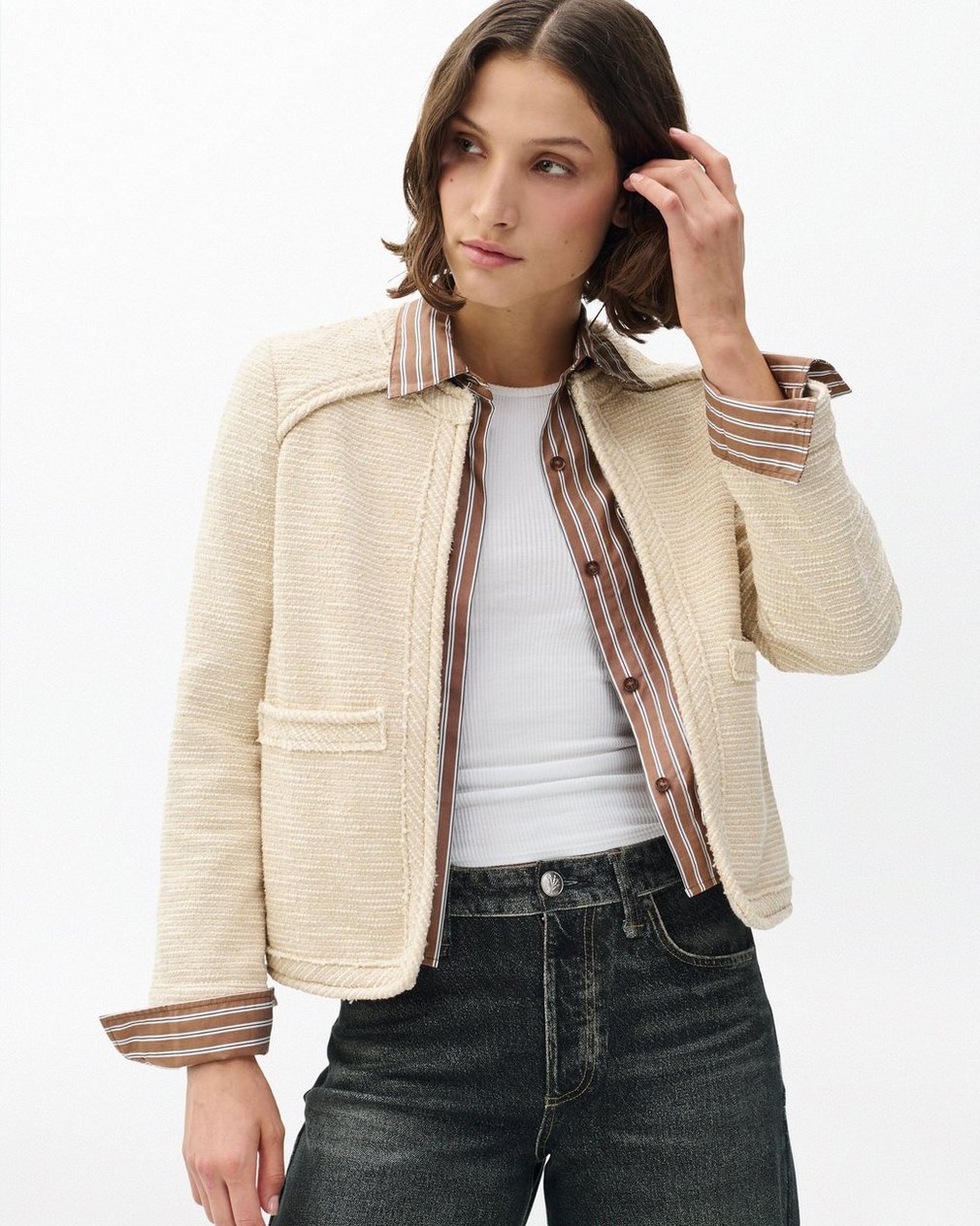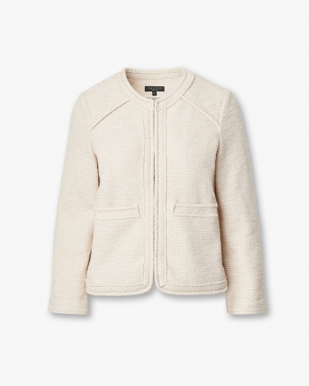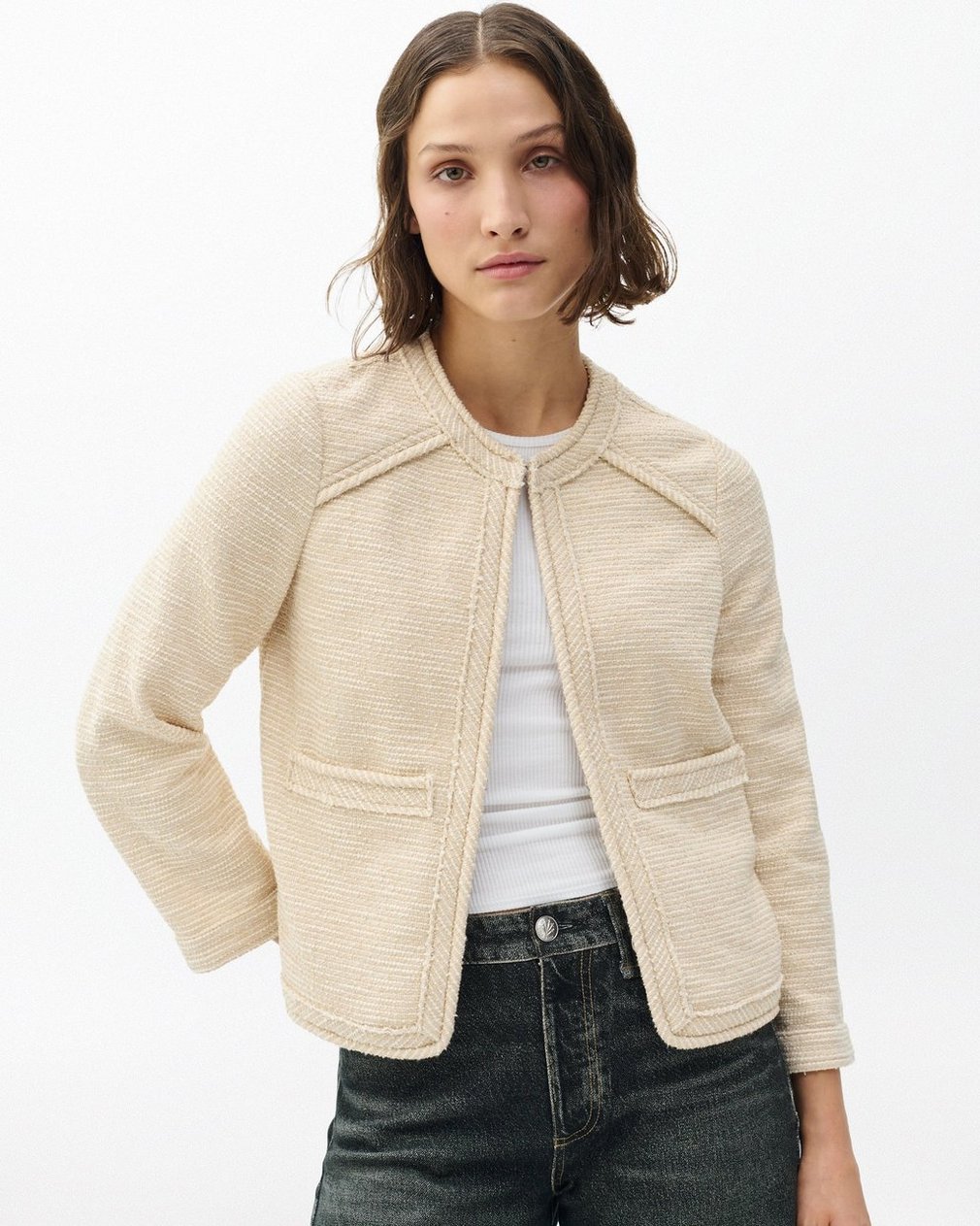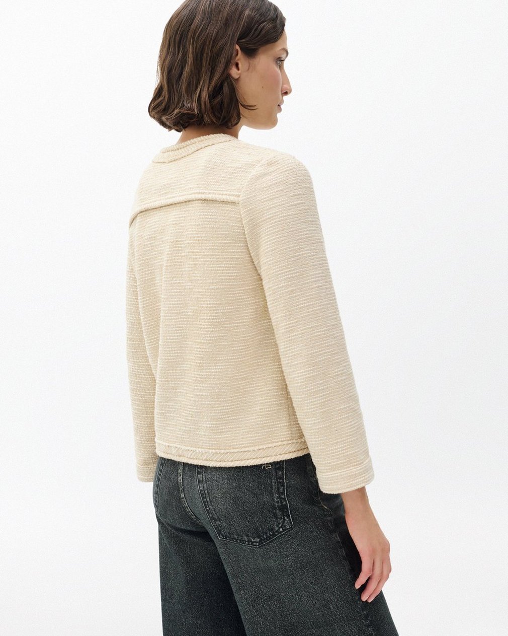 Relaxed yet refined. This Italian tweed blazer features a relaxed fit, bracelet-length sleeves, and a hidden hook-and-eye closure. Unlined and effortlessly constructed, it adds quiet sophistication to any look.