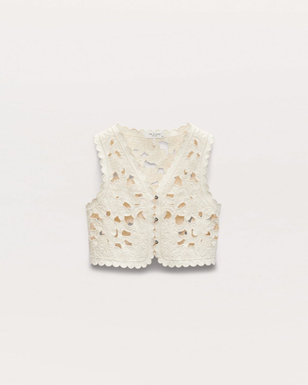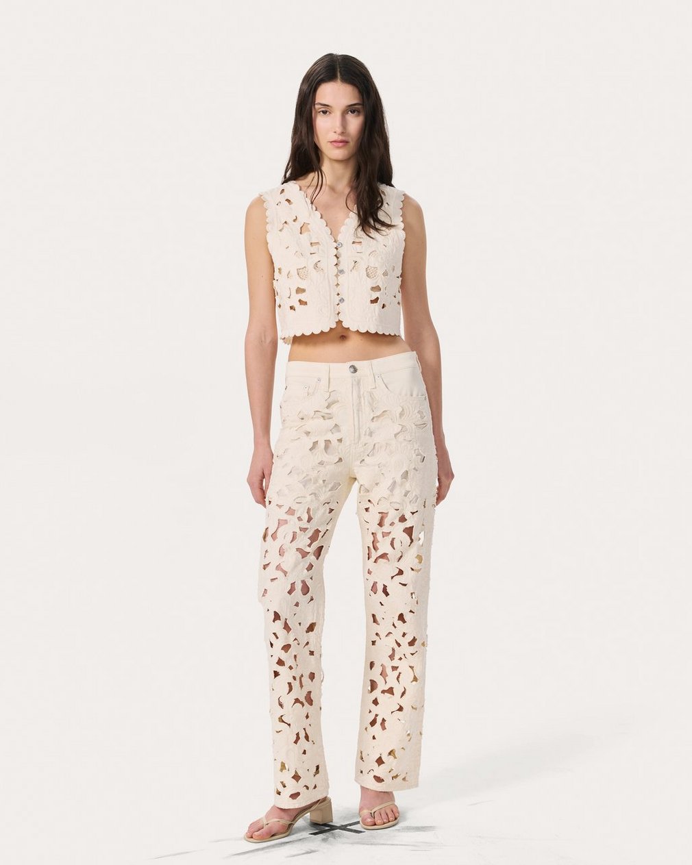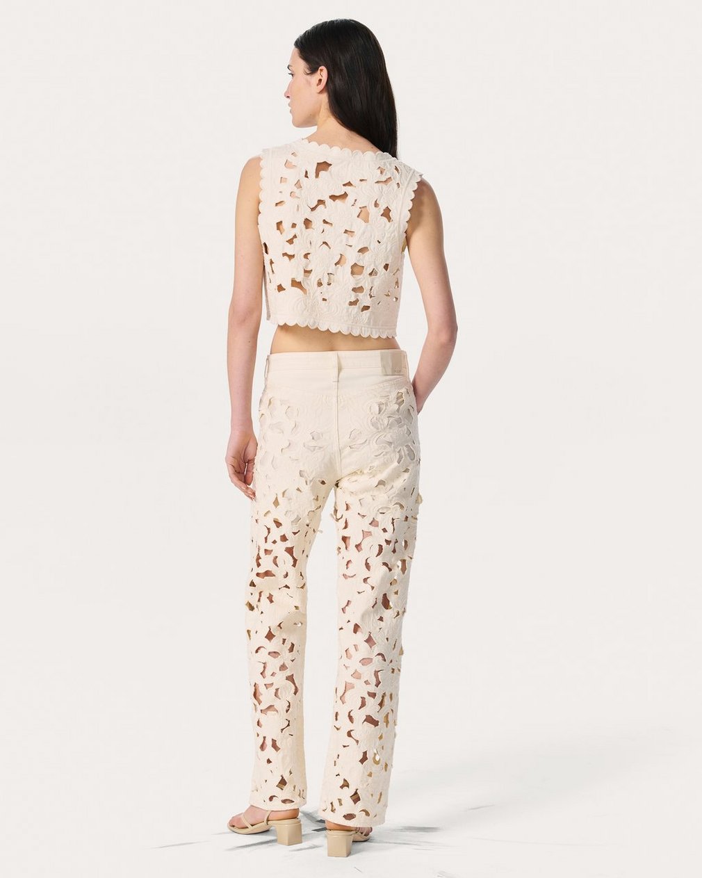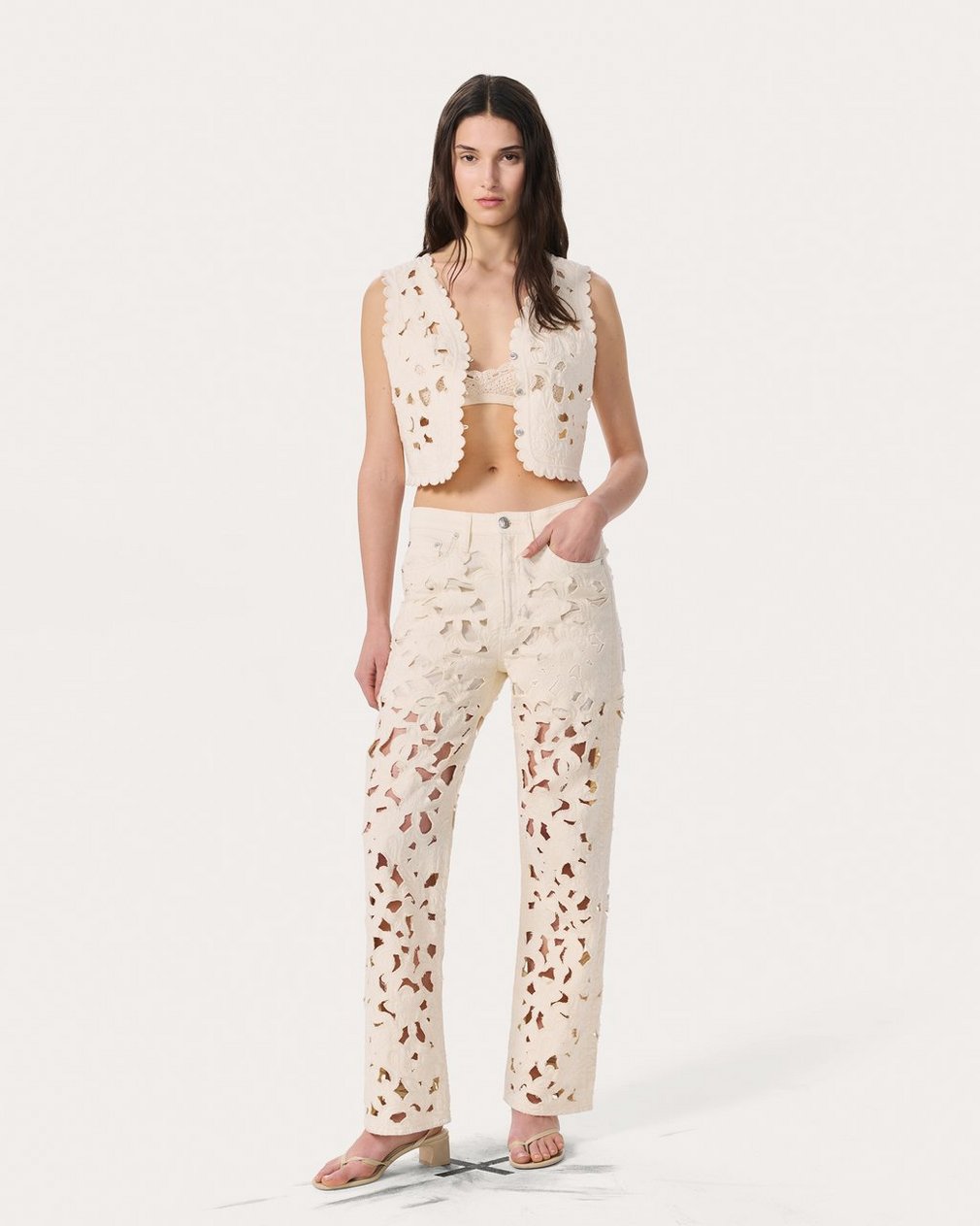 Flower power. A laid-back, slightly cropped vest with ??0s vibes. Featuring delicate floral embroidery, laser-cut detailing, and softly scalloped edges. It’s crafted from Lightweight Rigid non-stretch denim that provides structure, but breaks in over time for a soft and comfortable feel. In Ecru, a soft, warm white.