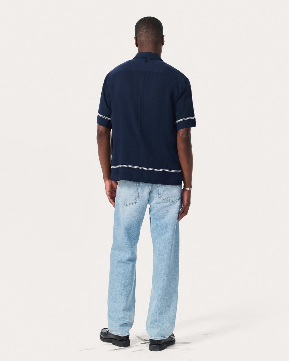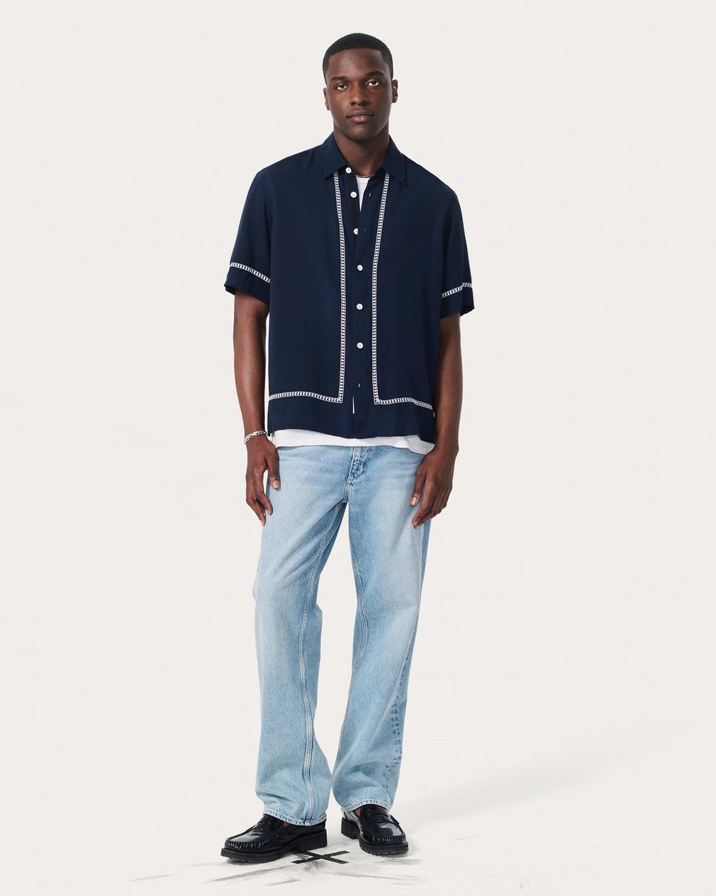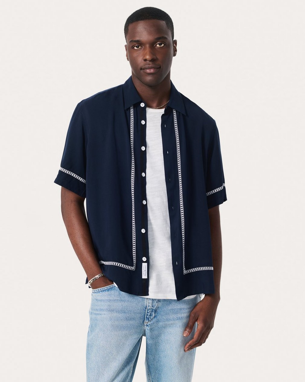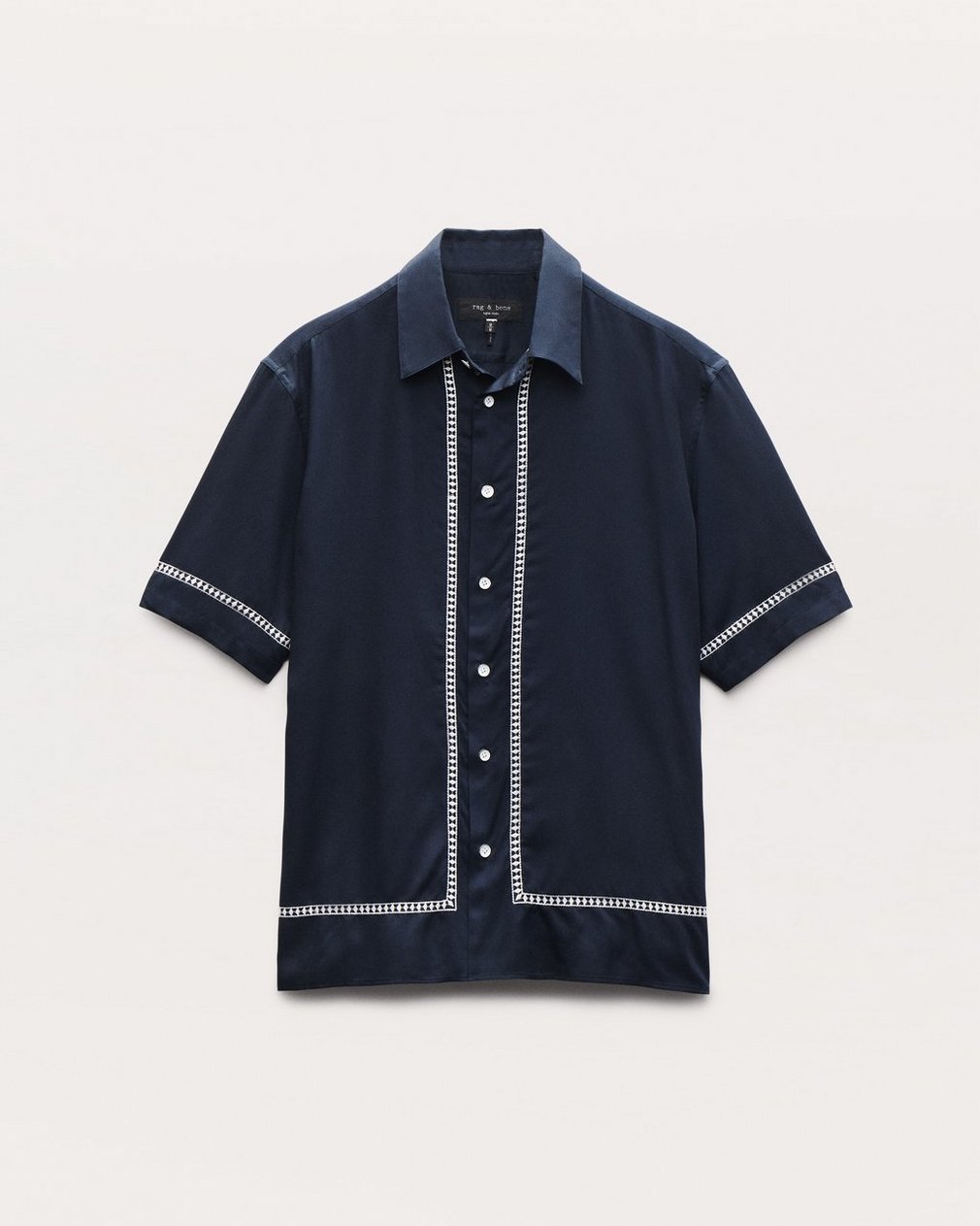 Our favorite button-up shirt. Cut with a classic, laid-back fit and straight hem perfect for any outfit. This short-sleeve version is updated for summer in a lightweight fabric with an easy drape. Embroidered geometric borders in a contrasting color frame the garment with additional texture and dimension.