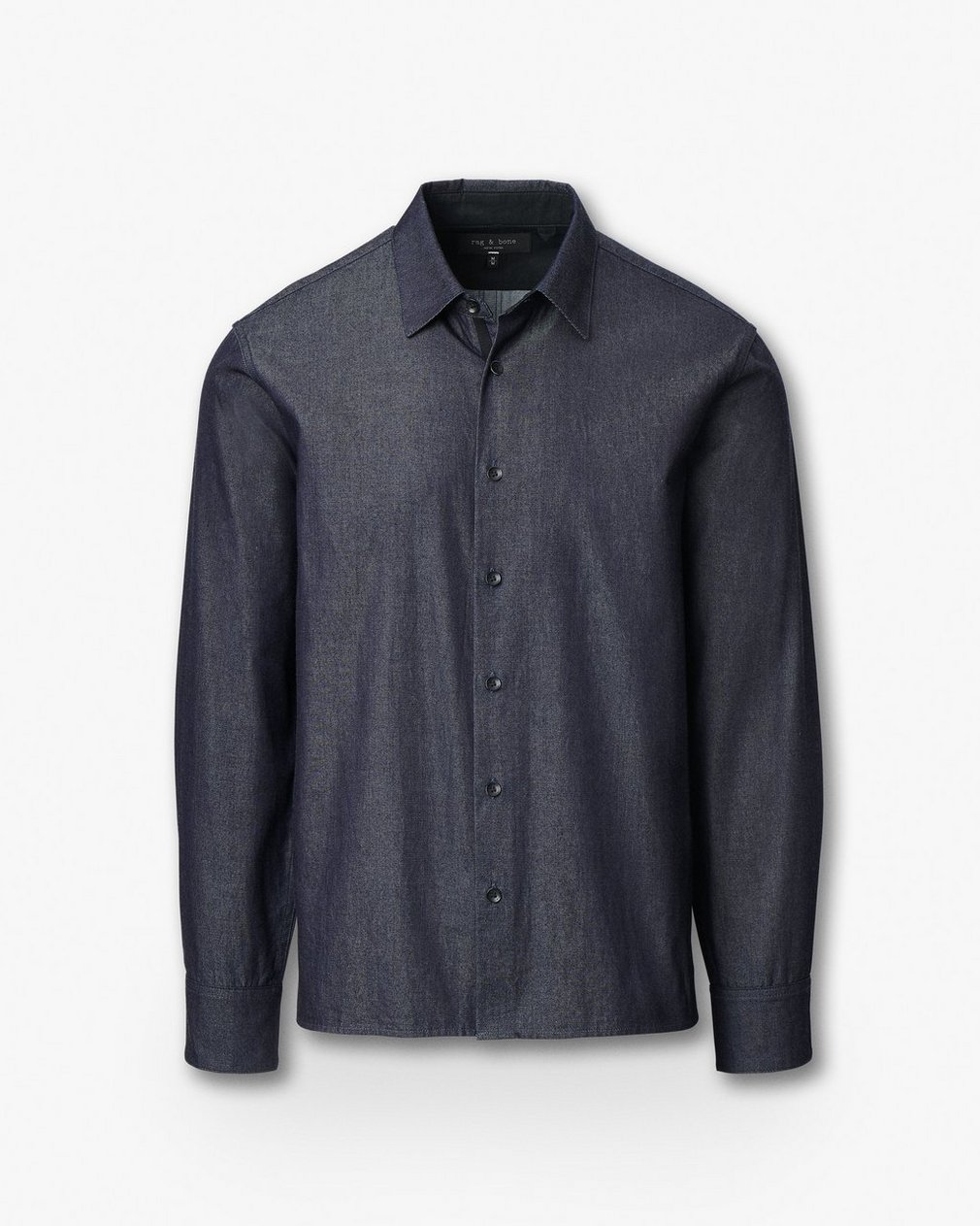 ? 100% cotton ? Authentic Rigid Denim in Raw Indigo? Four-hole button closure? Distressed buttons? Bone button at sleeve placket? rag & bone embroidery? Machine wash cold inside out on delicate & tumble dry low? Imported. Japanese materials.