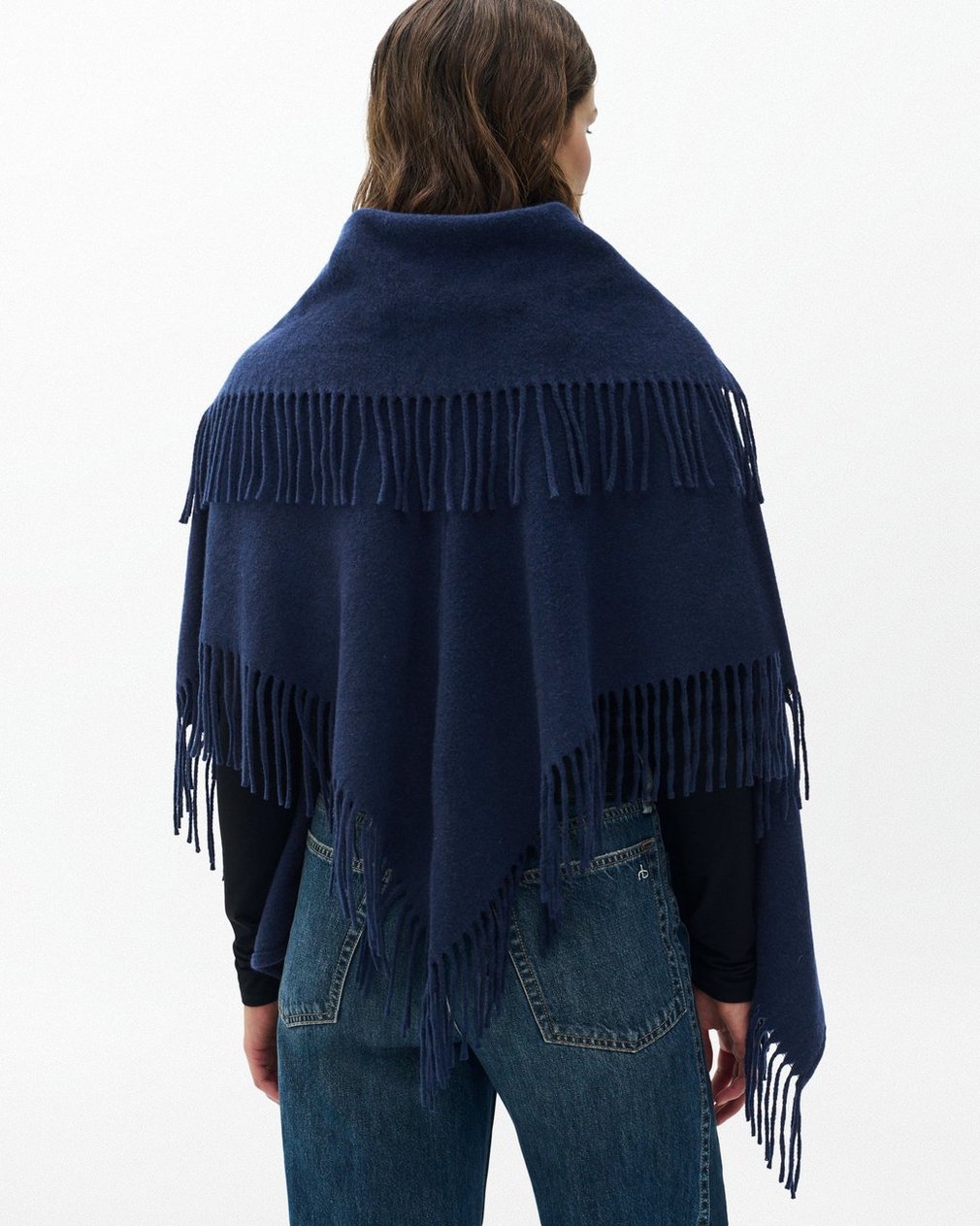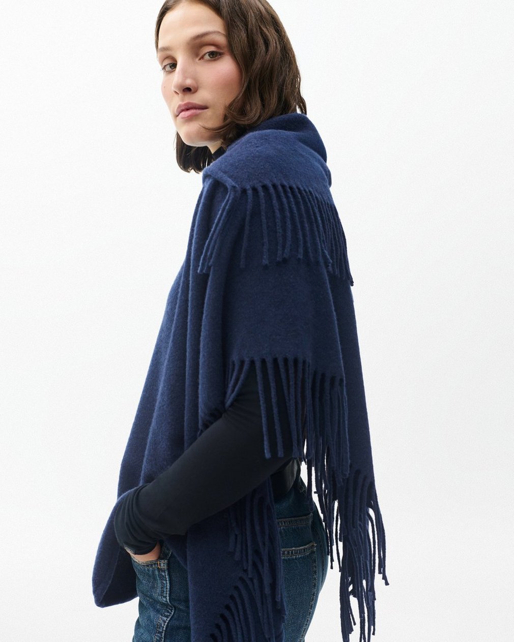 Wrap it up. Crafted in Italy from 100% wool, this assymetric poncho has a soft drape with an easy cowl neck and fringed edges. Wear yours over leather for contrast or lived-in denim on the weekends.