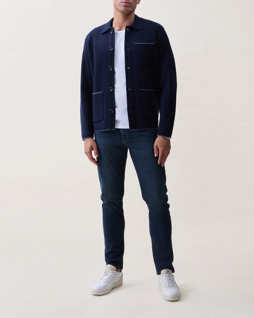 Ideal for layering. A pure cotton cardigan that reinterprets the classic chore coat. Retains the structure of a jacket with the comfort of a sweater and features patch pockets. A fully-fashioned knit for the perfect top layer.