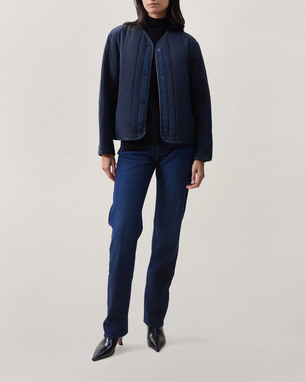 A classic quilted liner. Works just as well on its own as it does layered under a jacket. Complete with effortless snap closures and faux leather trim.