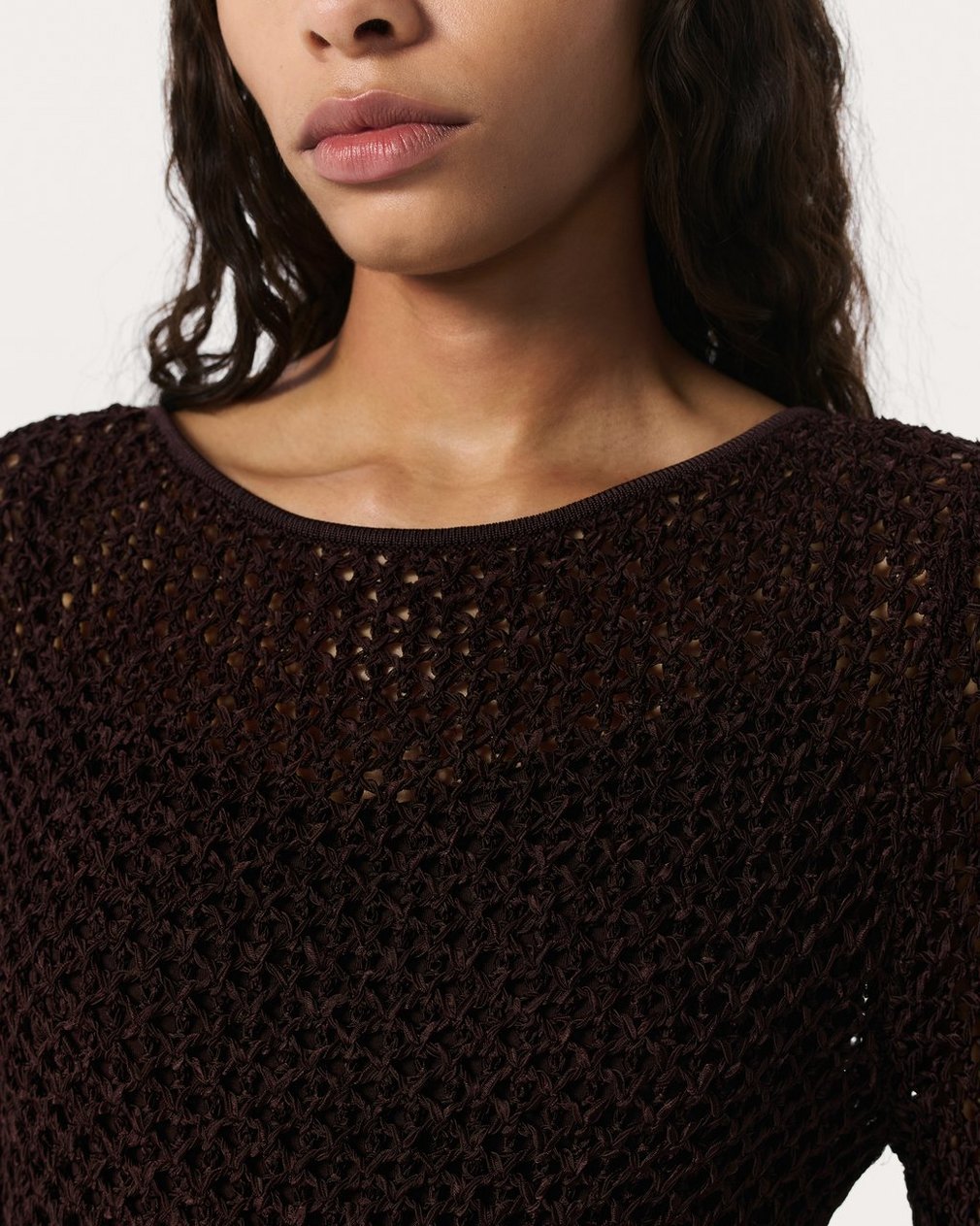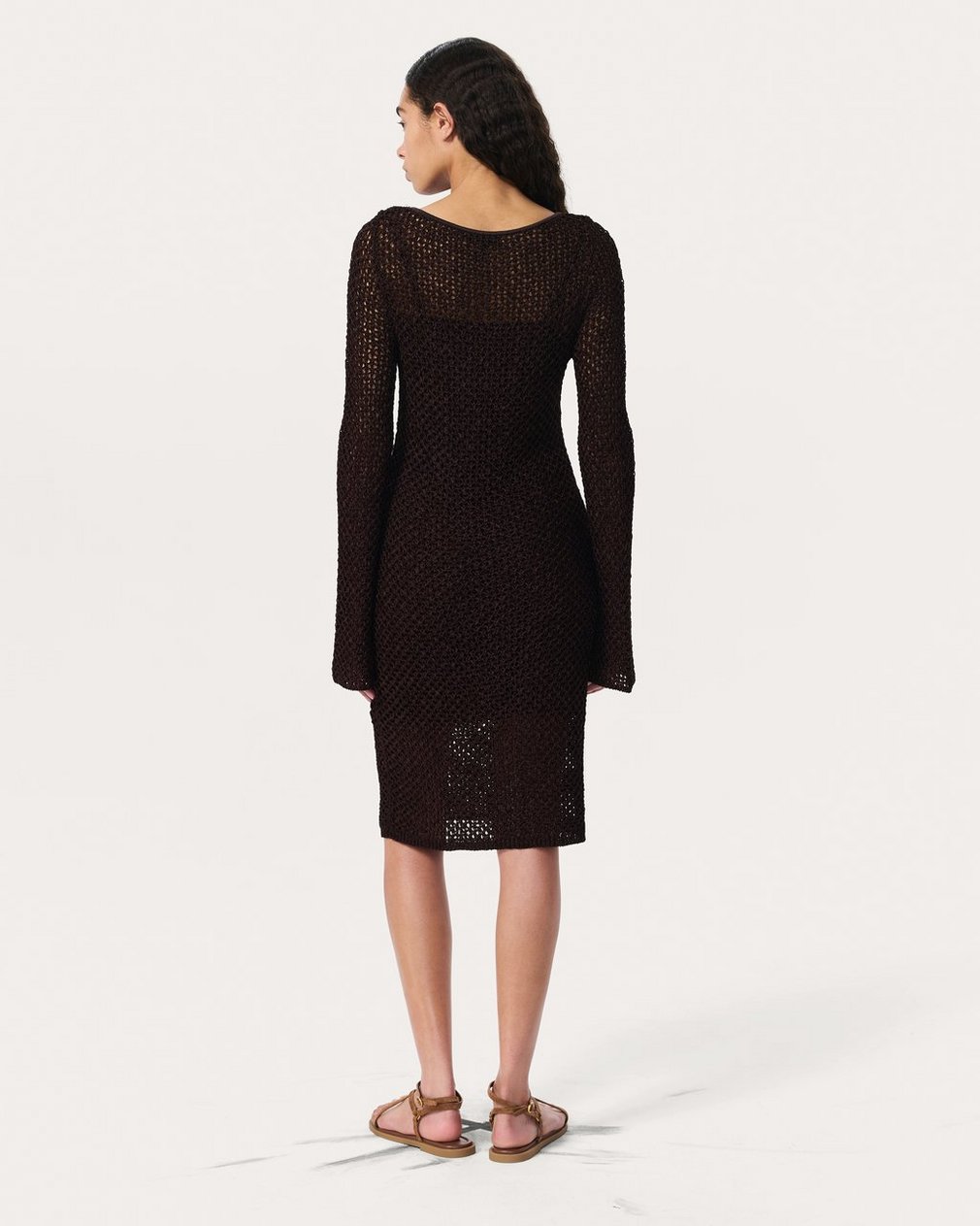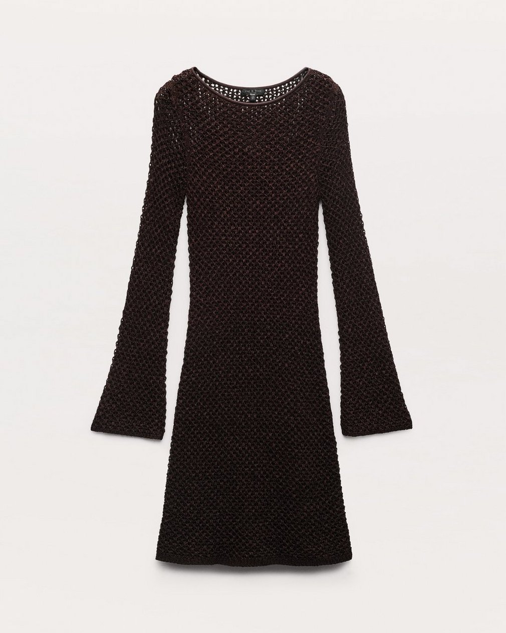 Sheer intentions. With subtly flared hems and an open-knit design crafted from luxe, textured yarn, this boatneck dress brings the drama wherever its worn. Its relaxed look and feel are elevated by a jersey slip, which provides coverage and detaches so you can wear either layer alone or together.