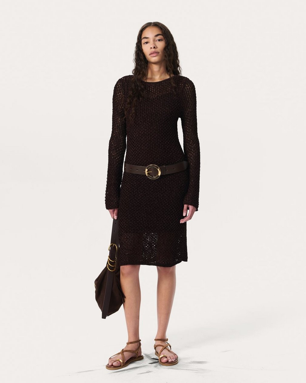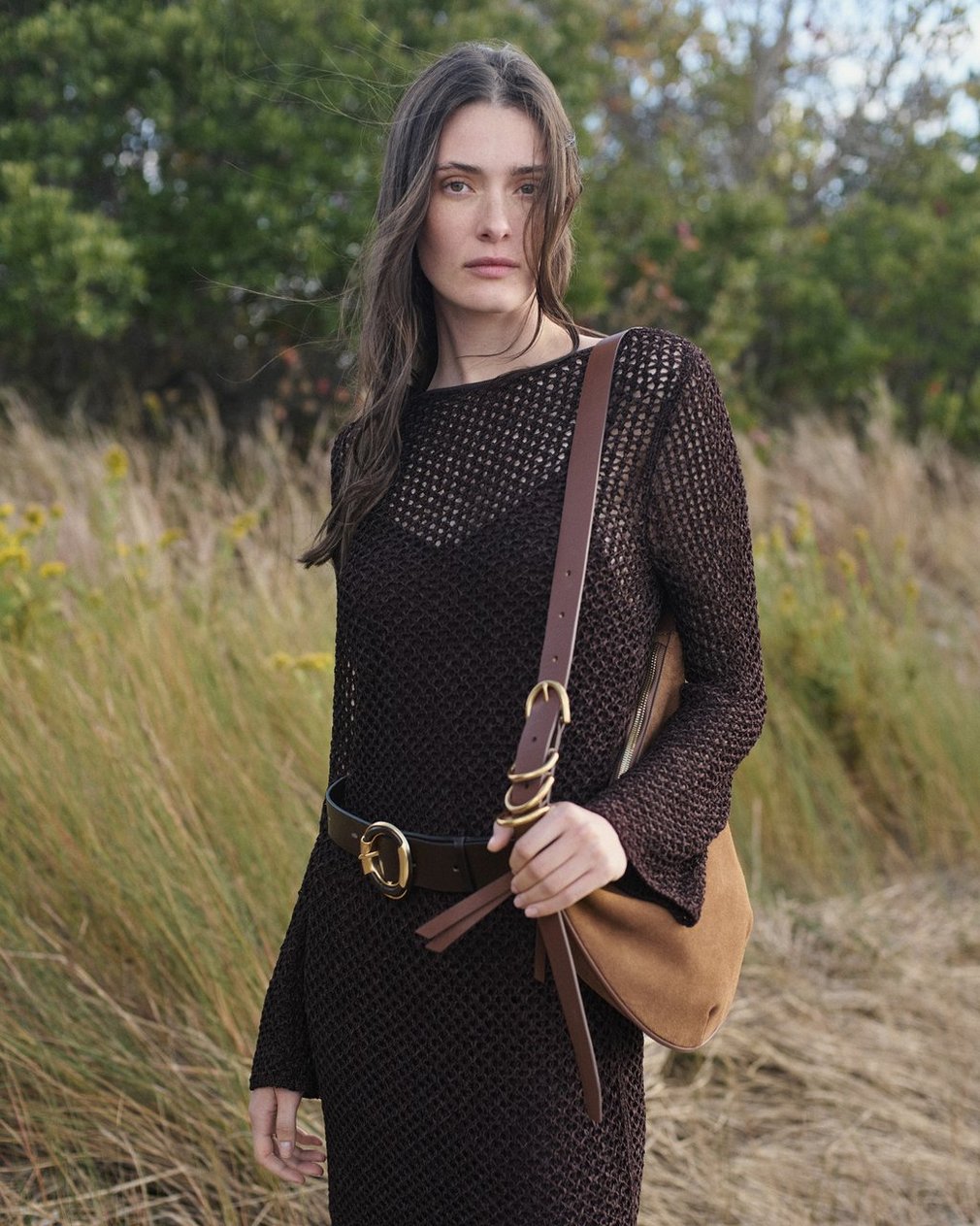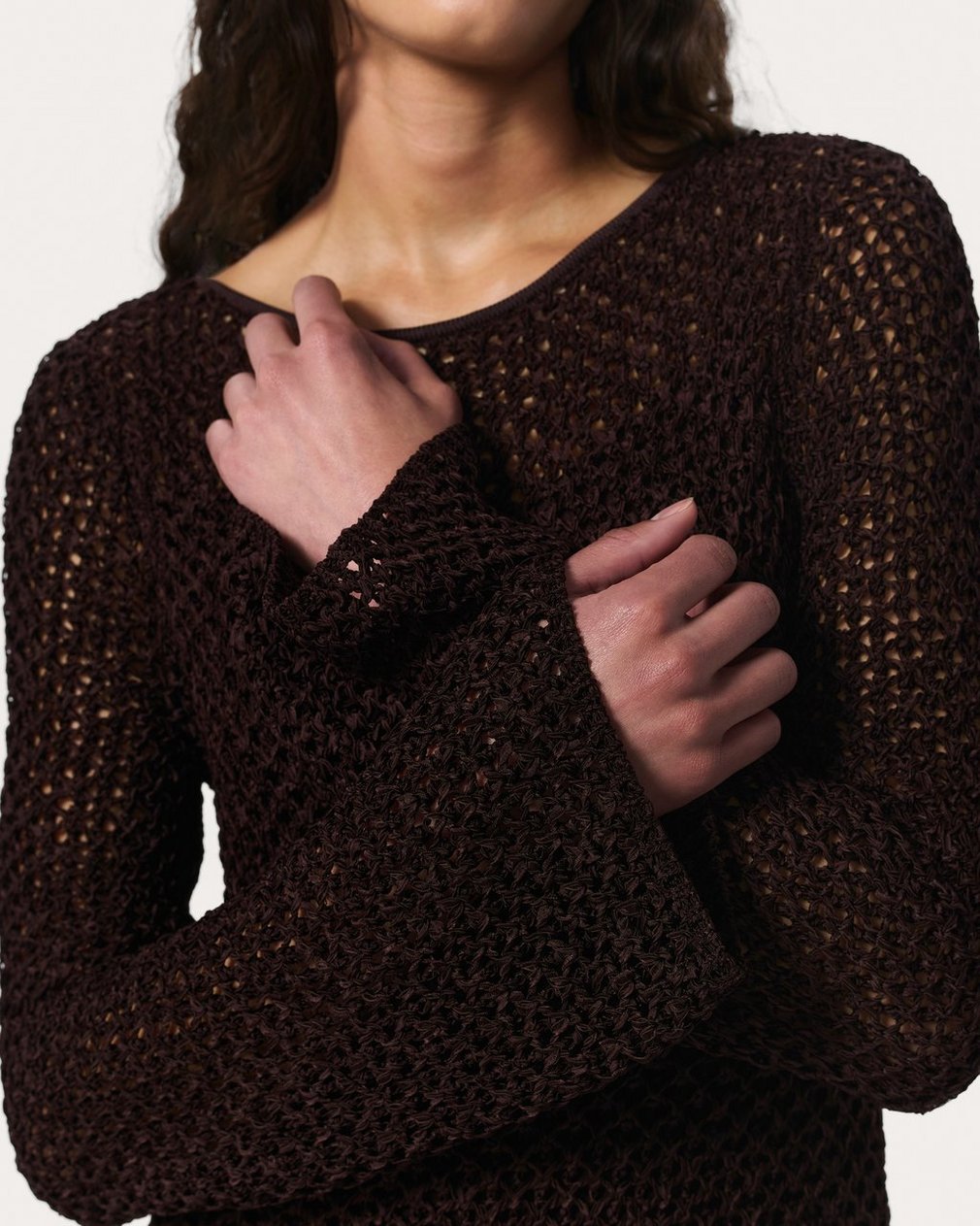 Sheer intentions. With subtly flared hems and an open-knit design crafted from luxe, textured yarn, this boatneck dress brings the drama wherever its worn. Its relaxed look and feel are elevated by a jersey slip, which provides coverage and detaches so you can wear either layer alone or together.