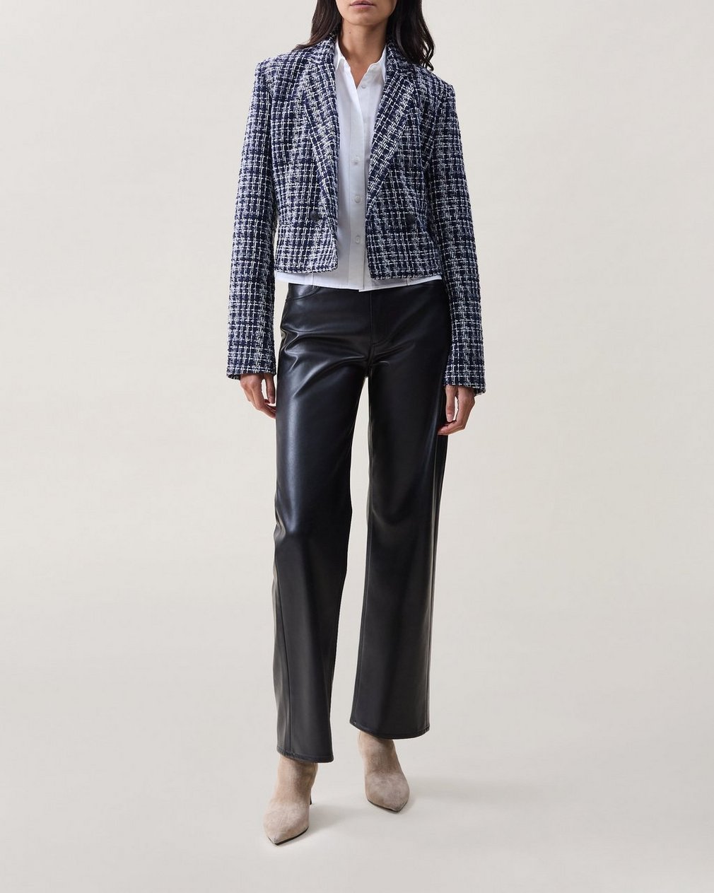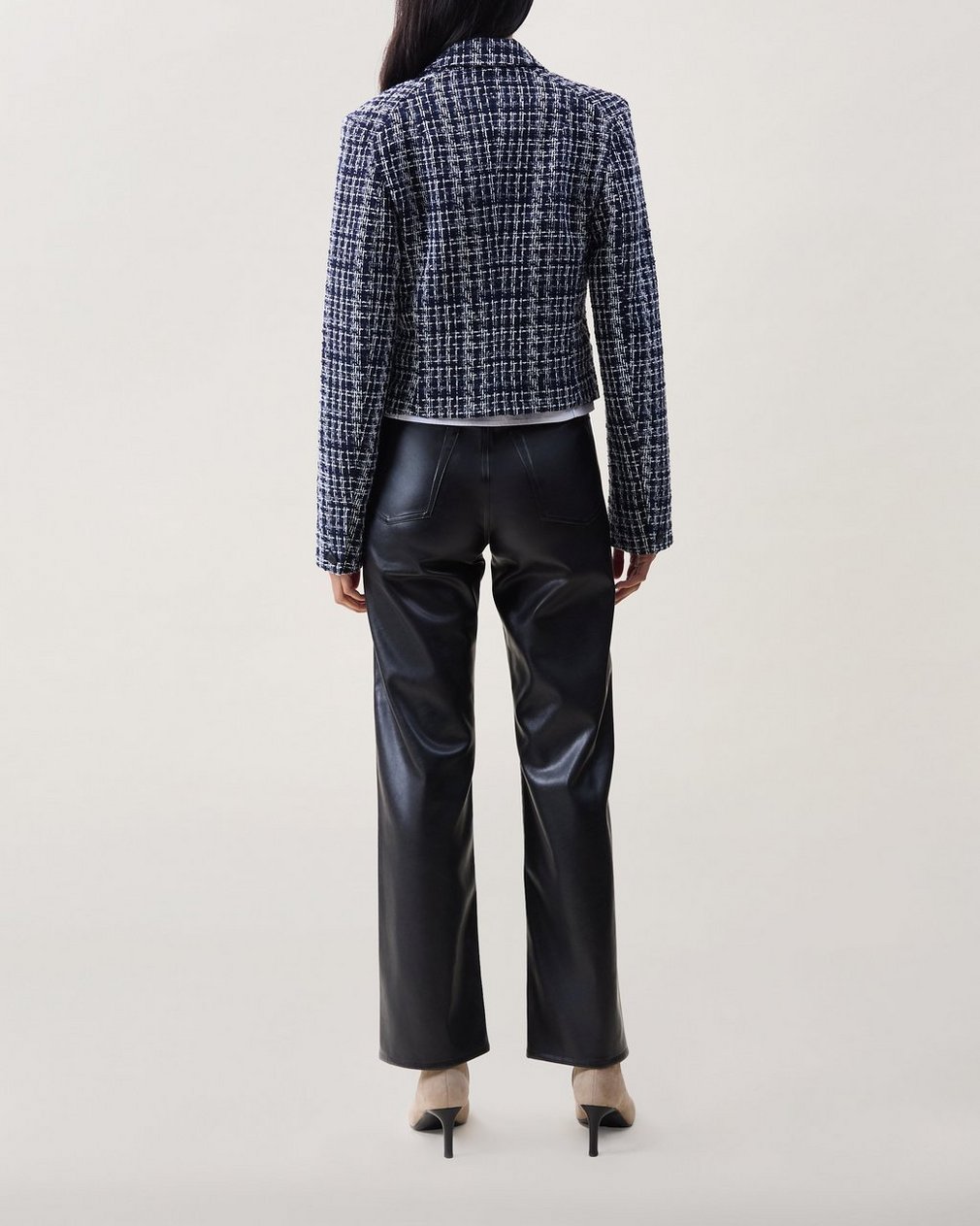 A cropped, double-breasted style in a graphic tweed. Features a satin lining. Tailored with slightly oversized shoulders that make it perfect for layering.
