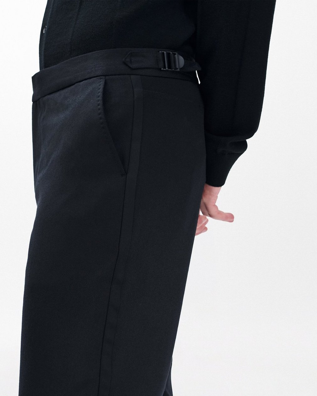 ? 100% wool? Dry clean only? Button fly with a hidden hook-and-bar closure? Military-inspired side adjusters ? Two front trouser pockets and one back buttoned pocket? Imported. British fabric produced in partnership with Abraham Moon.