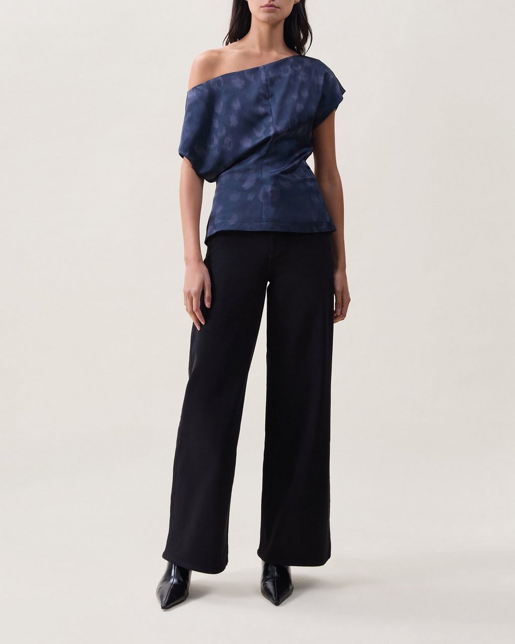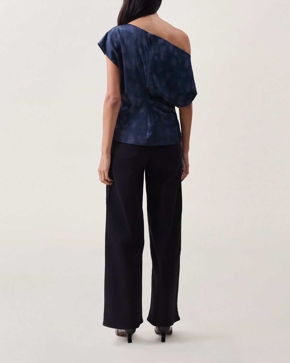 Sleek and sophisticated. This printed satin top features an asymmetrical neckline and capped sleeves. With a fitted feel and elegant drape, gathered detail features at the center for subtle detail. An invisible zipper and hook-eye closure at the center back allows for an effortless slip-on-and-go feel.