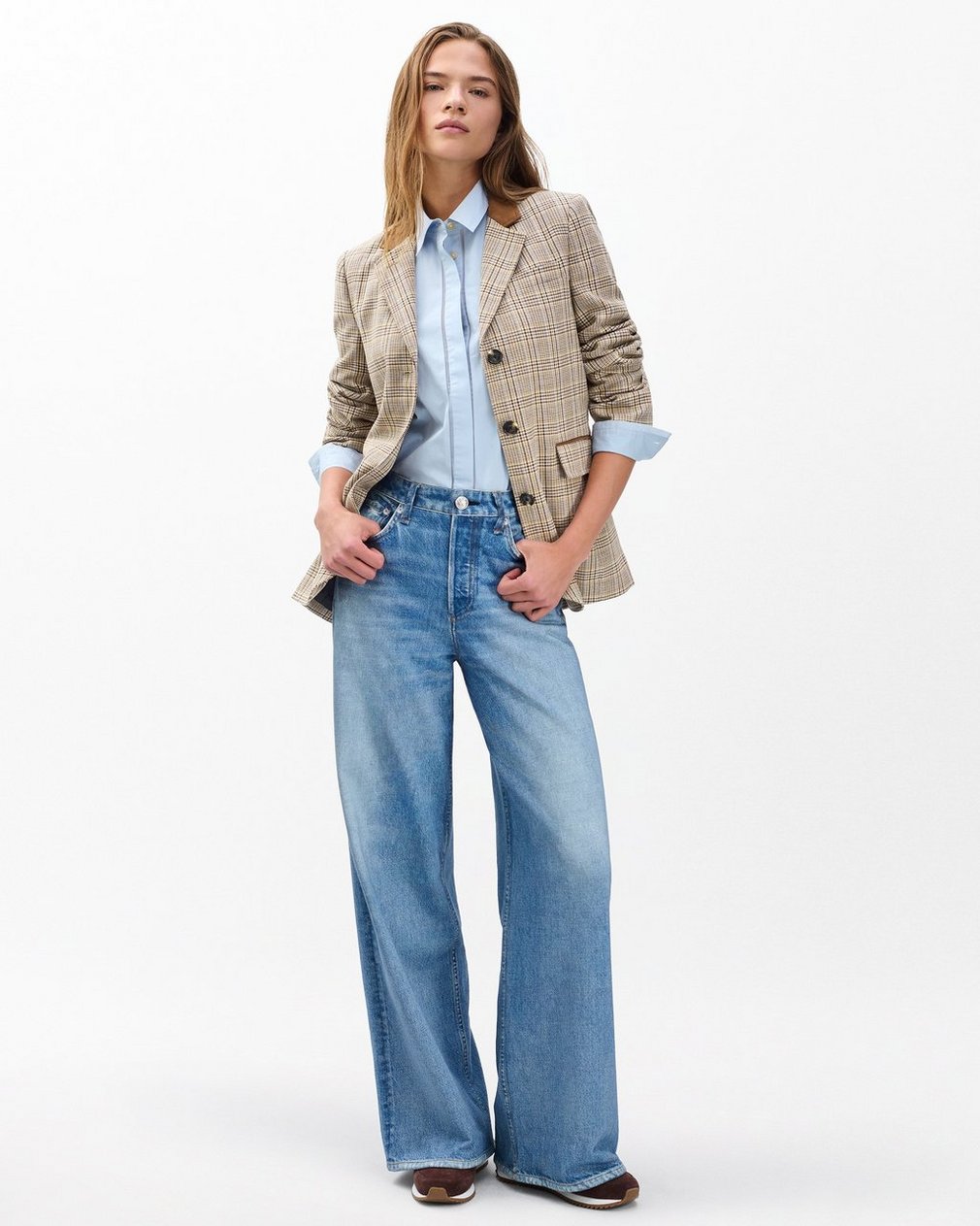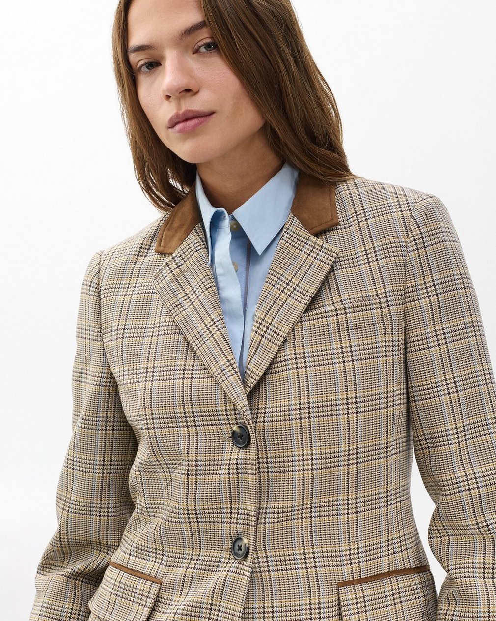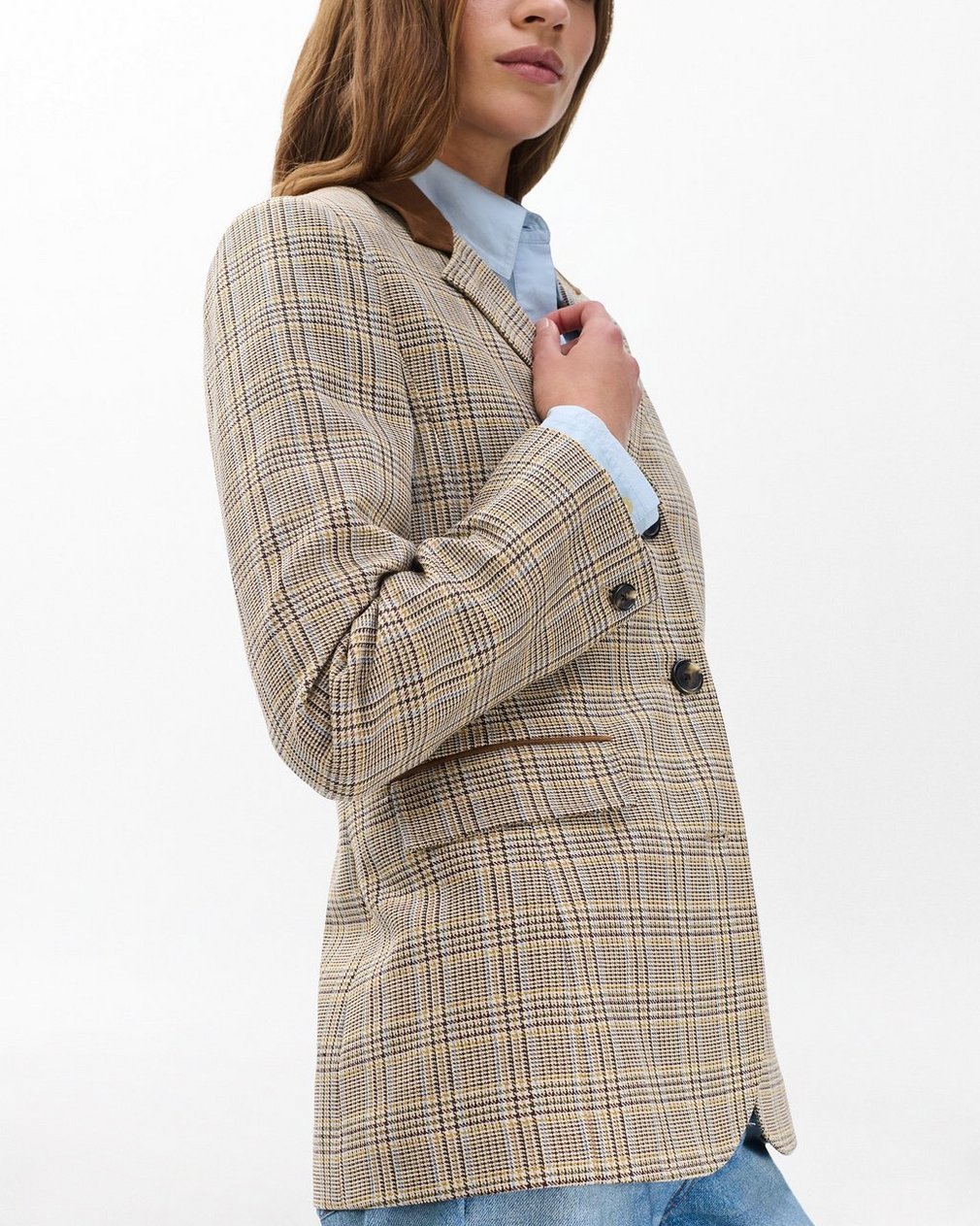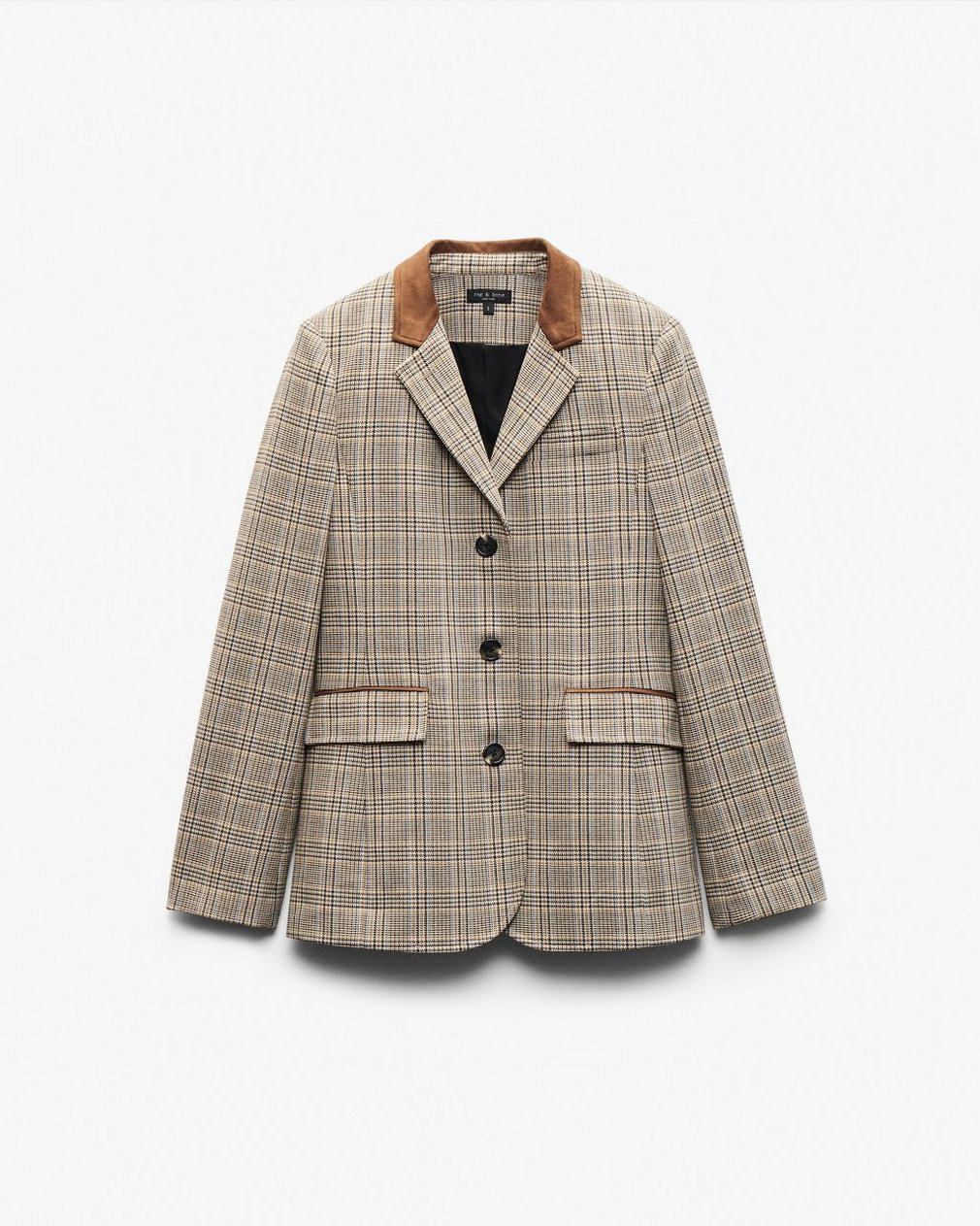 Heritage roots. Modern attitude. Tailored from a soft wool blend in a custom plaid, this three-button blazer features faux suede trims and a relaxed, slightly longer silhouette. Make it a full suit with the matching Shea Plaid Pants, or keep it casual with jeans. This style runs large, so for the closest fit, consider sizing down.