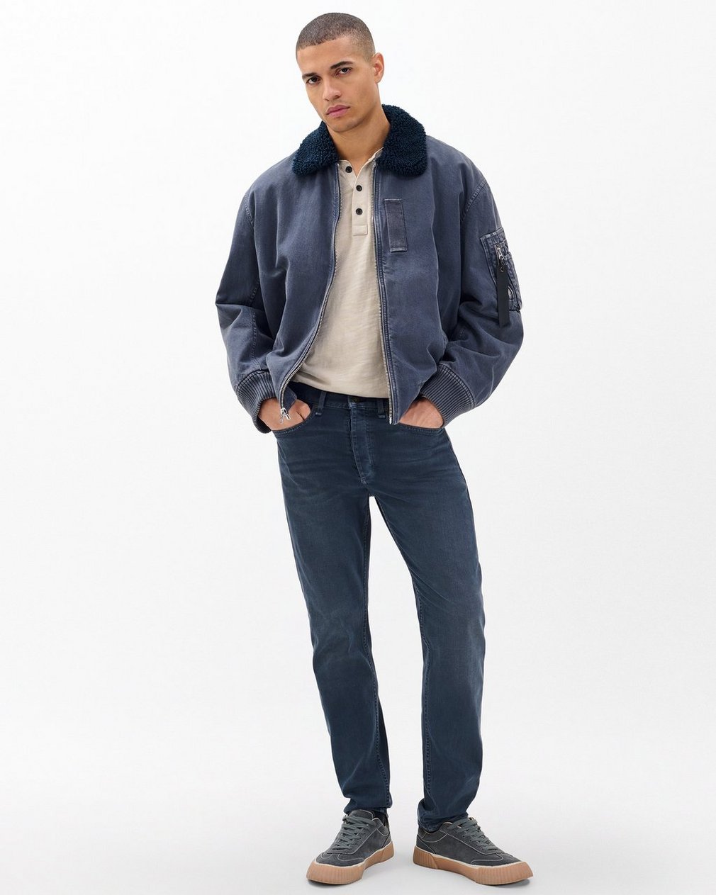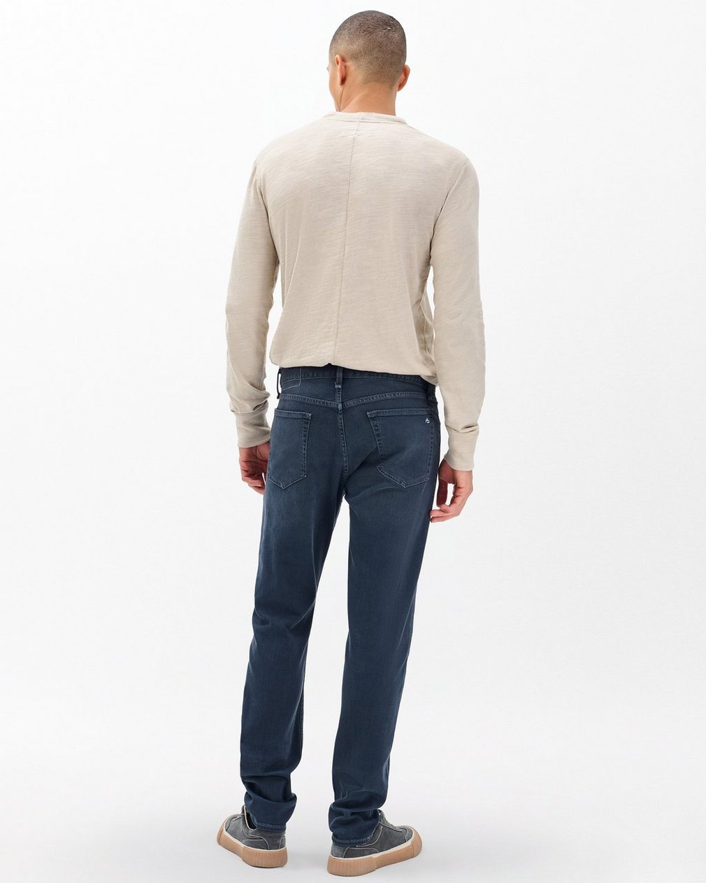 ? Mid rise, slim fit? Tailored through hip and thigh ? 11″ front rise, 32″ inseam, 13.5″ leg opening? Model is 6’2″ wearing a size 32