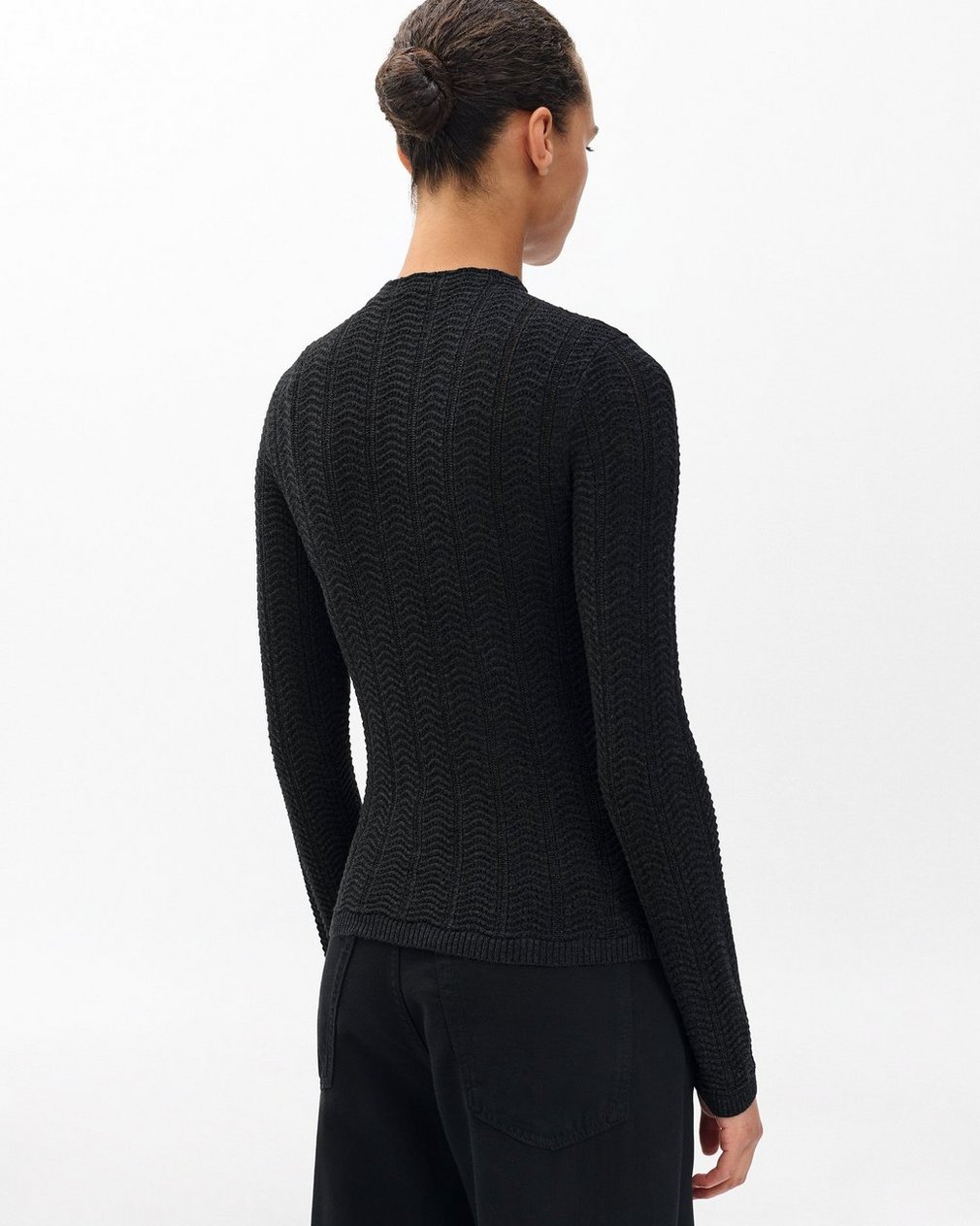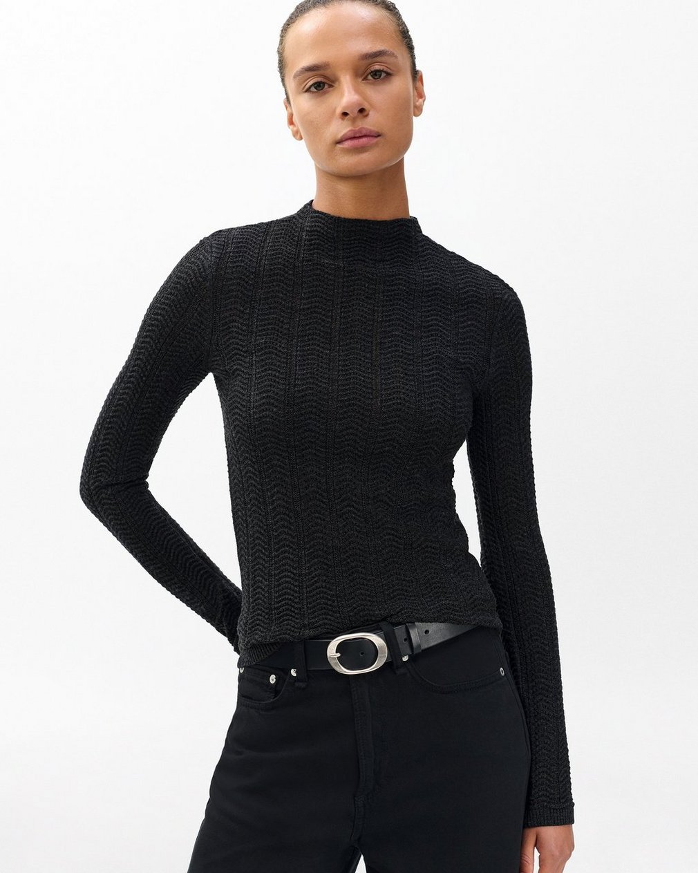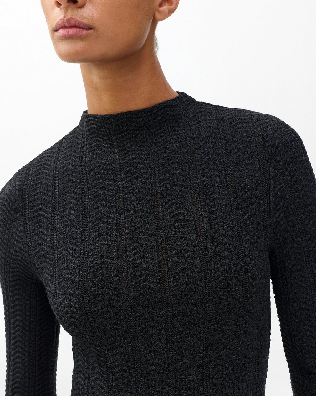 All about texture. This slim-fit turtleneck sweater is knit entirely from soft merino wool with a feminine mix of wavy and slightly open-knit stitches. A machine-washable design makes it low-maintenance. Whether worn alone or as a base layer, it brings depth to any outfit.