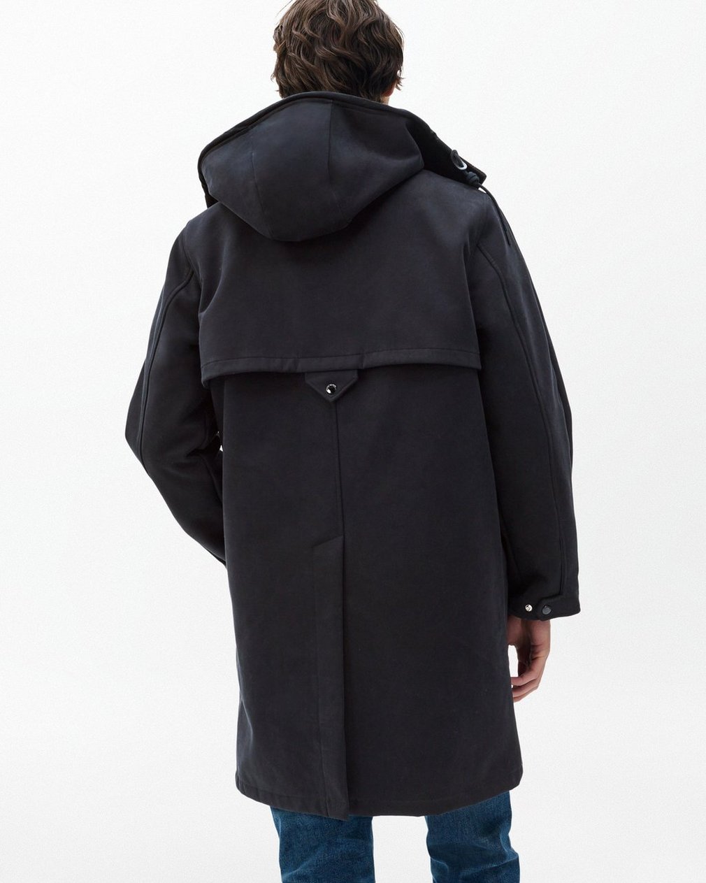 ? 73% polyester, 22% polyamide, 5% elastane? Full-zip front with a hidden snapped storm placket? Metal two-way front zipper? Ring snaps at cuffs & detachable hood? Exposed spring snaps at back vent and pocket interiors? Two front hip pockets & one internal welt pocket? Hand wash cold & lay flat to dry or dry clean? Imported. Italian materials.
