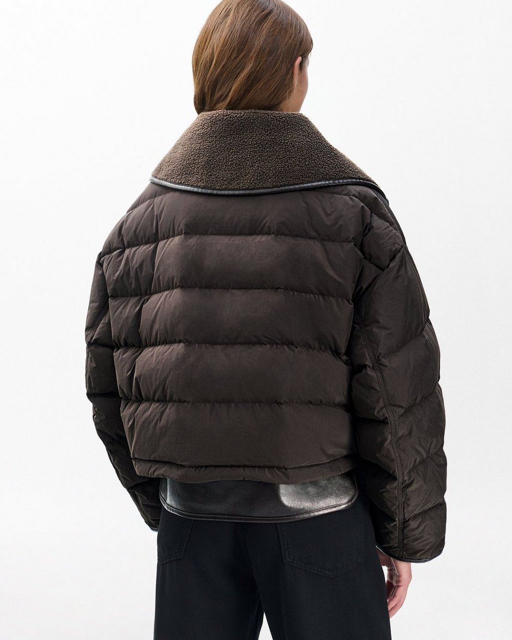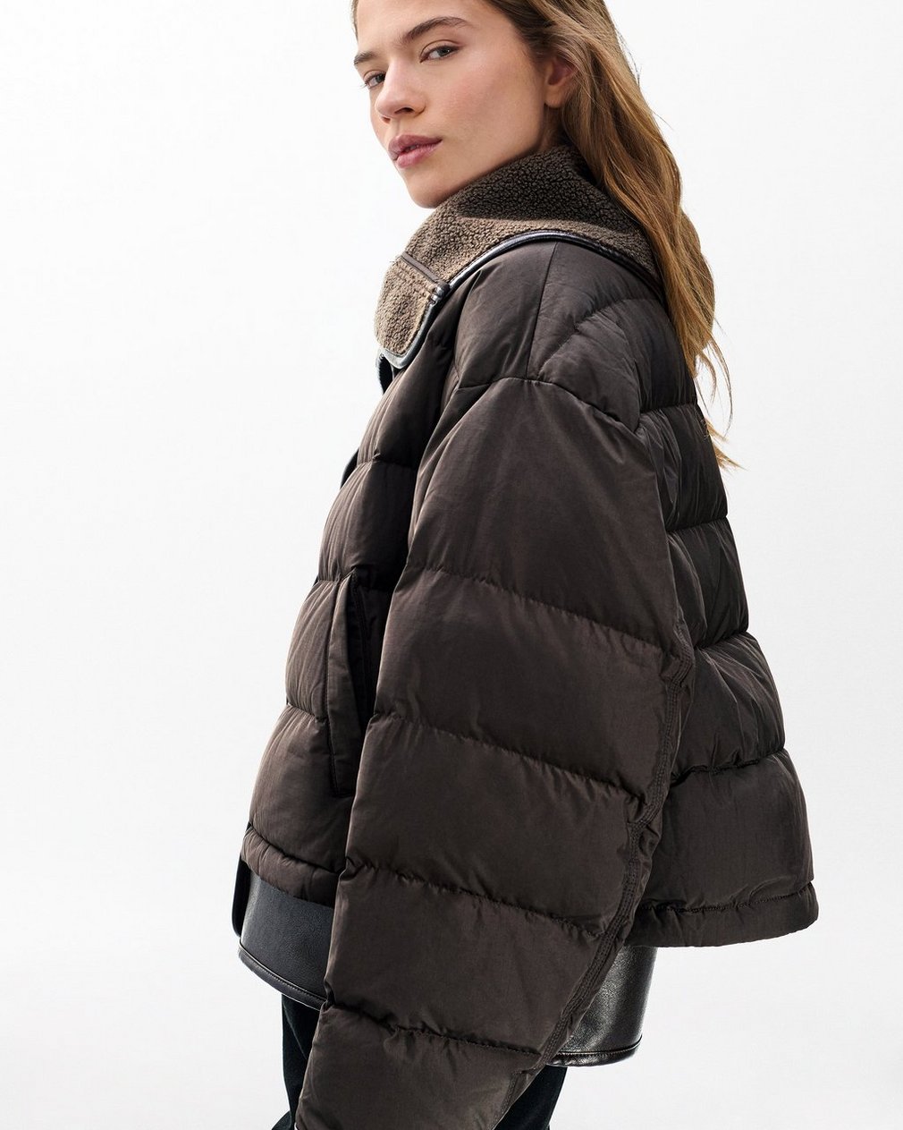 Your new favorite puffer. This essential cold-weather jacket plays with texture and dimension to create intrigue, like an oversized sherpa-lined collar and faux leather trim throughout. Down filling and an elastic hem ensures a cozy, comfortable fit when you’re buttoned up.
