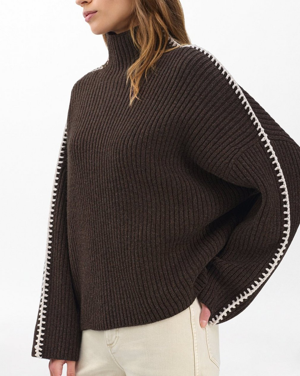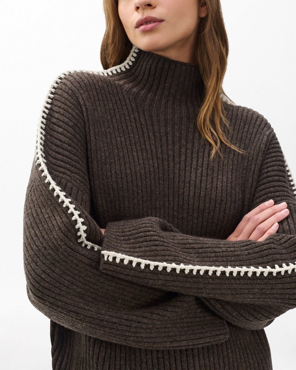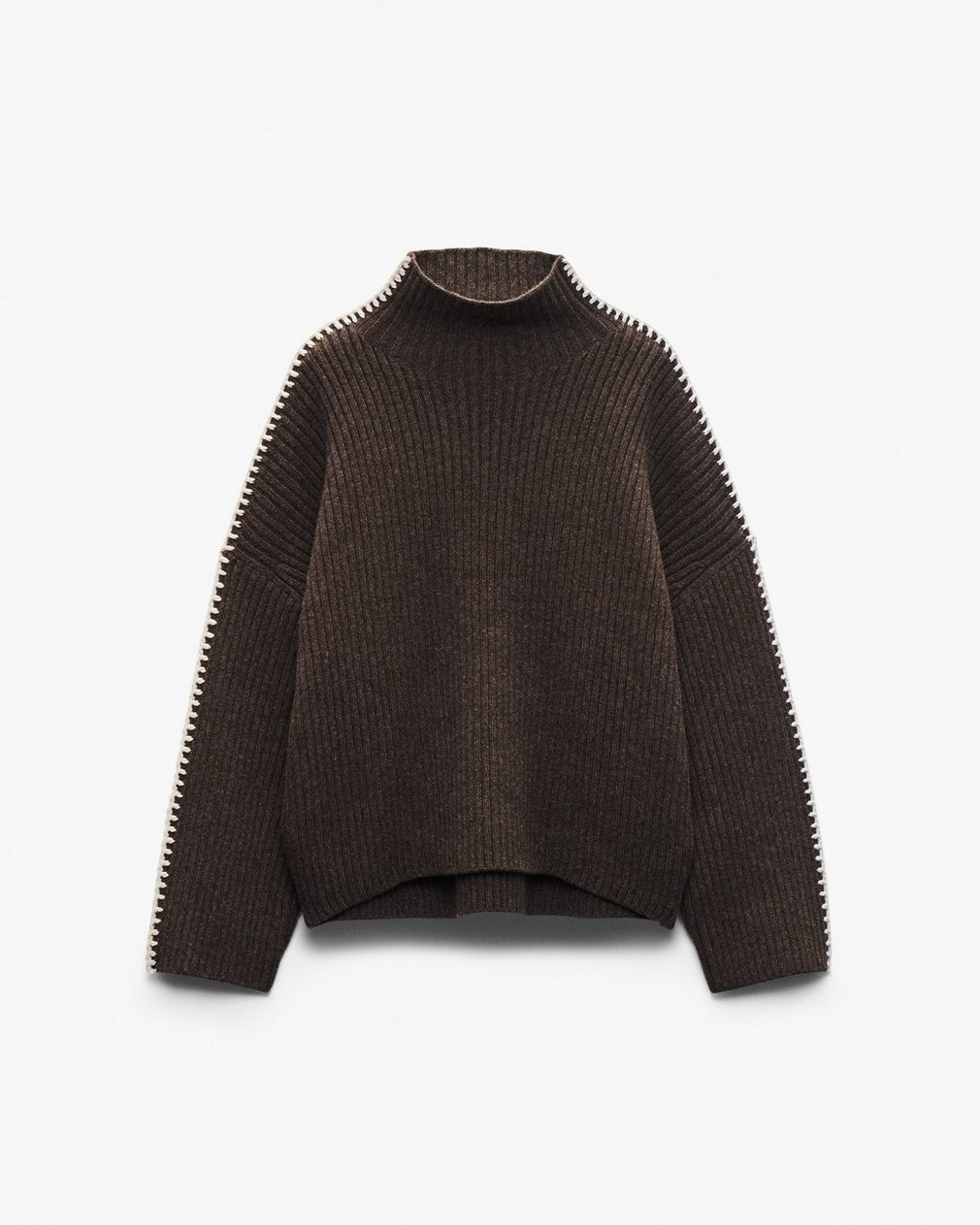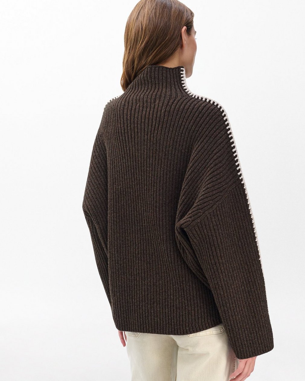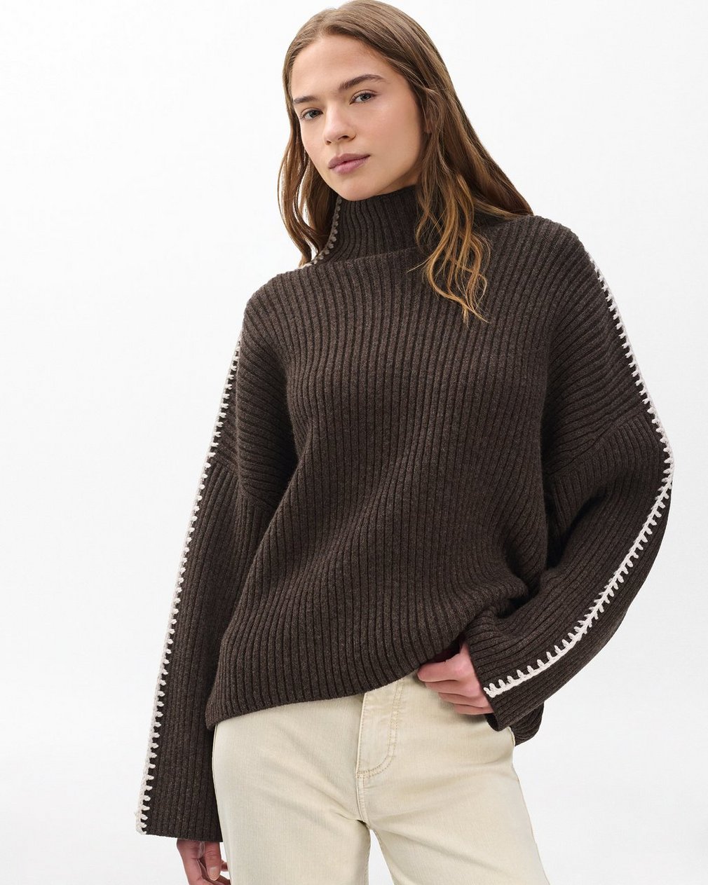 Bringing back a bestseller. This turtleneck sweater is knit for an oversized fit from soft wool in a ribbed stitch. Contrast whipstitching along the sleeves gives it that signature hand-finished look. This style runs large, so for the closest fit, consider sizing down.