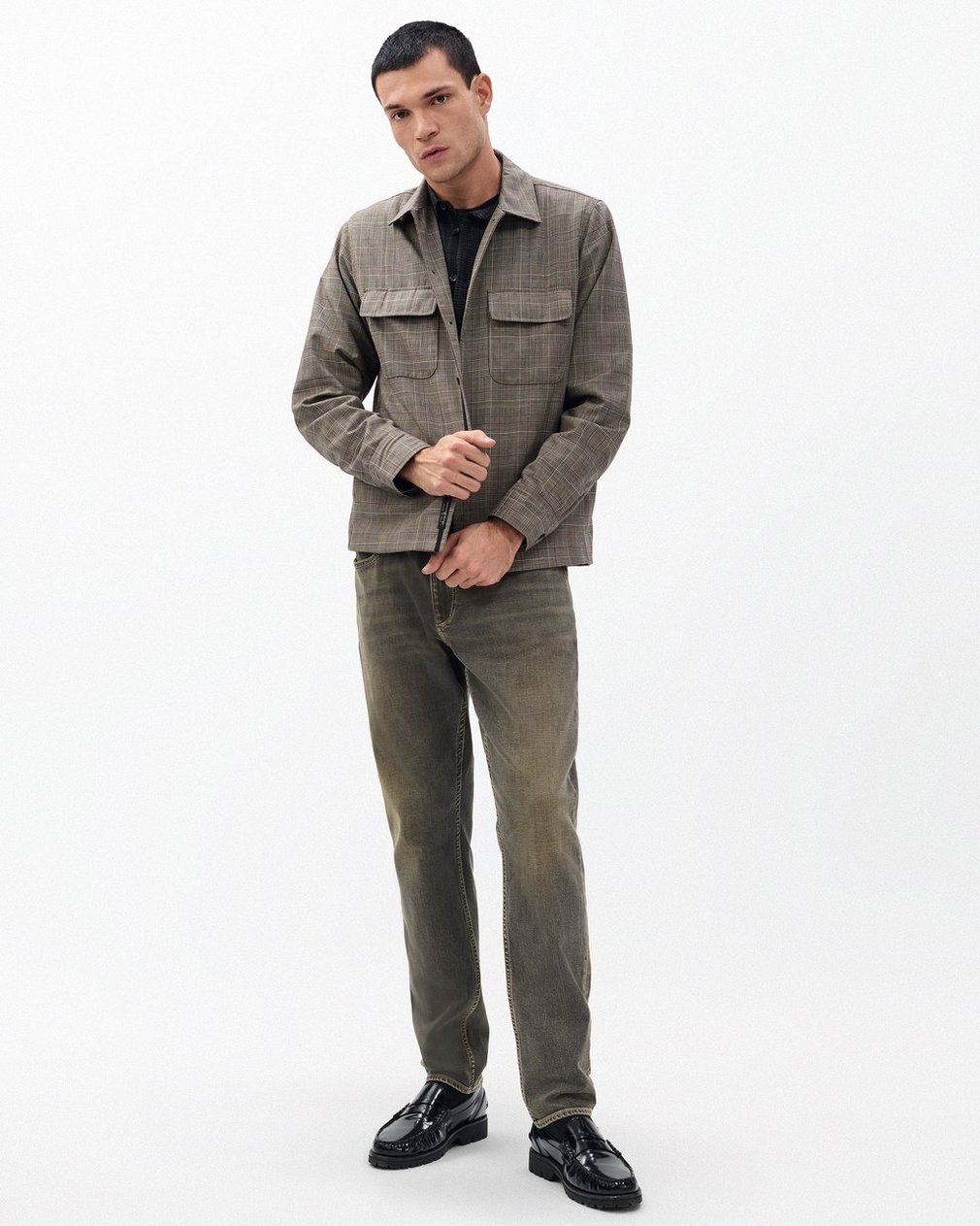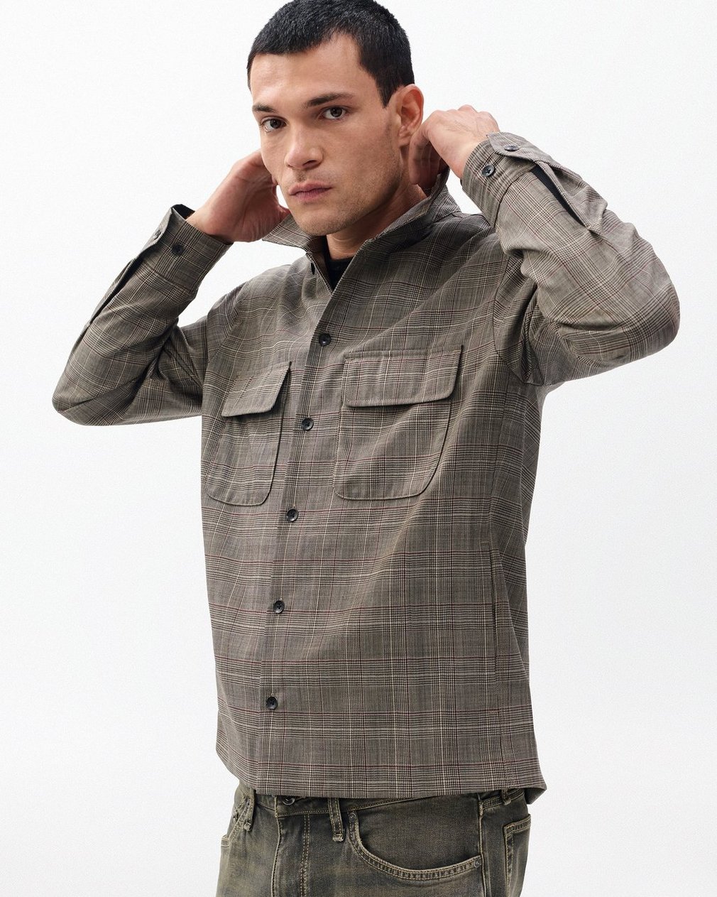 The ultimate hybrid layer. Crafted from fine wool woven with a Glen plaid pattern and sourced from Nova Fides, an Italian mill celebrated for blending heritage, technology, and artisanal craftsmanship. Signature distressed buttons and military-inspired flap pockets nod to classic workwear.