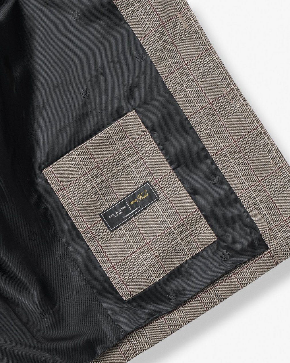 ? Body: 100% wool? Lining: 100% polyester? Custom rb dagger lining? Four-hole button closure? Distressed buttons at front, cuffs, and pocket flaps? Nova Fides mill label? Side entry waist pockets? Dry clean only, delicate process? Imported. Italian materials.