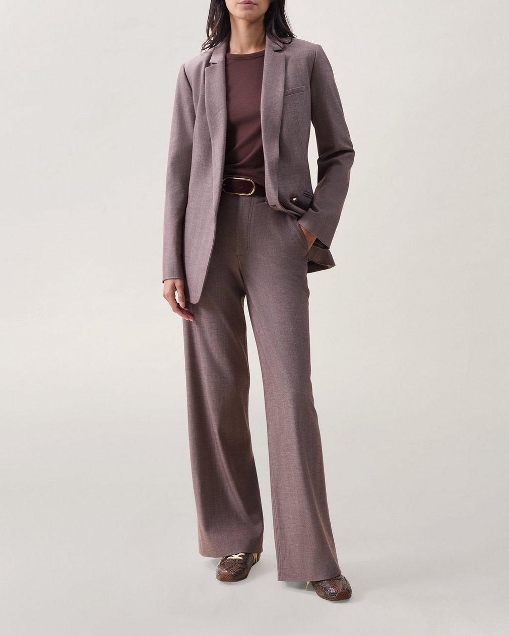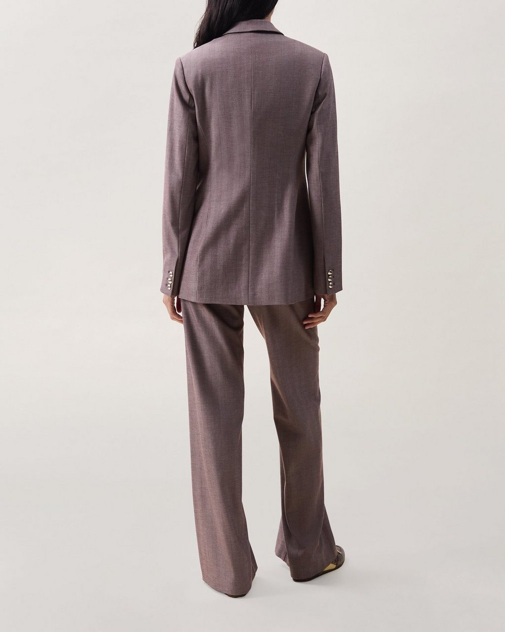 ? Body: 63% polyester, 35% rayon, 2% elastane? Lining: 51% viscose, 49% polyester? Satin lining? Centered front button closure? Shoulder pads? Inside keeper button at center front? Buttons at cuffs? Welt pockets at wearer’s chest and hips? Dry clean only? Imported