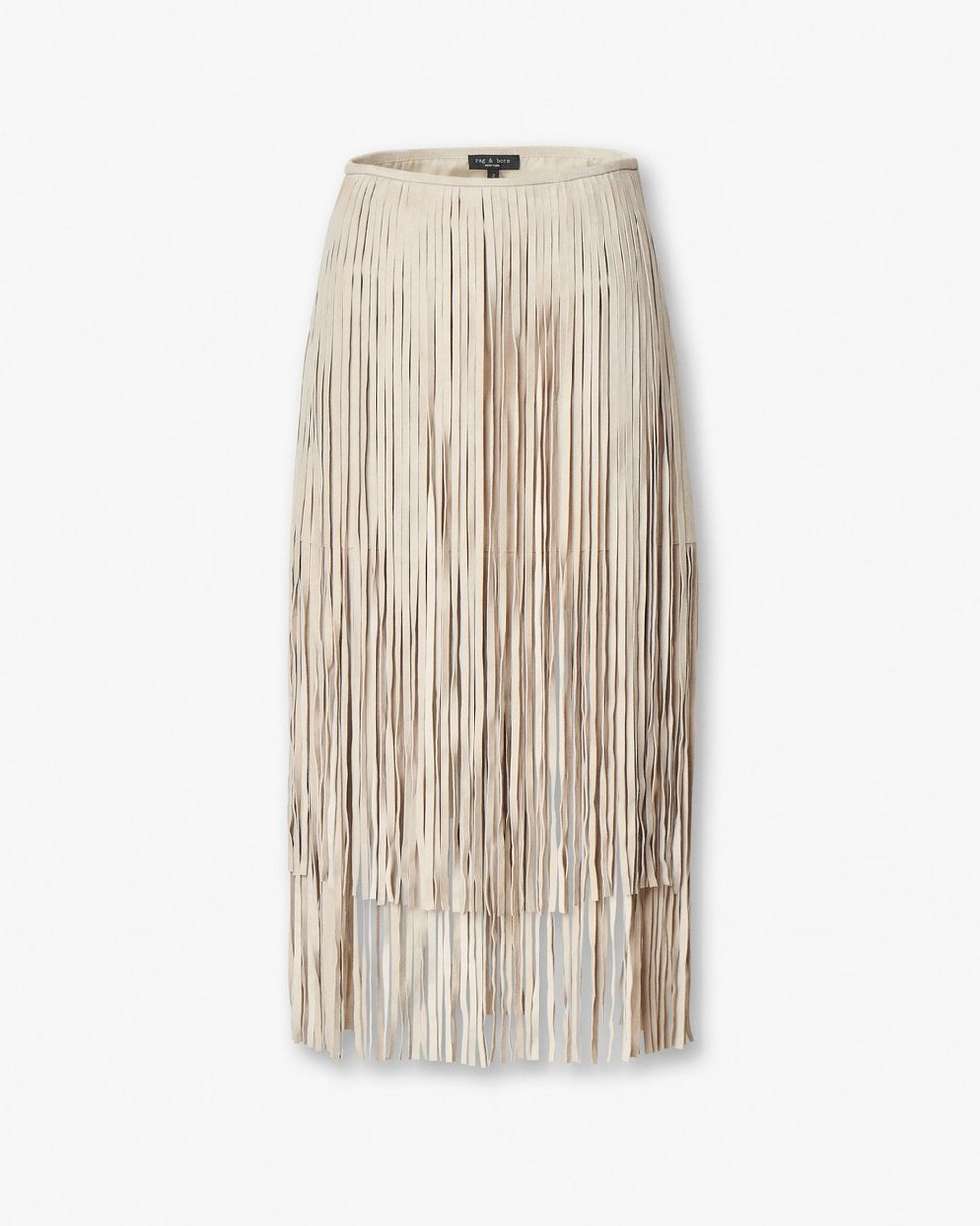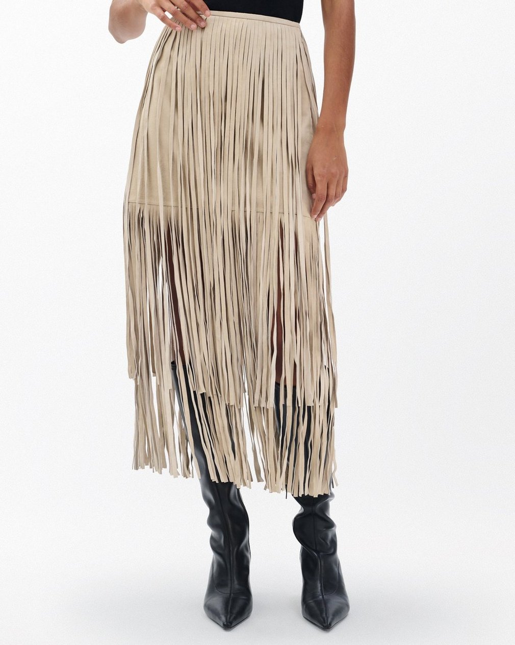 Fringe benefit. Crafted entirely from soft suede, this skirt combines midi-length fringe layered over a fringed mini skirt. With an ultra-luxurious feel, it brings unique movement and a statement look to any dance floor or dinner plan this party season. Pair yours with metallic ballet flats to create contrast or match it to the Kara Suede Jacket for a monochromatic moment.