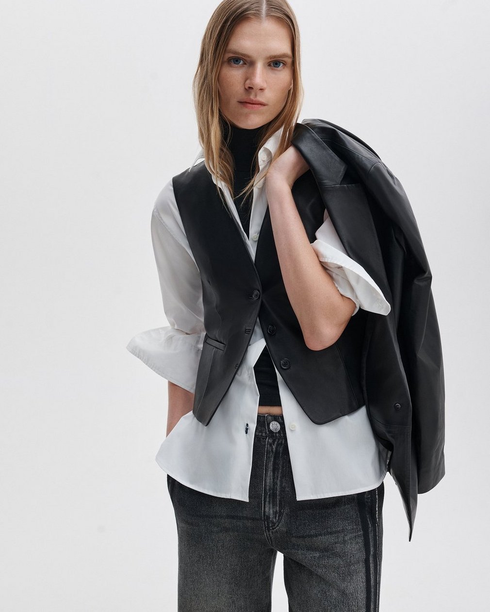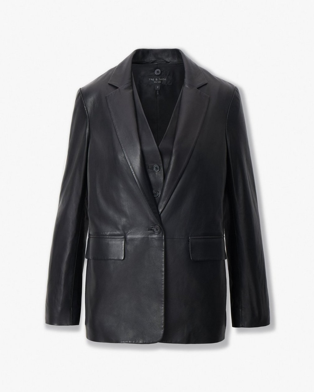 ? Body: 100% lamb leather? Lining: 100% polyester? Woven lining? Single-button silhouette? Blazer: Button at center front and at sleeve vents? Vent at center back? Attachment button for vest at center back neck? Inside vest: Buttons at center front ? Blazer: Two front hip pockets? Vest: Two welt hip pockets? Professional leather clean only? Imported