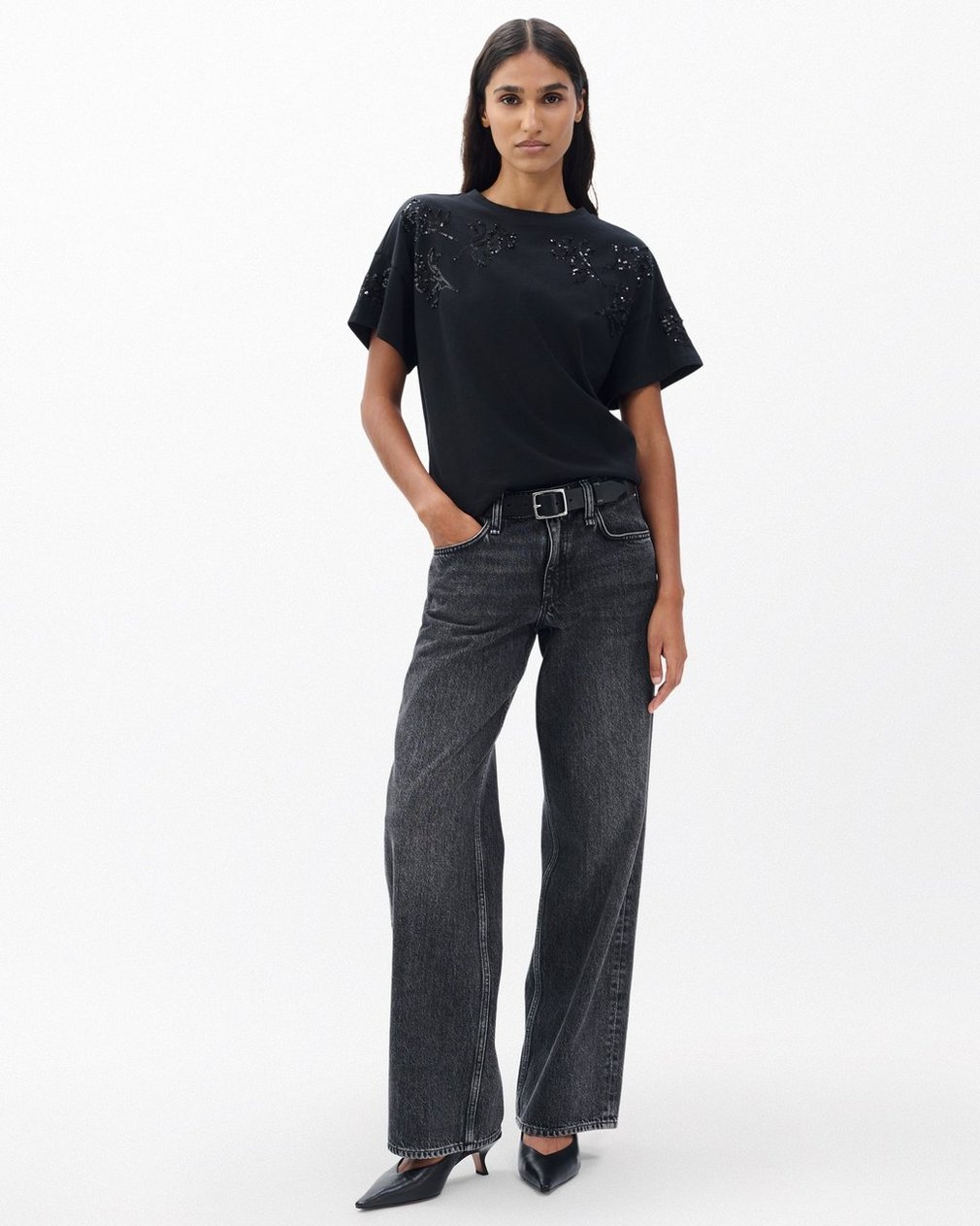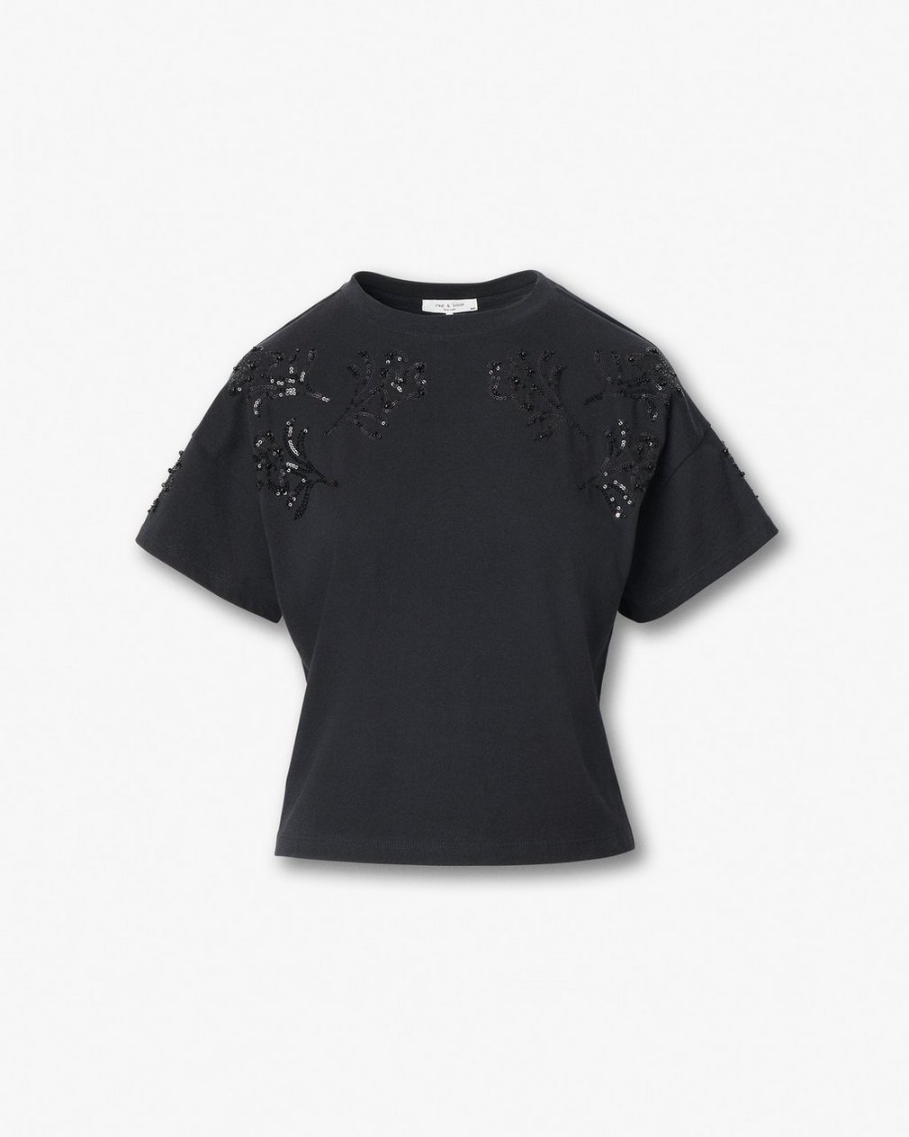 Subtle statement. Tonal hand-beaded and sequined floral motifs bloom across the top and sleeves of this boxy short-sleeve T-shirt cut from soft Peruvian cotton. Wear the glamorous style with denim during the day, or with a black satin skirt for festive parties at night.
