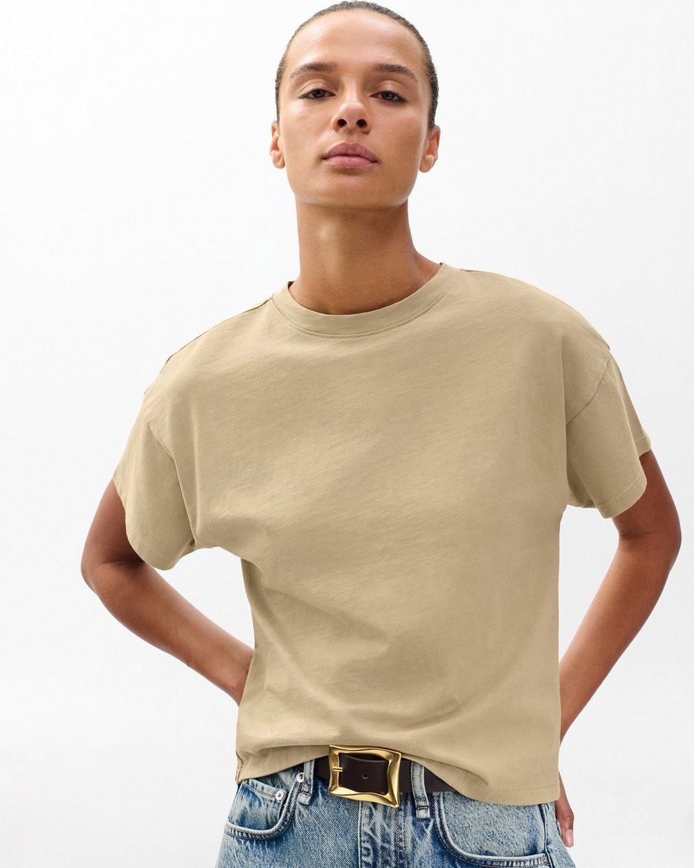 Proportions perfected. Our new short-sleeve tee is cut from heavier cotton jersey in a modern boxy fit. It plays well with everything in your closet: tailored trousers for contrast, denim for off-duty ease.