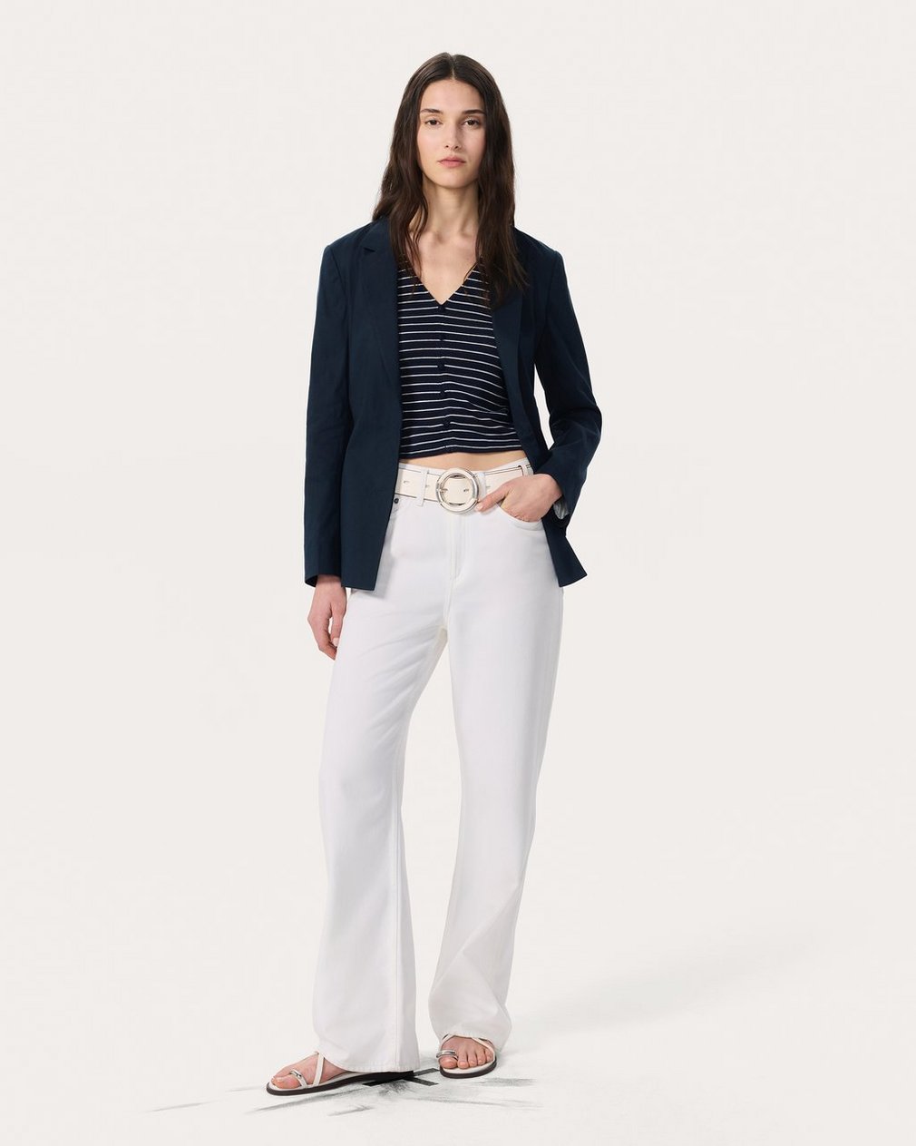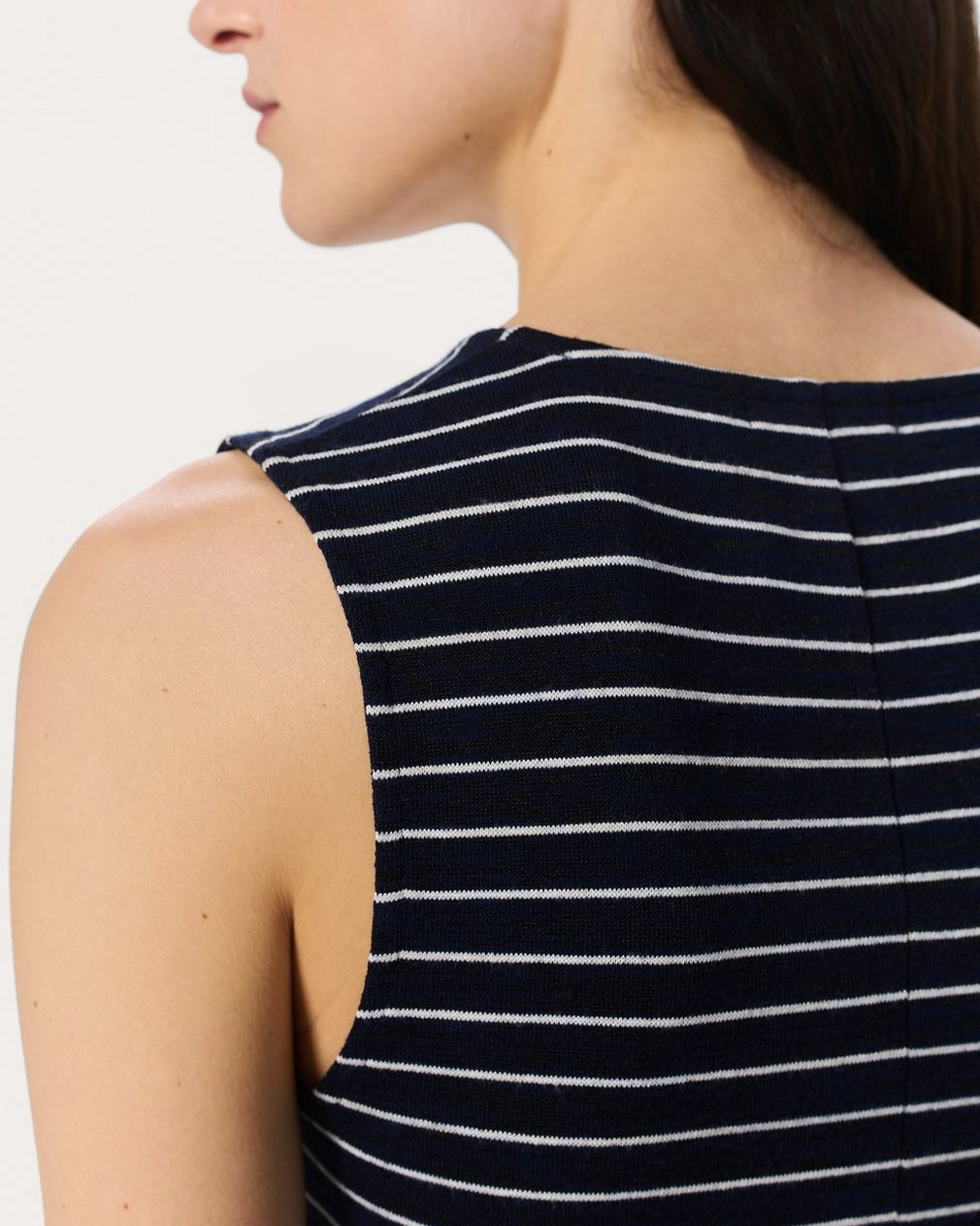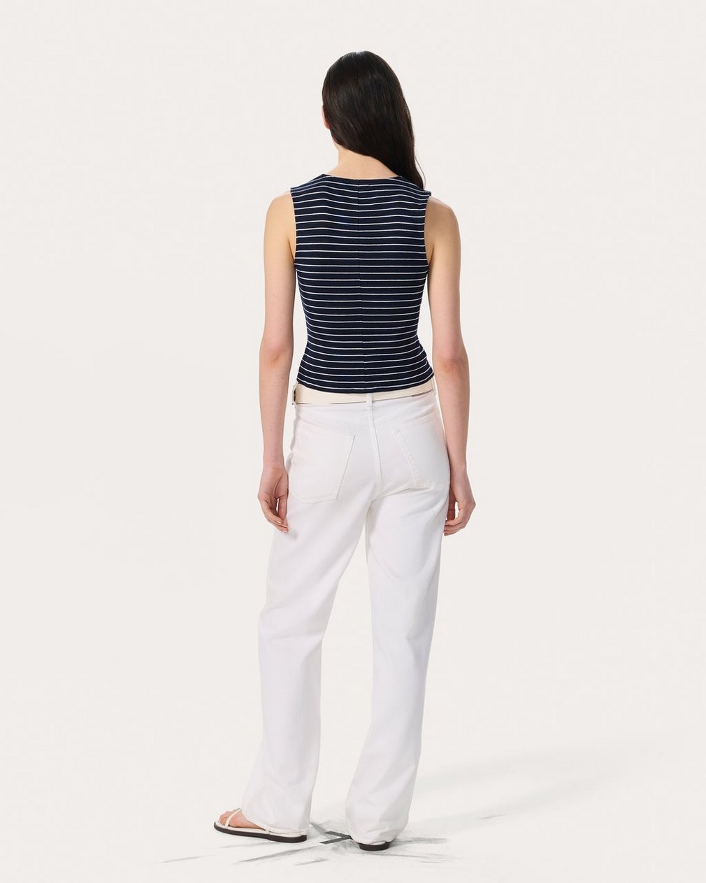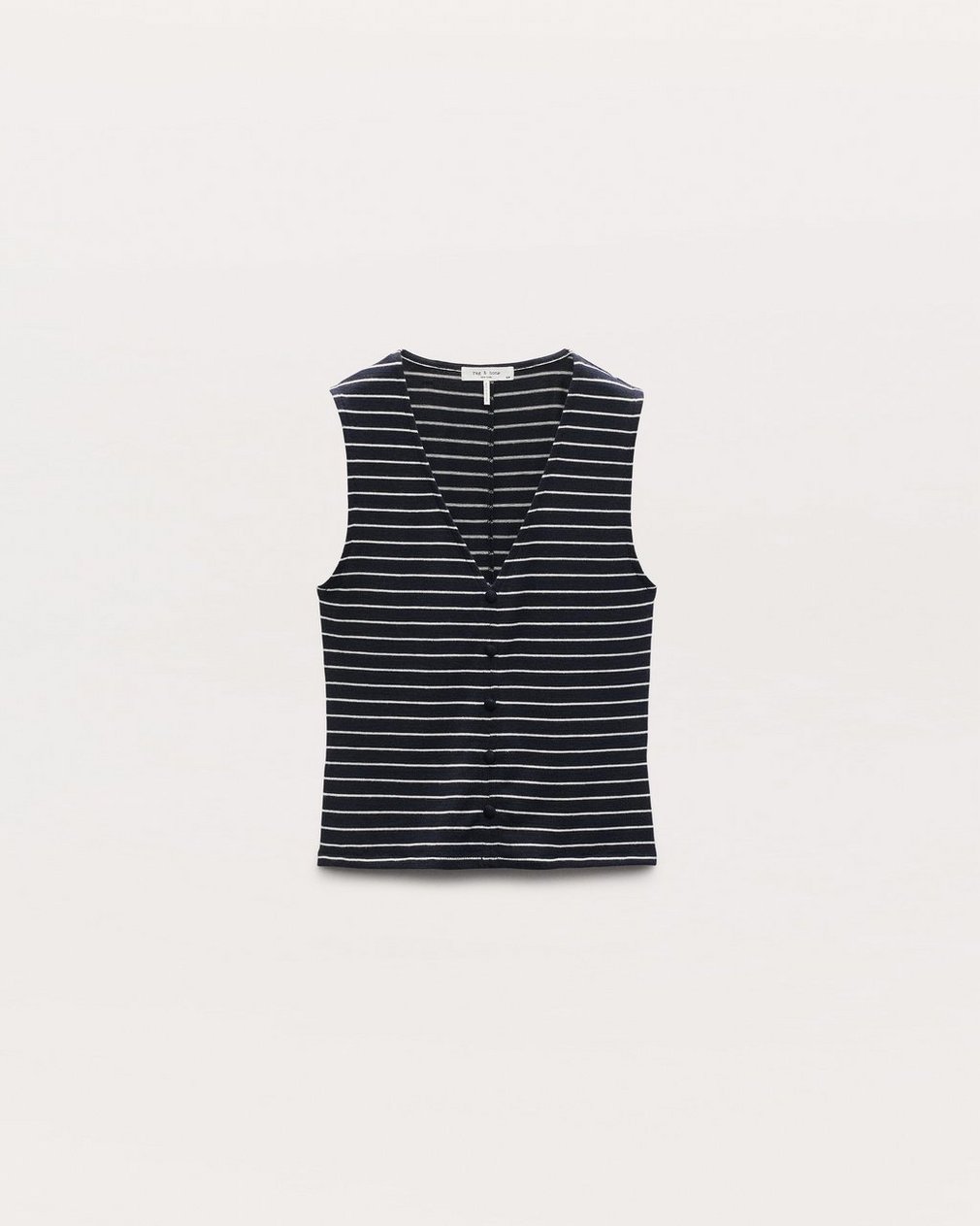 The polish of a vest meets the ease of a tank. This slim-fit striped top is knit from two different types of lightweight, super-soft stretch yarn for a sleek yet comfortable look wherever you wear it. It fastens up the front with tonal covered buttons.