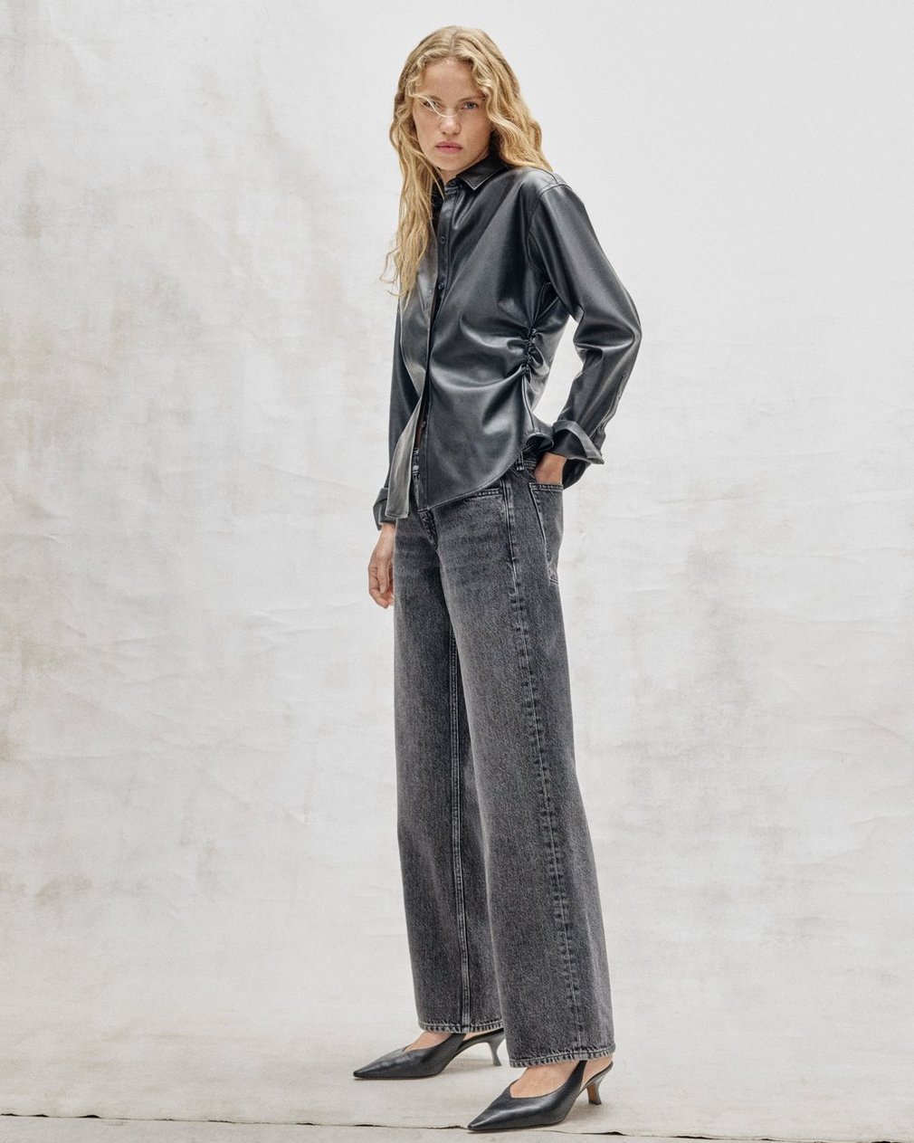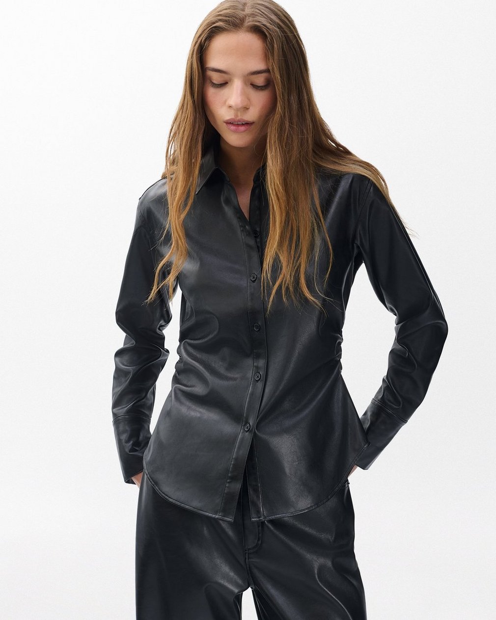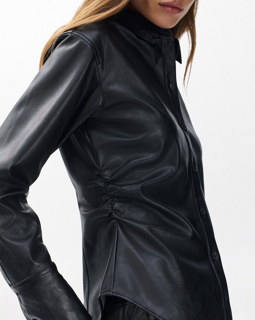 Refined simplicity. Crafted from soft faux leather, this button-down shirt features ruched sides to reinforce its sleek slim fit. With a collar and long cuffs, it brings an edge to a classically tailored style.