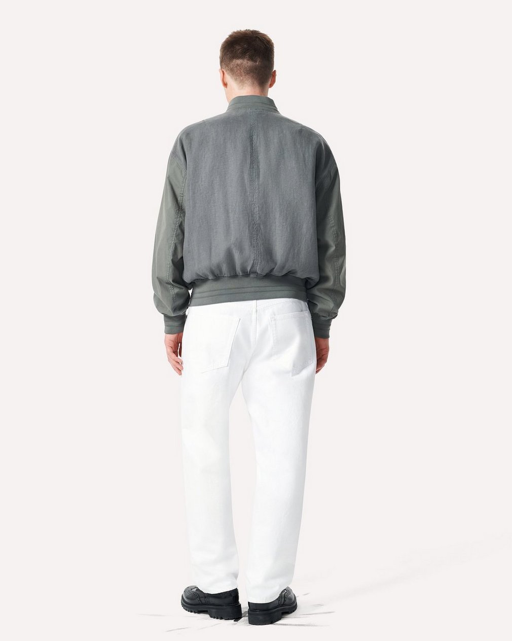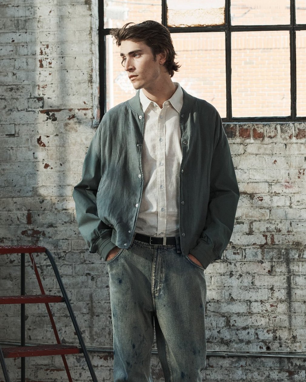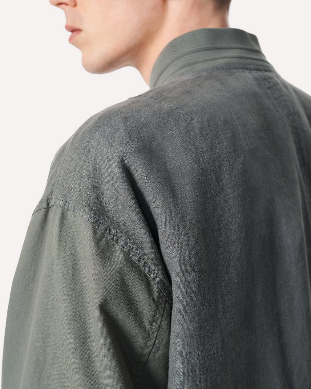 Referencing heritage souvenir, varsity, and bomber jackets, this modern layer is crafted with a lightweight linen body and cotton sleeves for summer days when the temperature dips. It’s overdyed to create a unique depth of color enhanced by the shift in natural fabric textures across the garment. Hidden snaps secure the side pockets, while cuff adjusters ensure a snug fit.