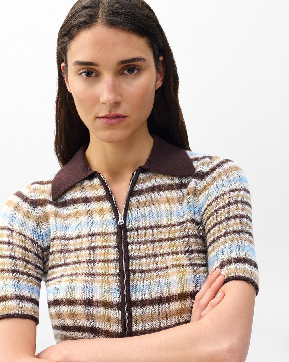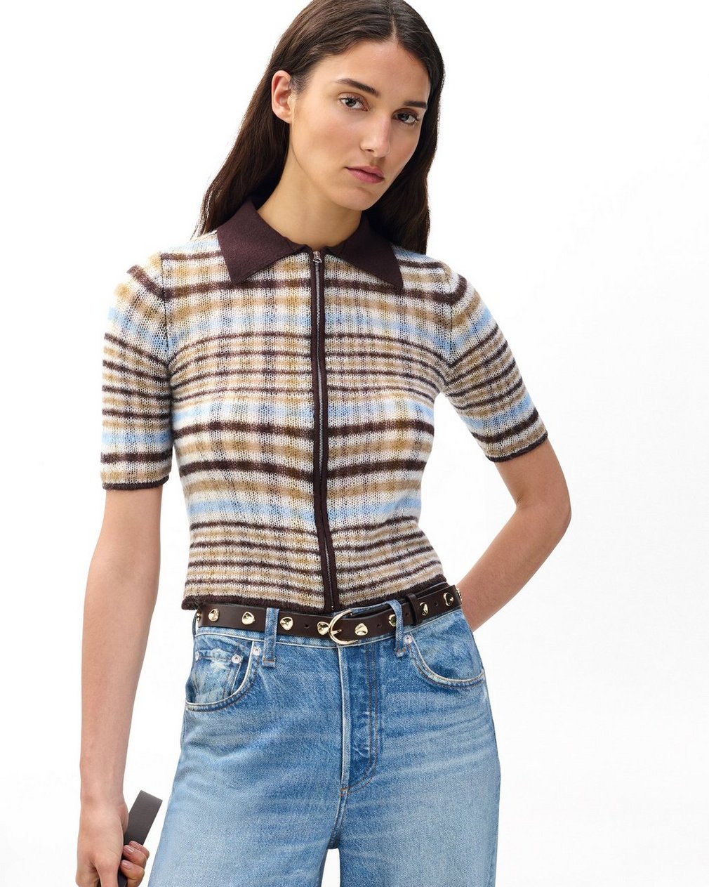 Perfect illusion. Knit from airy yarn spun with soft wool and mohair, this striped slim-fit polo combines two layers of horizontal and vertical stripes to create the look of a colorful plaid. It’s finished with a contrast point collar and zip closure that offers easy, versatile styling.