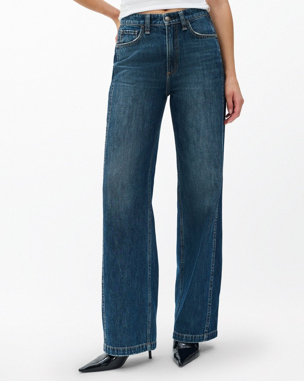 The Logan. Our laid-back, mid-rise jeans with a roomy fit through the hip and thigh. (Pro tip: Take your natural size and wear low on your waist for a relaxed look, or size down for a higher rise.) Crafted from Lightweight Rigid non-stretch denim that provides structure, but breaks in over time for a soft and comfortable feel. In Two-Tone Indigo, a medium-indigo wash with a contrasting dark-indigo wash spliced in at the sides.