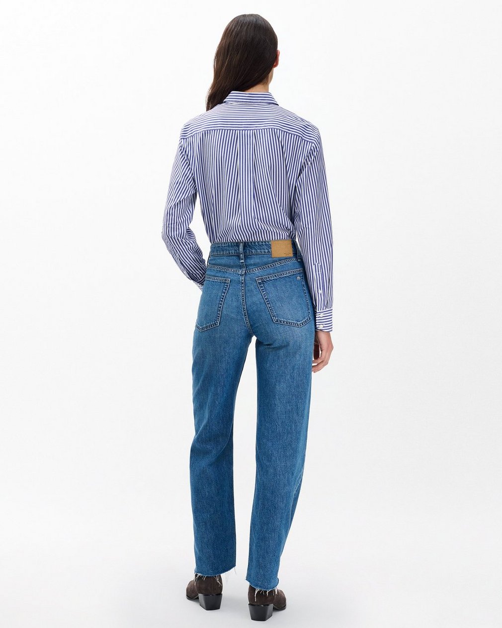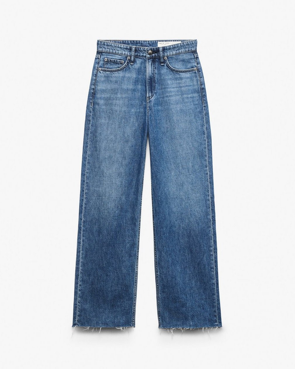 The Logan. Our laid-back, mid-rise jeans with a roomy fit through the hip and thigh. (Pro tip: Take your natural size and wear low on your waist for a relaxed look, or size down for a higher rise.) Crafted from our Featherweight denim that’s supremely soft and super light, with an easy drape. Feels airy & effortless. In Delmont, a medium-dark indigo wash with a cut hem.