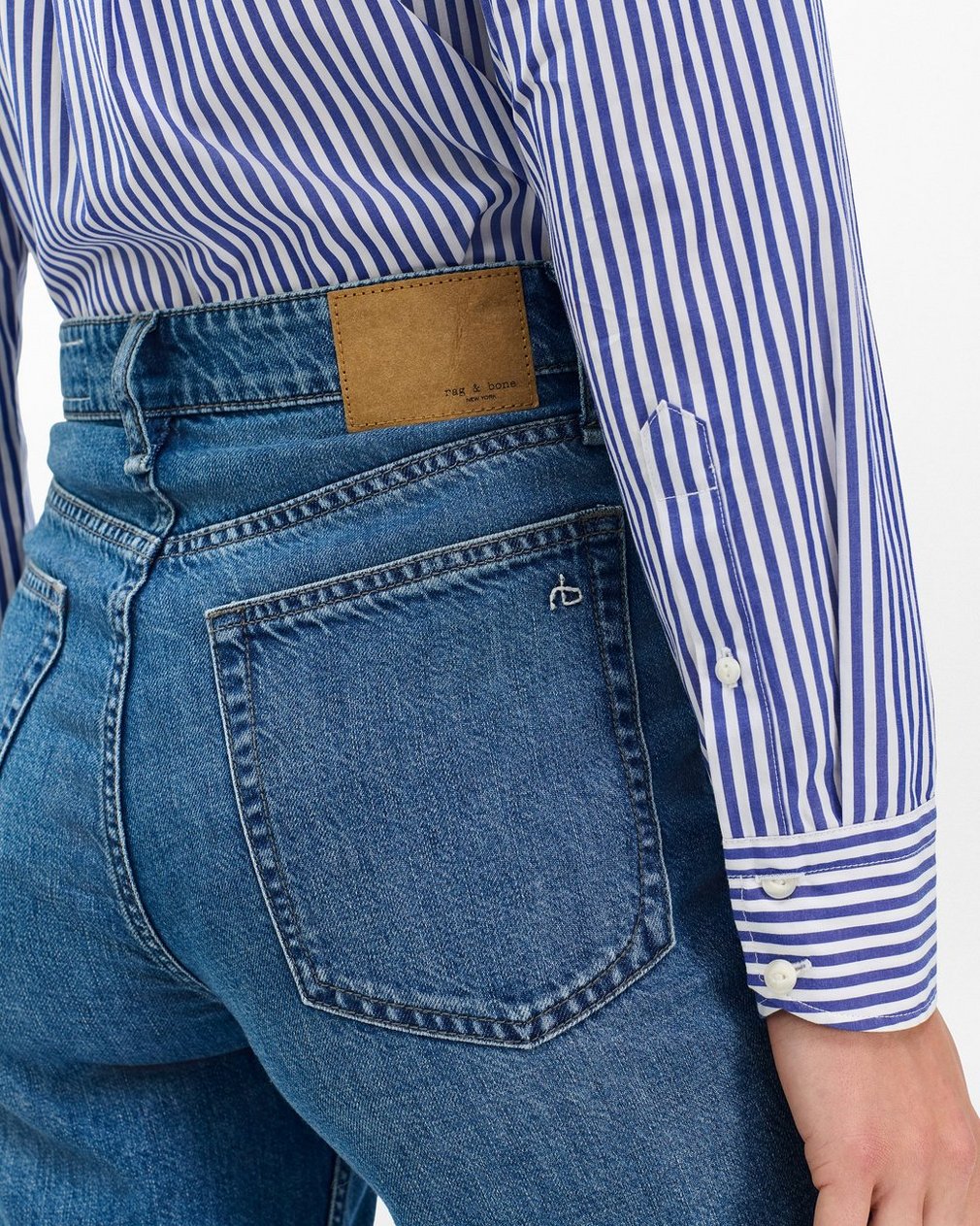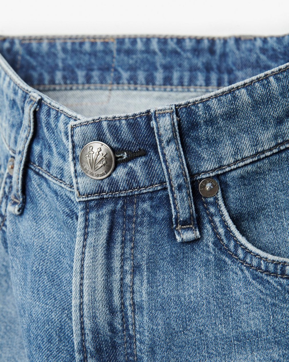 ? 64% cotton, 36% lyocell? Featherweight Denim in Delmont, a medium-dark indigo wash with a cut hem? Machine wash cold inside out on delicate & lay flat to dry? Color may bleed? Signature dagger button and branded rivets? Zip fly with button closure? Five-pocket silhouette ? Imported