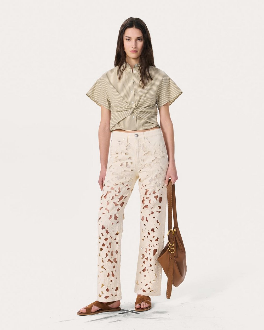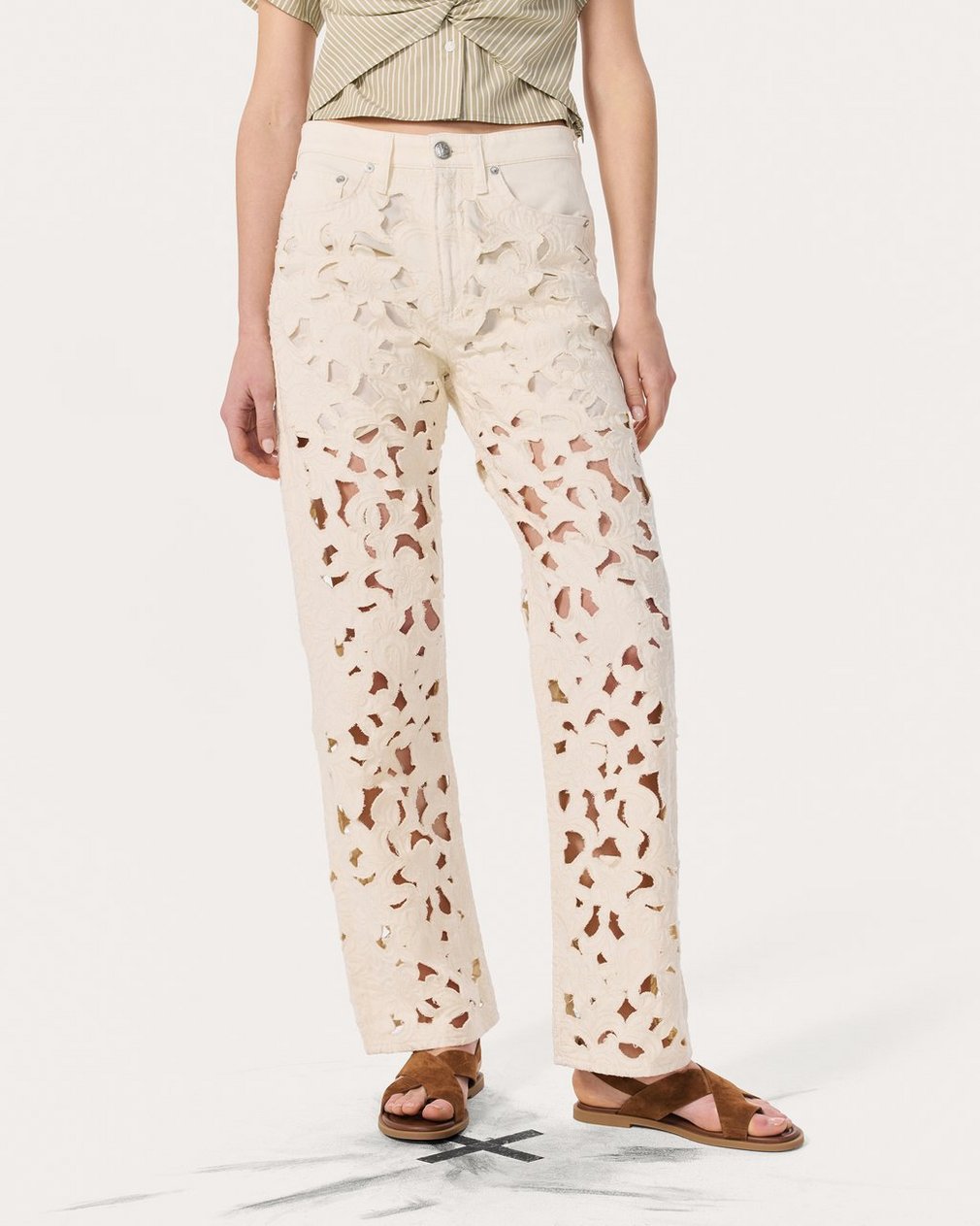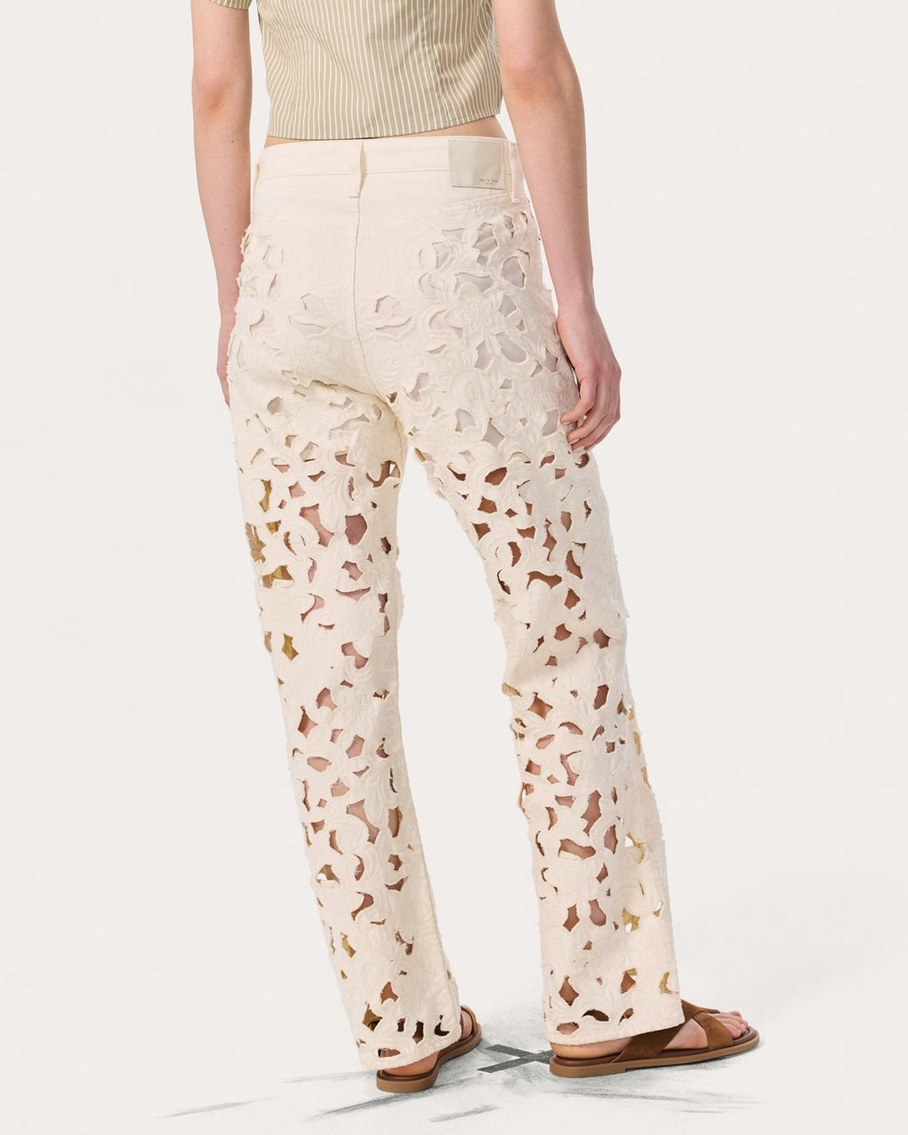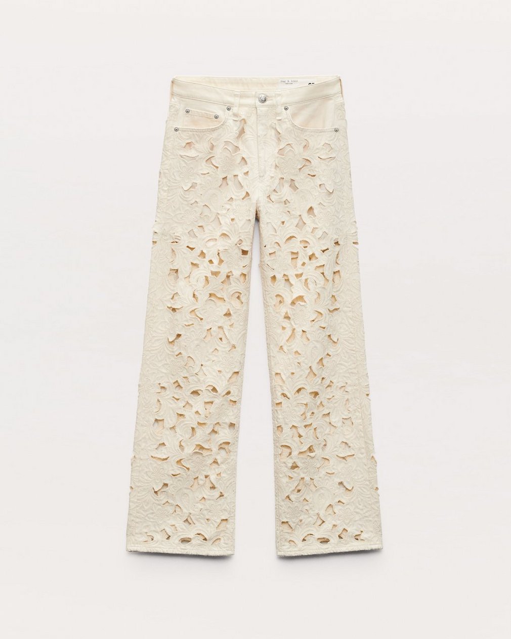 ? 100% cotton? Lightweight Rigid Denim? In Ecru Floral Cutout, a soft, warm white featuring floral embroideries and laser-cut details? Zip fly with a button closure? Signature dagger tack buttons & washer rivets? Partially lined to the length of mini shorts? Five-pocket pant ? Hand wash only? Imported