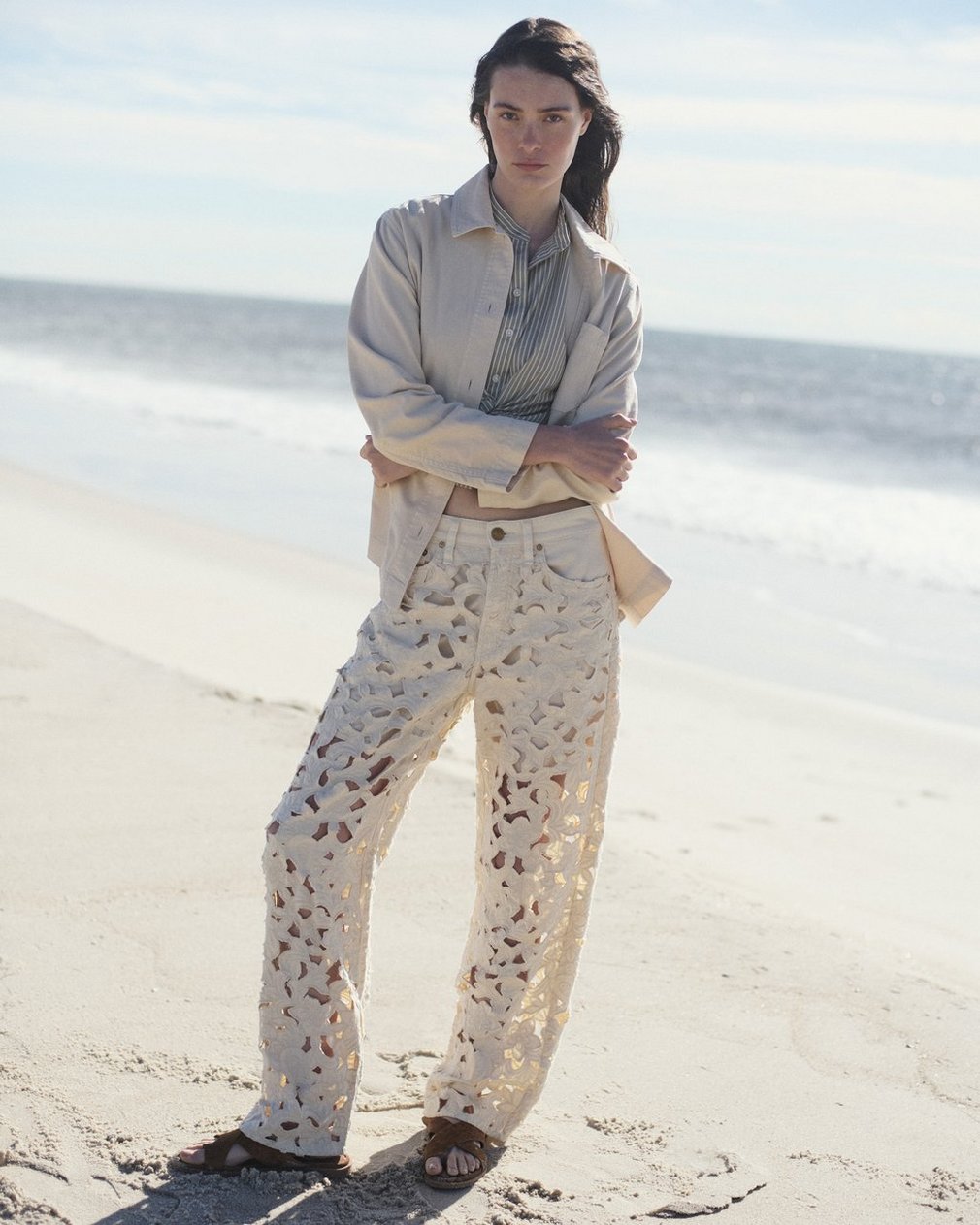 The Logan. Our laid-back, mid-rise jeans with a roomy fit through the hip and thigh. (Pro tip: Take your natural size and wear low on your waist for a relaxed look, or size down for a higher rise.) Crafted from Lightweight Rigid non-stretch denim that provides structure, but breaks in over time for a soft and comfortable feel. In Ecru Floral Cutout, a soft, warm white featuring floral embroideries and laser-cut details. Finished with a mini shorts-length lining.