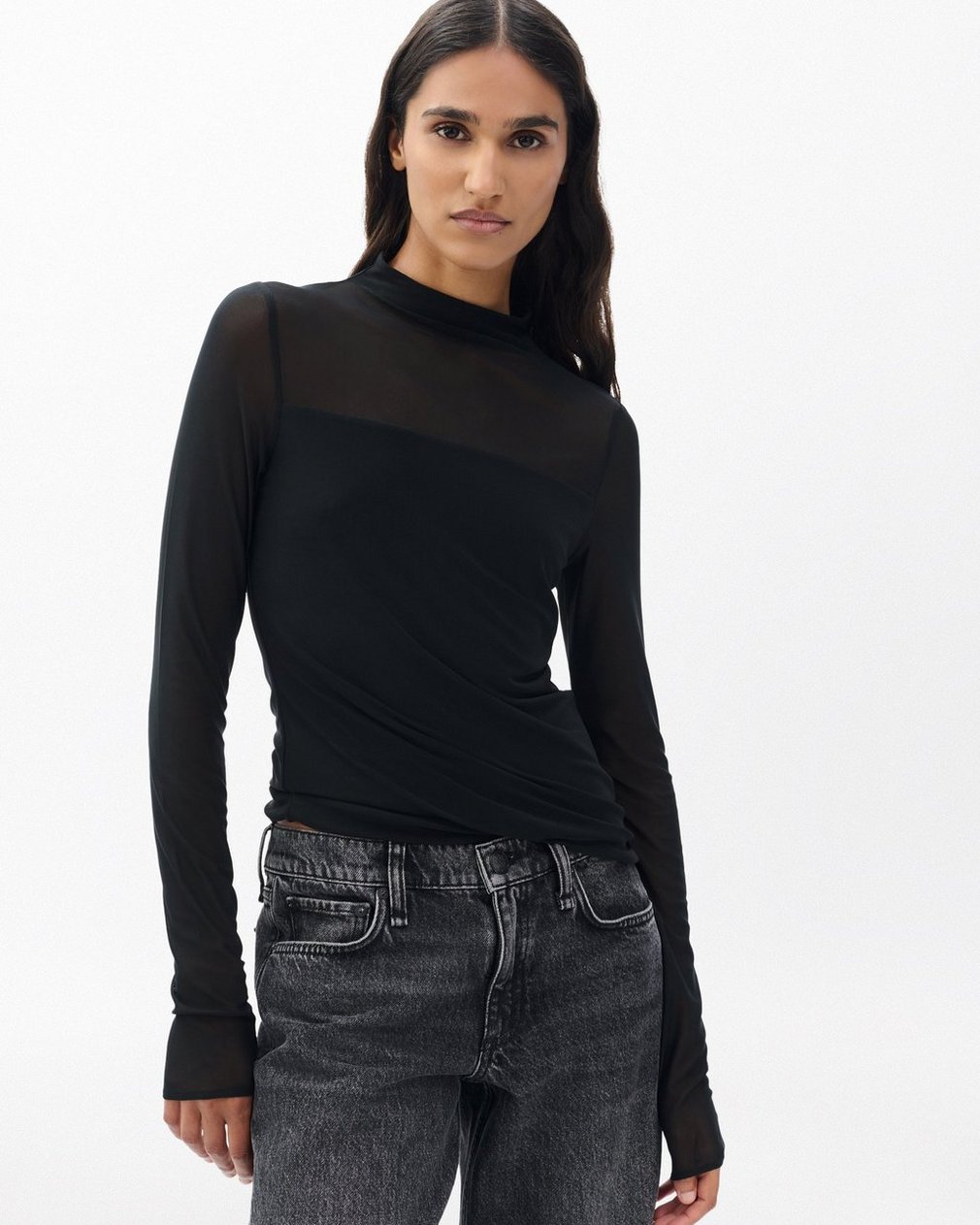 A tried-and-true icon. Although boasting the look of layers, this updated style is a one-piece that combines semi-sheer mesh with slinky stretch jersey, retaining its signature refined fit with long sleeves.