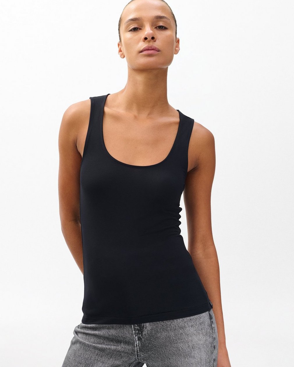 This fitted tank is woven in a Lyocell blend for a distinctly silky feel that makes the perfect layering piece. Dress it up with a blazer or dress it down with a pair of jeans and Retro Runners.