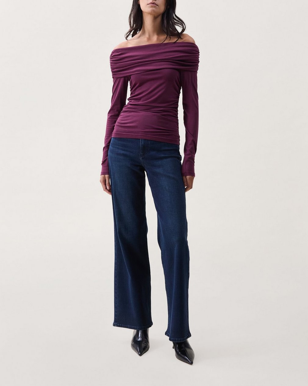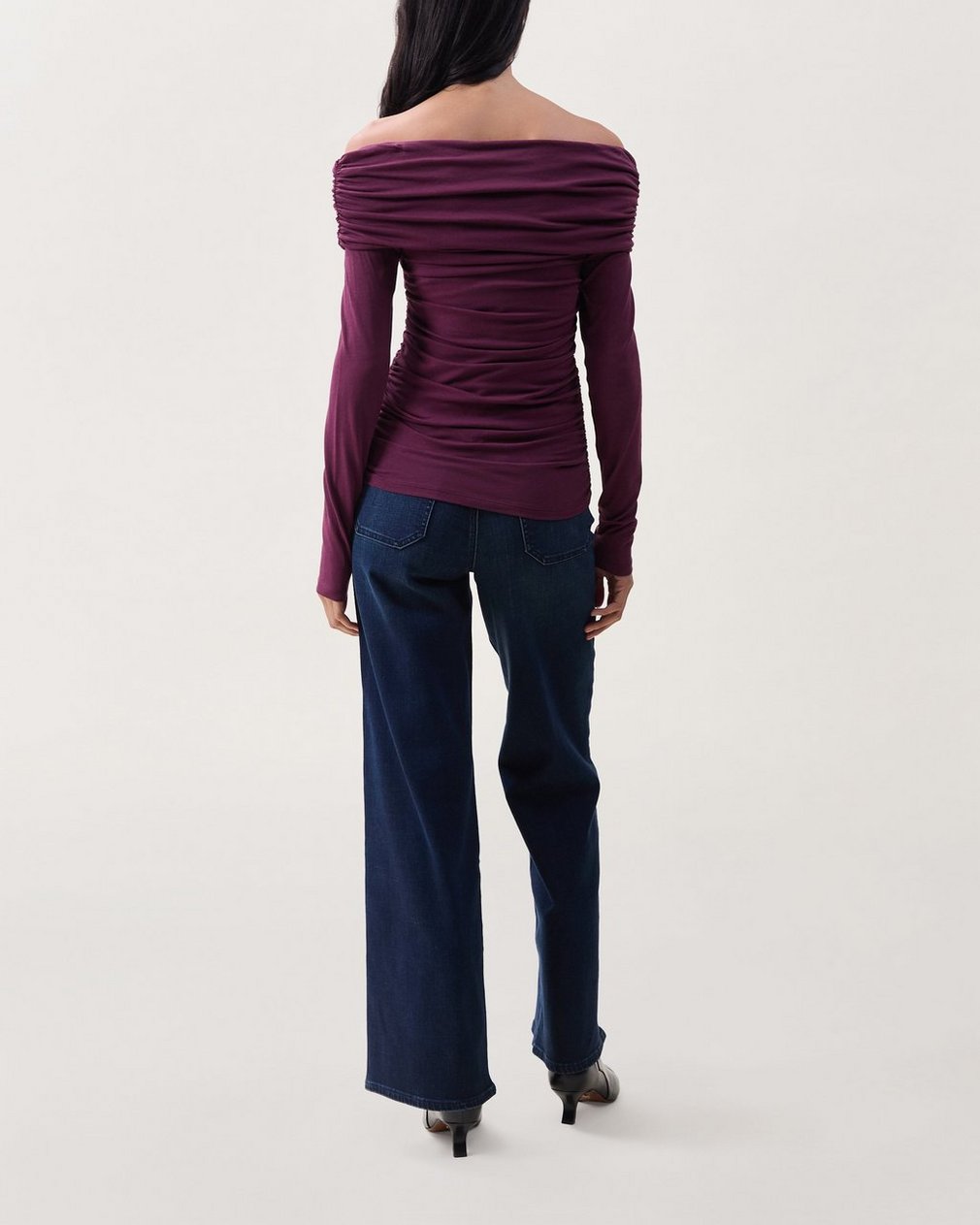 Refined style. This long-sleeve top sits off the shoulders with a ruched effect for subtle detail. Crafted from soft stretchy jersey with a comfortable feel and a smooth, luxurious finish. Effortlessly elevated, for day to night.