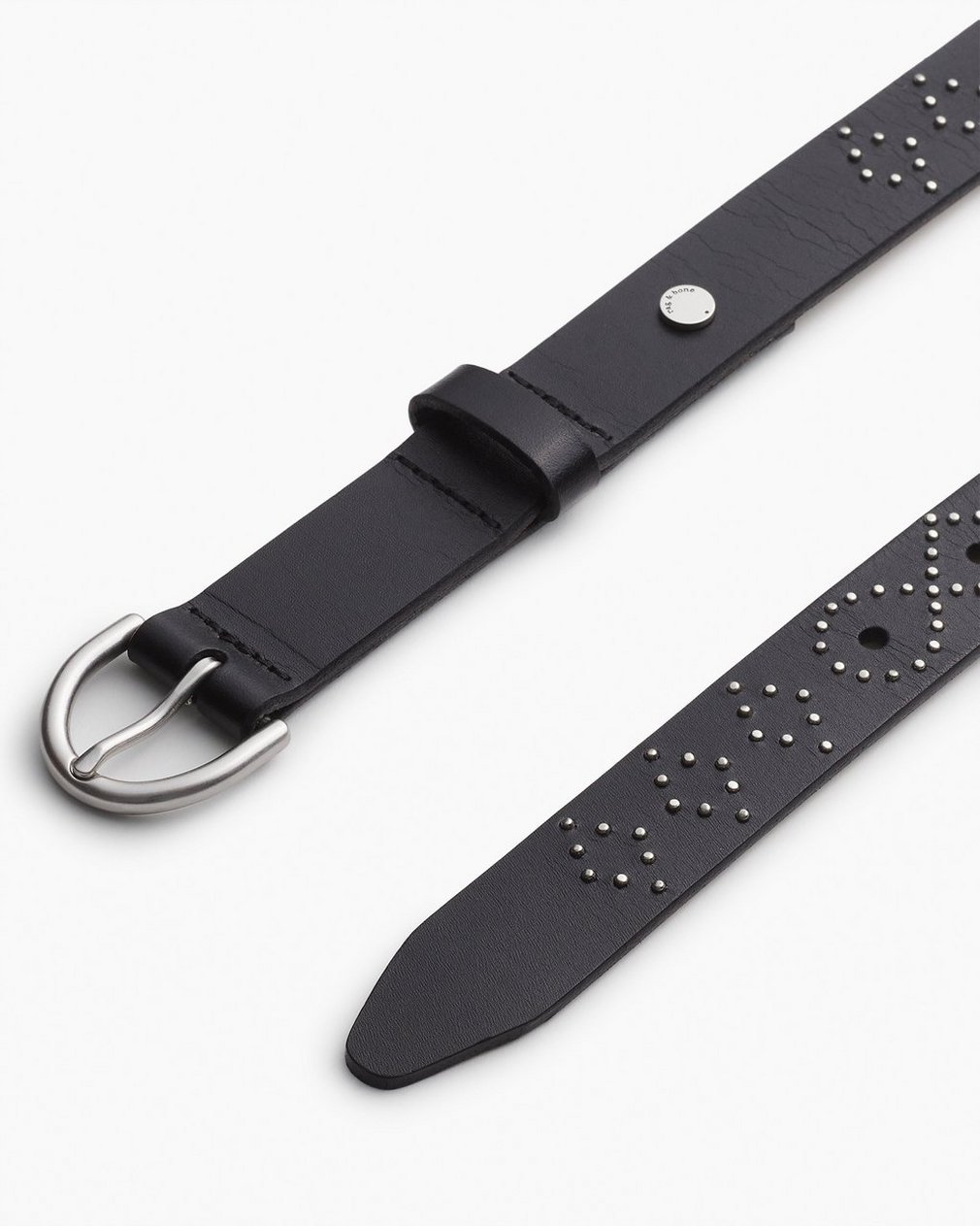 Hardware in focus. Crafted from soft leather, this streamlined belt features micro-studded geometric motifs throughout. Adds an instant flash of detail to any look.