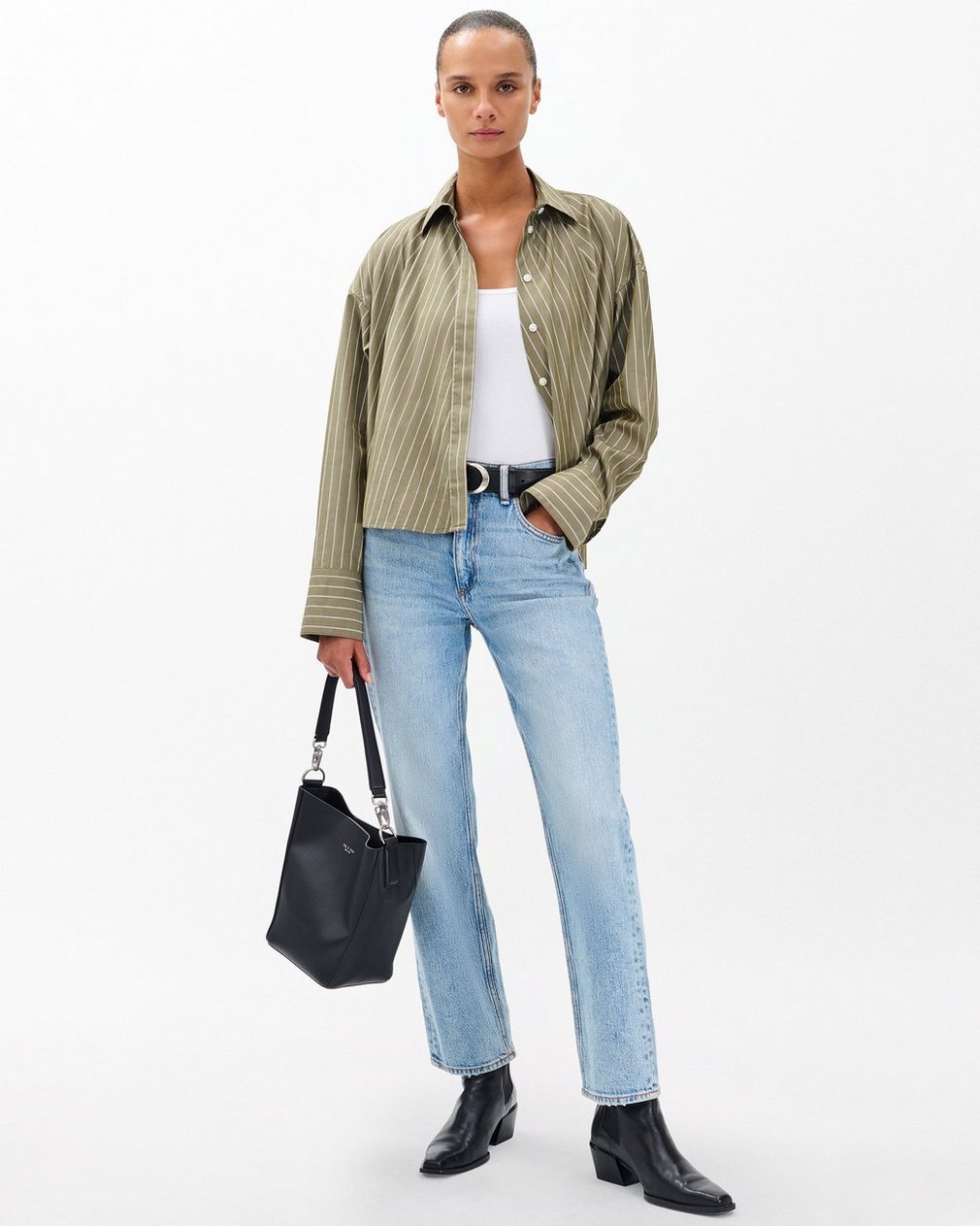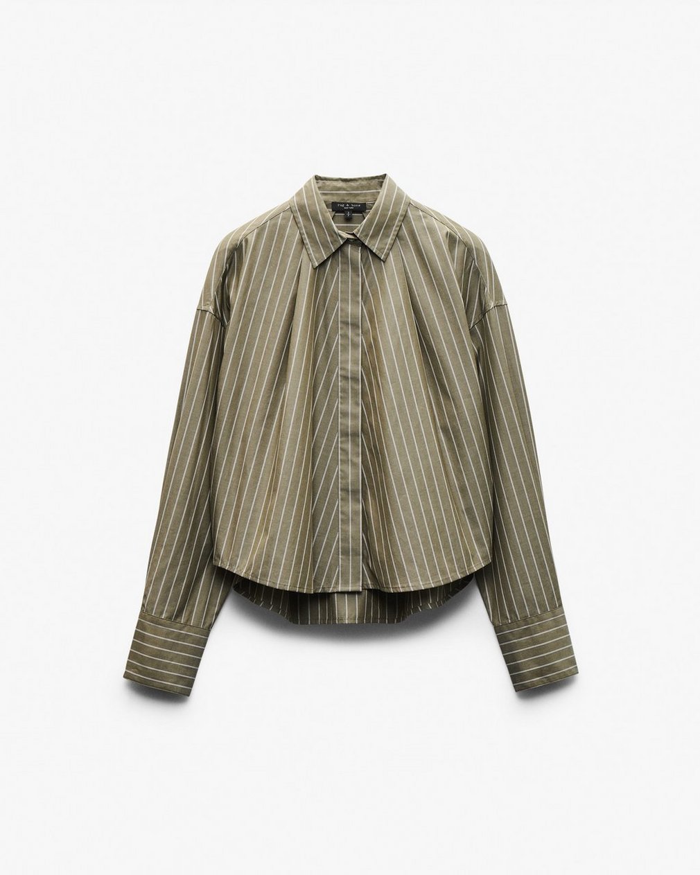 Fresh feel. Our best-selling cotton poplin shirt returns in an easygoing, long-sleeve silhouette. This crisp striped top is tailored for a flowing, boxy fit with a slightly cropped hem that hits just at the hip. Hidden buttons create a clean finish with a focus on the fabric.