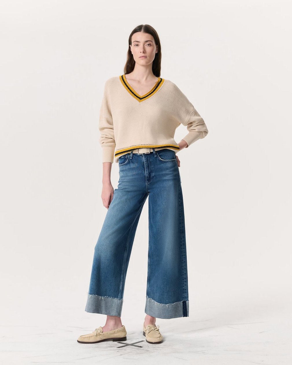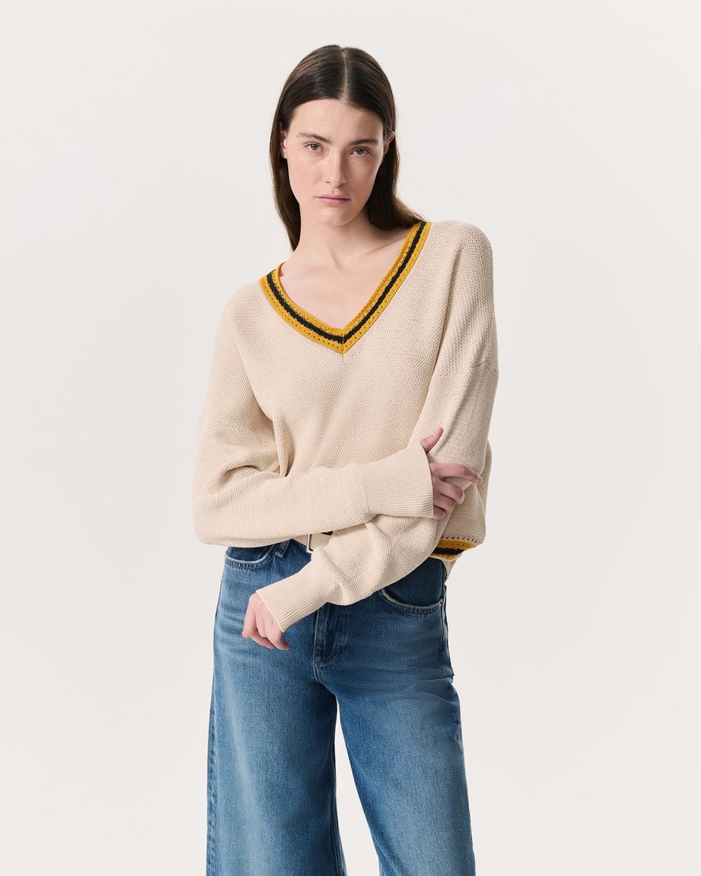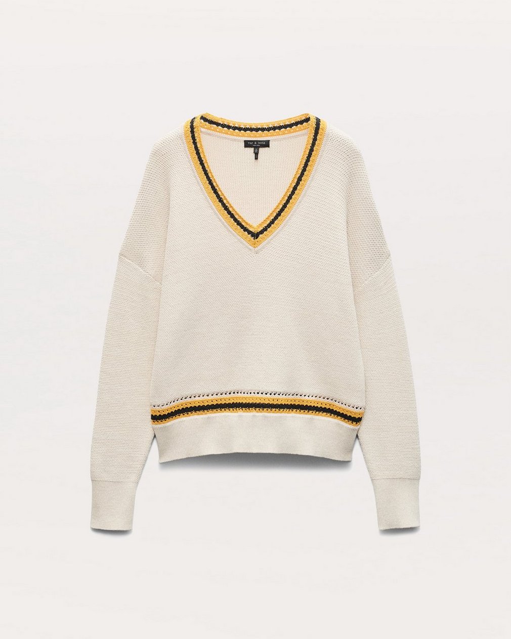 Meghan Striped Crochet-Trim V-Neck Sweater – Ivory